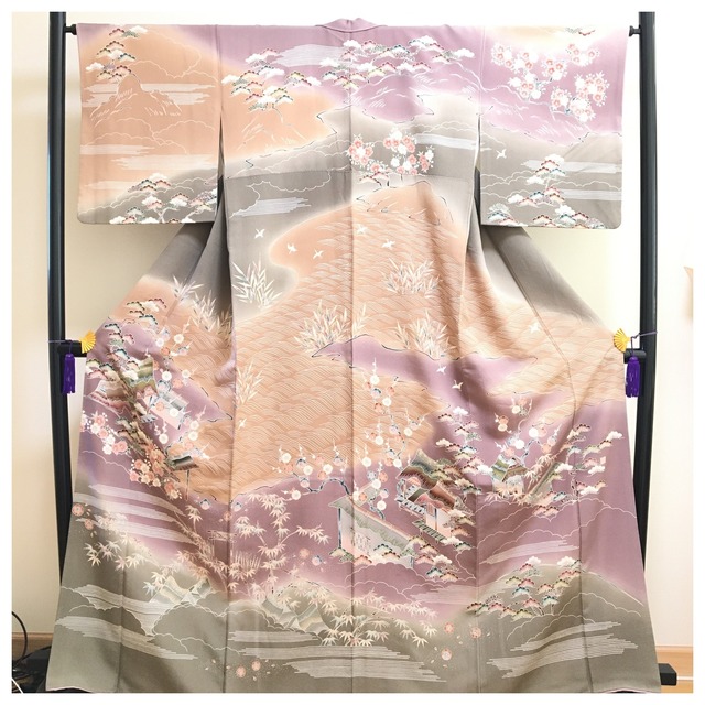 正絹 訪問着 アンティーク 紋無 薄いグレー 身丈160 裄64 リサイクル着物