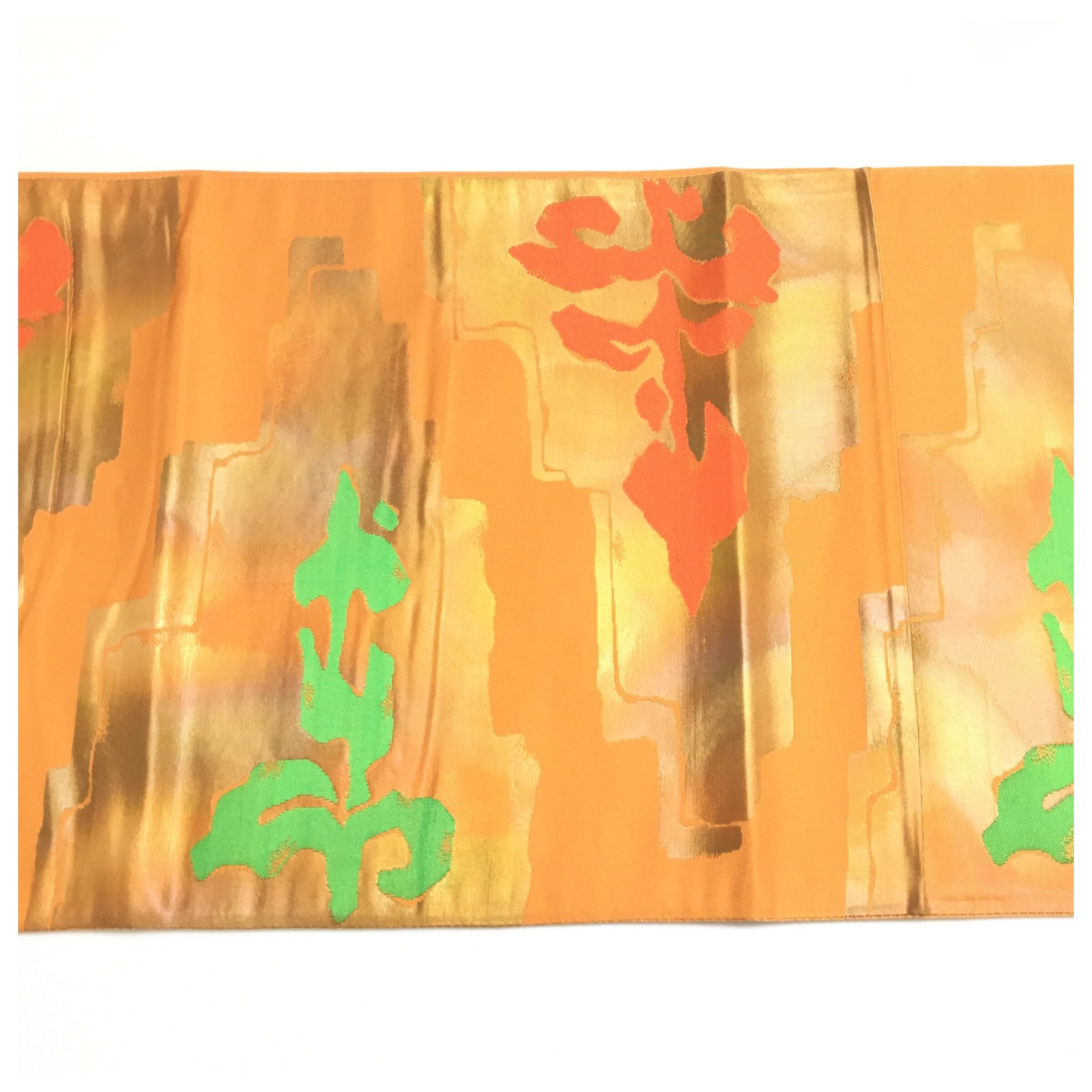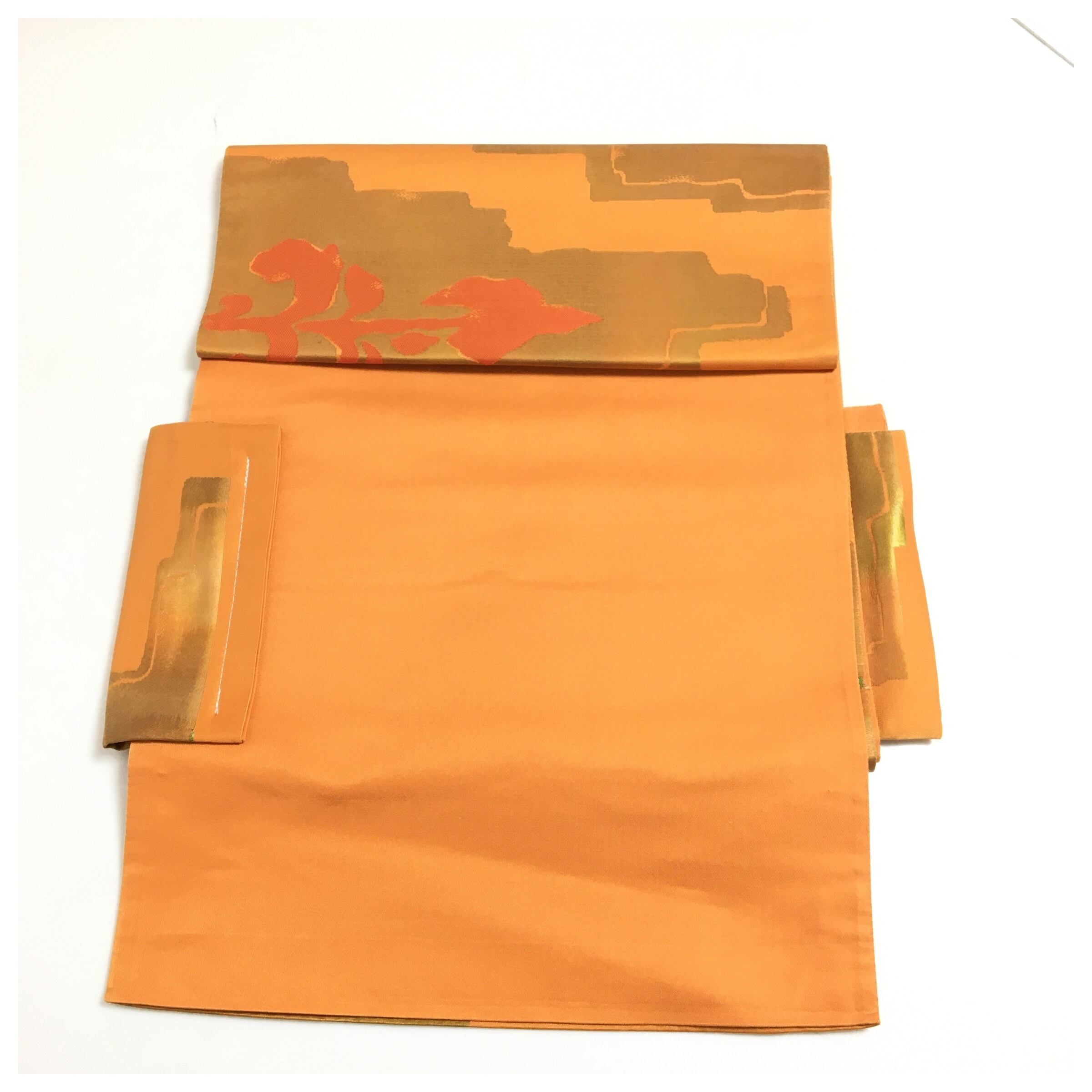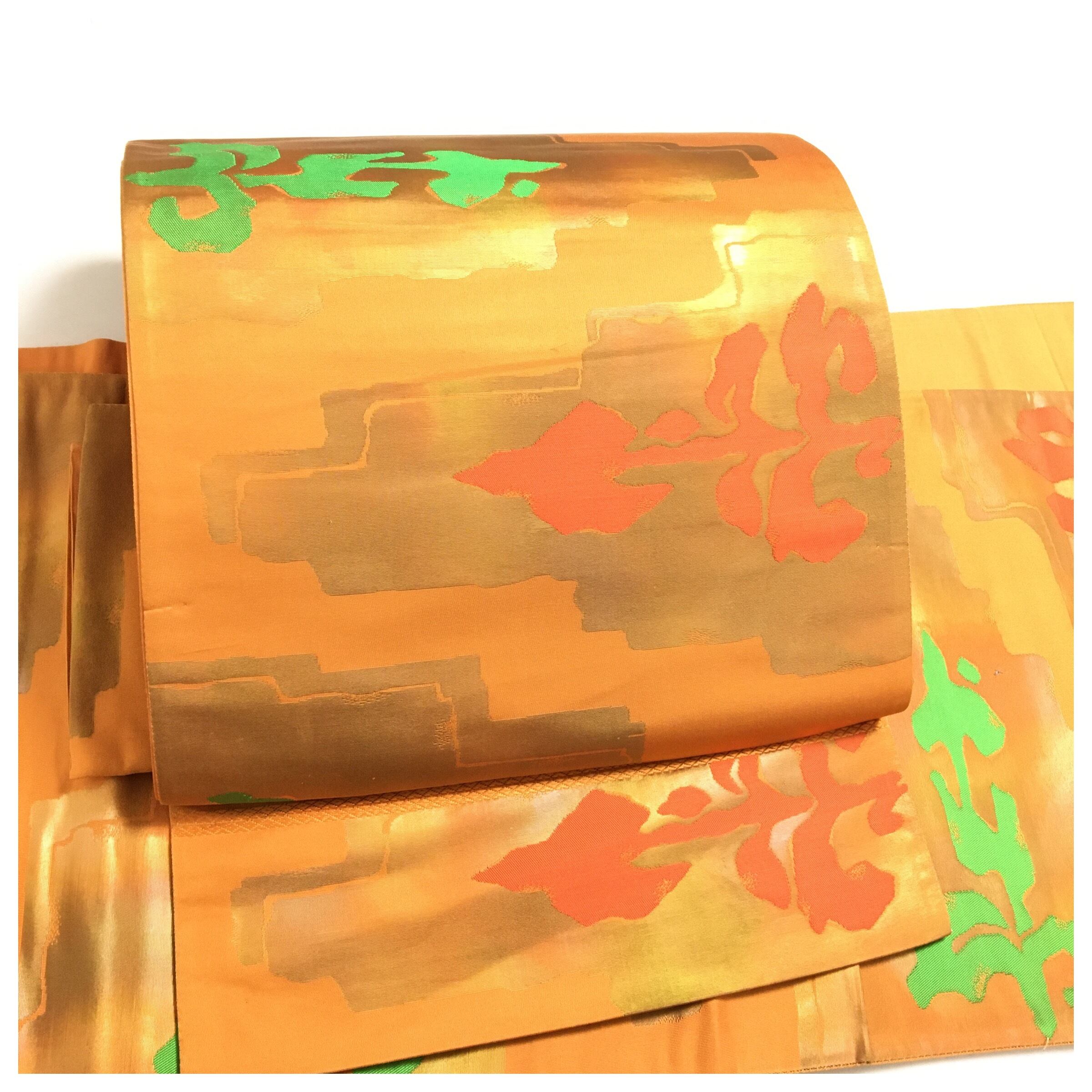 正絹 袋帯 二部式 アンティーク 橙 幾何学模様 二重太鼓 作り帯 です。