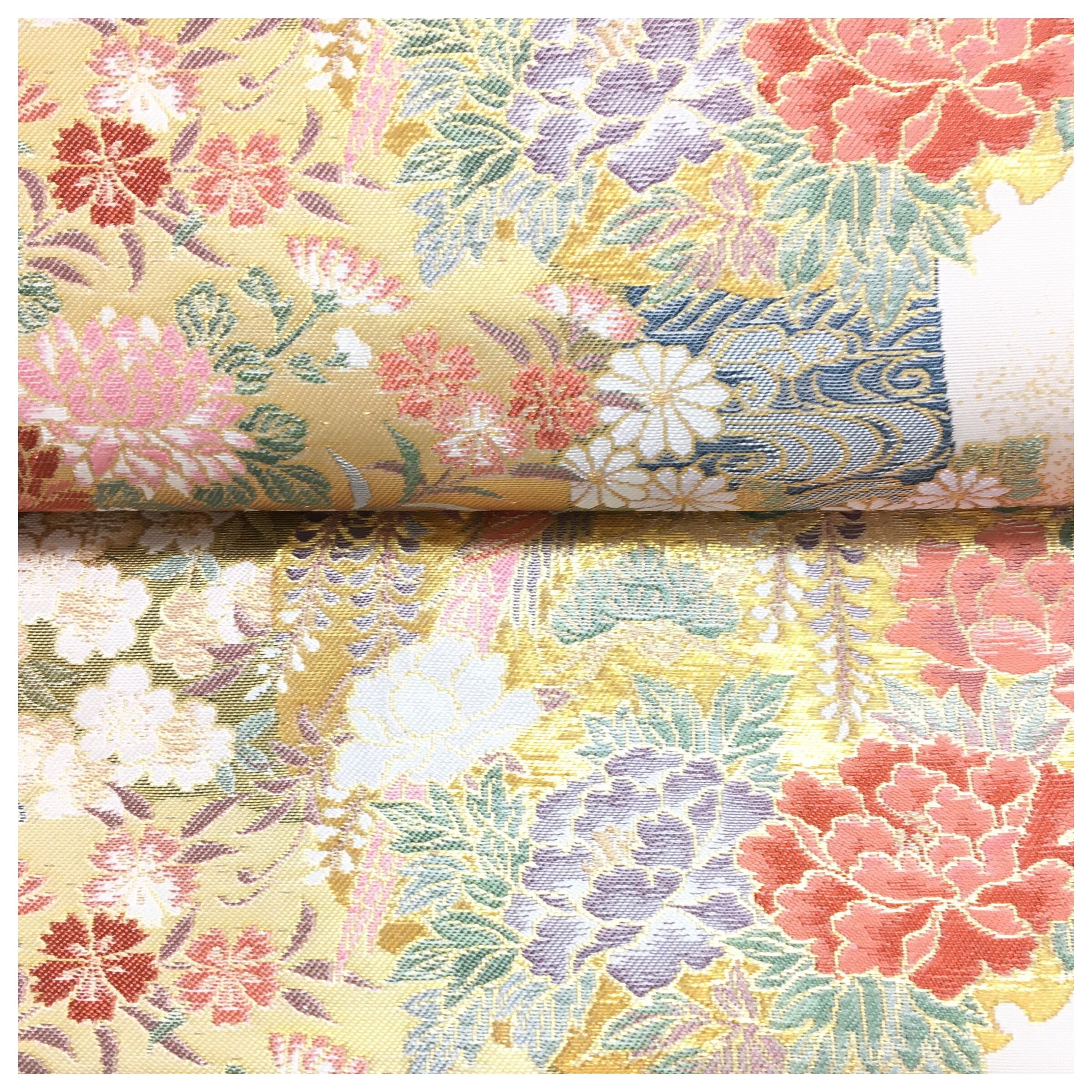 美品 正絹 袋帯 高級呉服 クリーム 鳥 華 二部式 二重太鼓 作り帯 です。