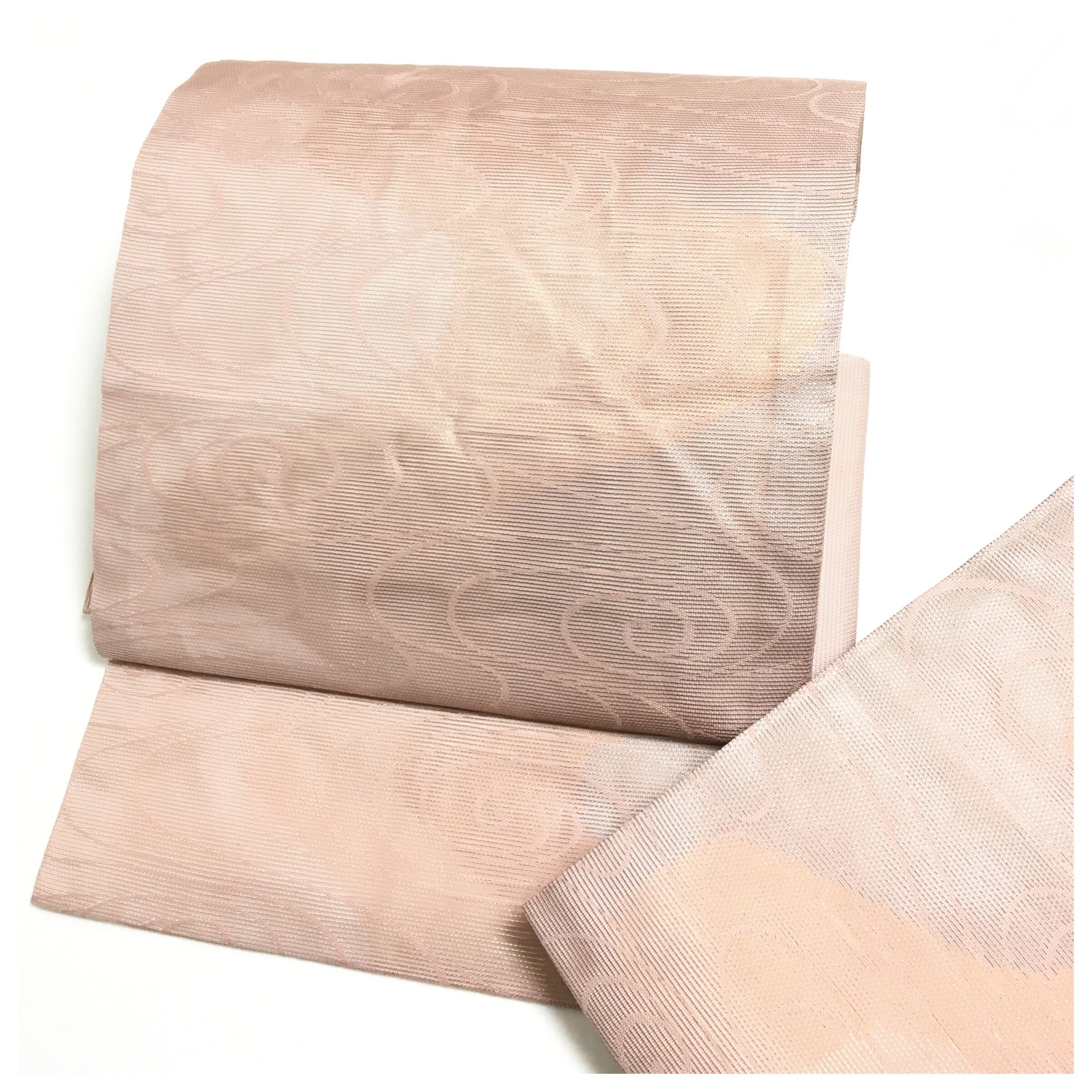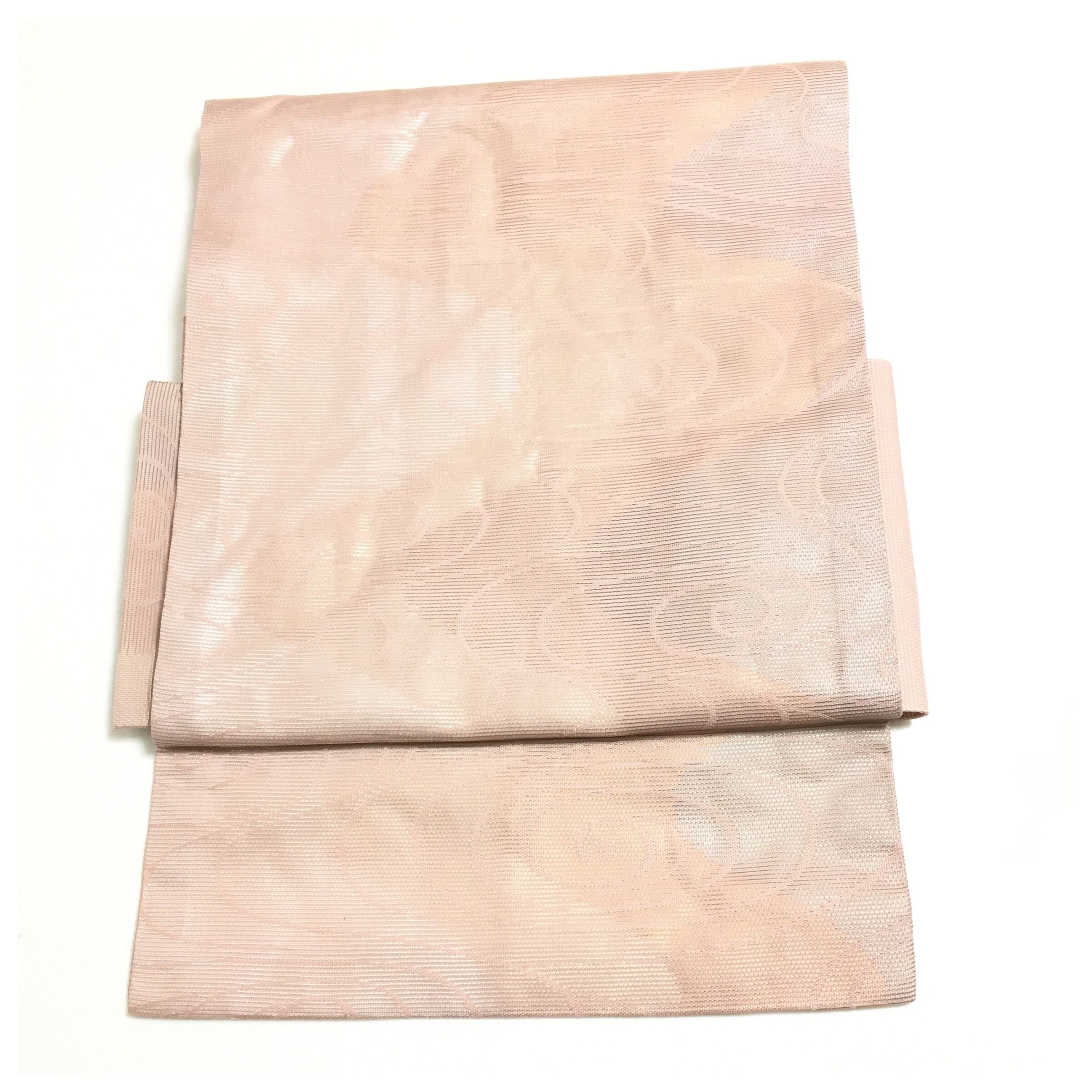 薄いピンク色が上品な色味で渦模様をデザインした涼し気な夏帯です。