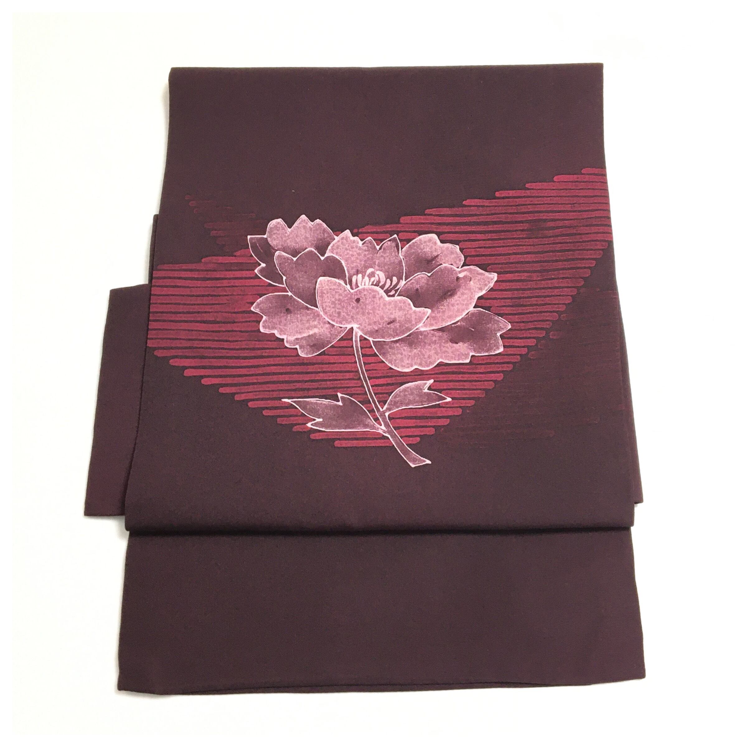 上品な小豆色に華模様の、艶ややで締まりが良い塩瀬の帯です。