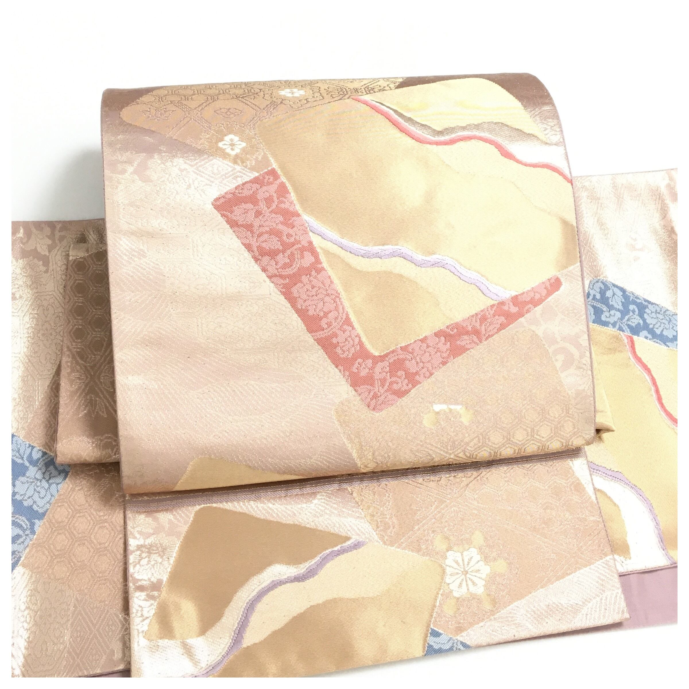 美品 正絹 袋帯 ピンク紫 金彩 角紋 二部式 二重太鼓 作り帯 です。