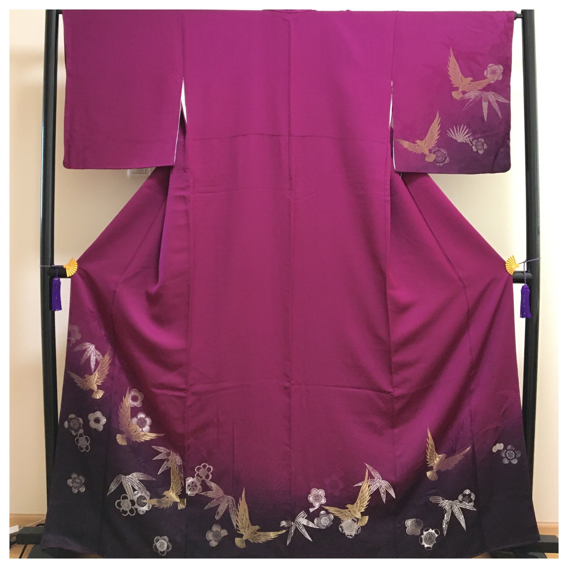 発色の鮮やかな紫色に裾に広がる黒地、三才鳥が目を惹くデザインです。