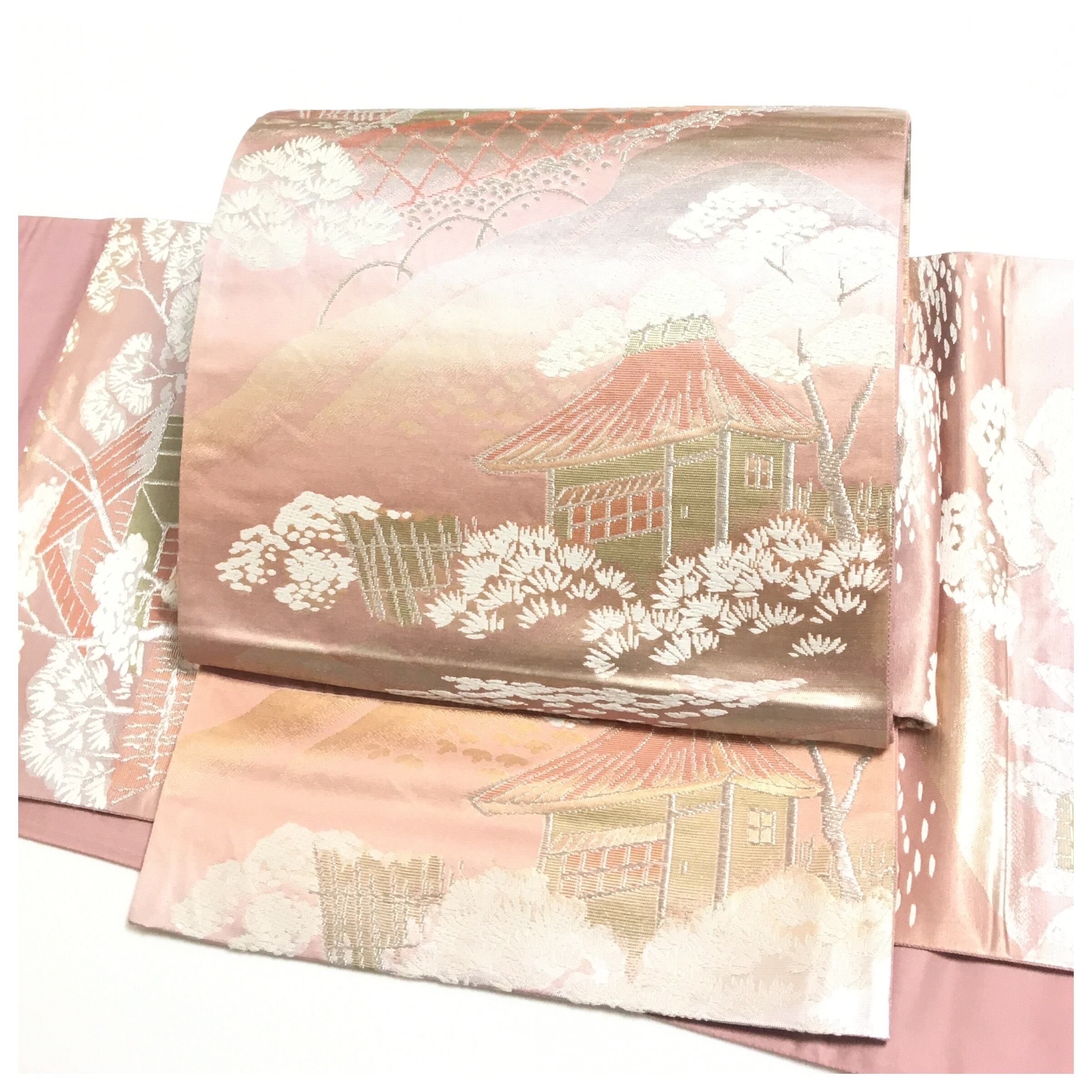 正絹 楽帯 袋帯 ピンク 銀彩 風景柄 二部式 二重太鼓 作り帯 です。