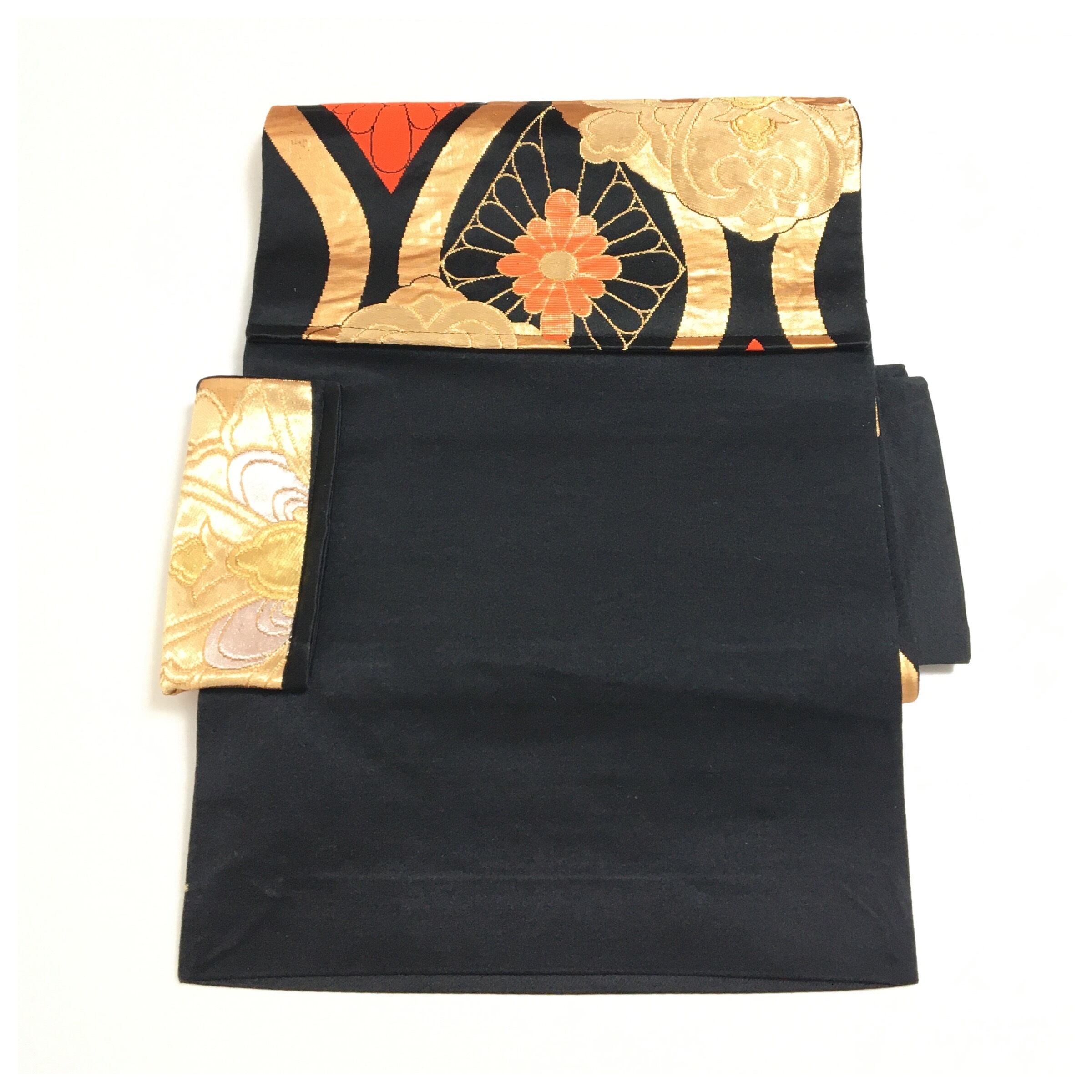 簡単装着 楽帯 正絹 アンティーク 黒 金彩 大花模様 袋帯 二部式 作り帯 です。