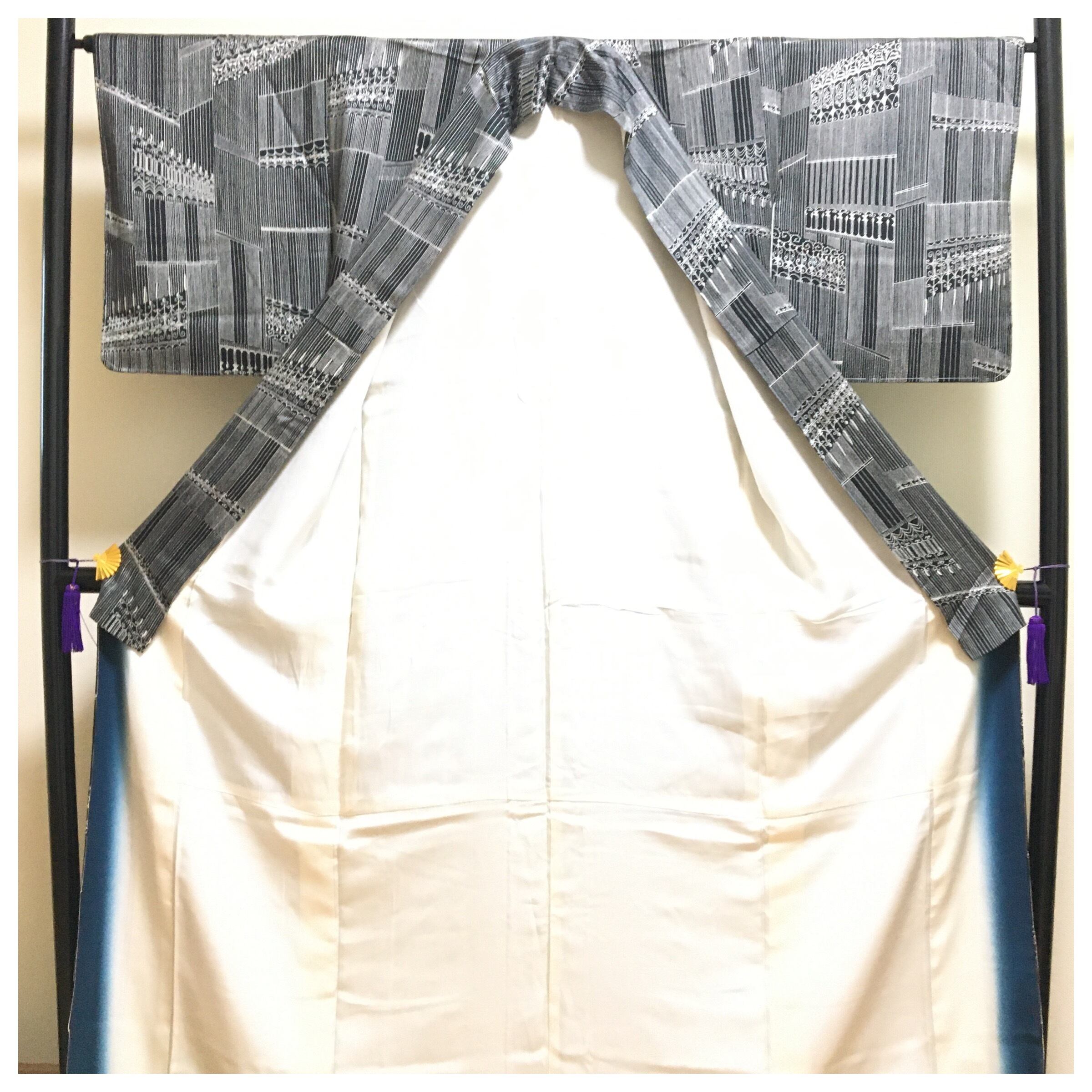 美品 大サイズ モノトーン モダン 小紋 正絹 身丈165 裄65.5 リサイクル着物 です。