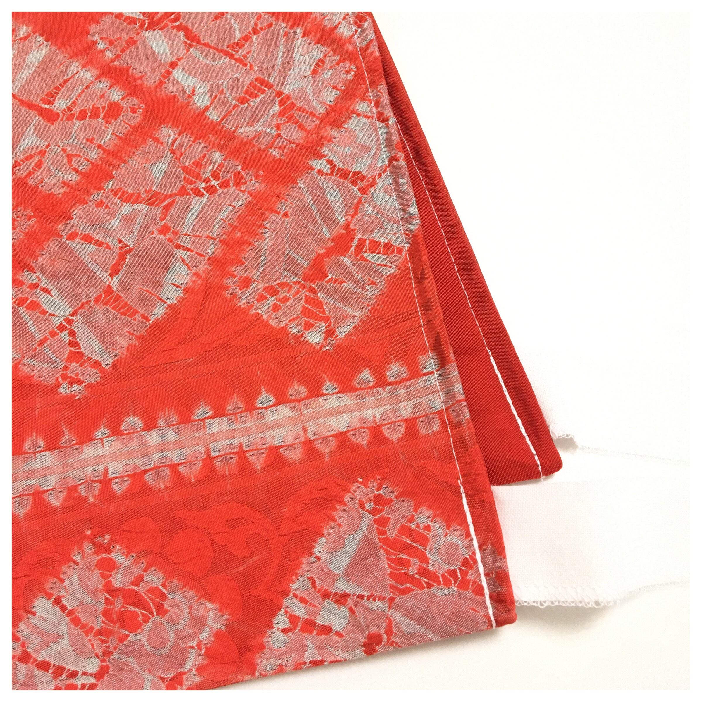 美品 正絹 袋帯 染め絞り 赤 お洒落 赤 二部式 二重太鼓 作り帯 です。