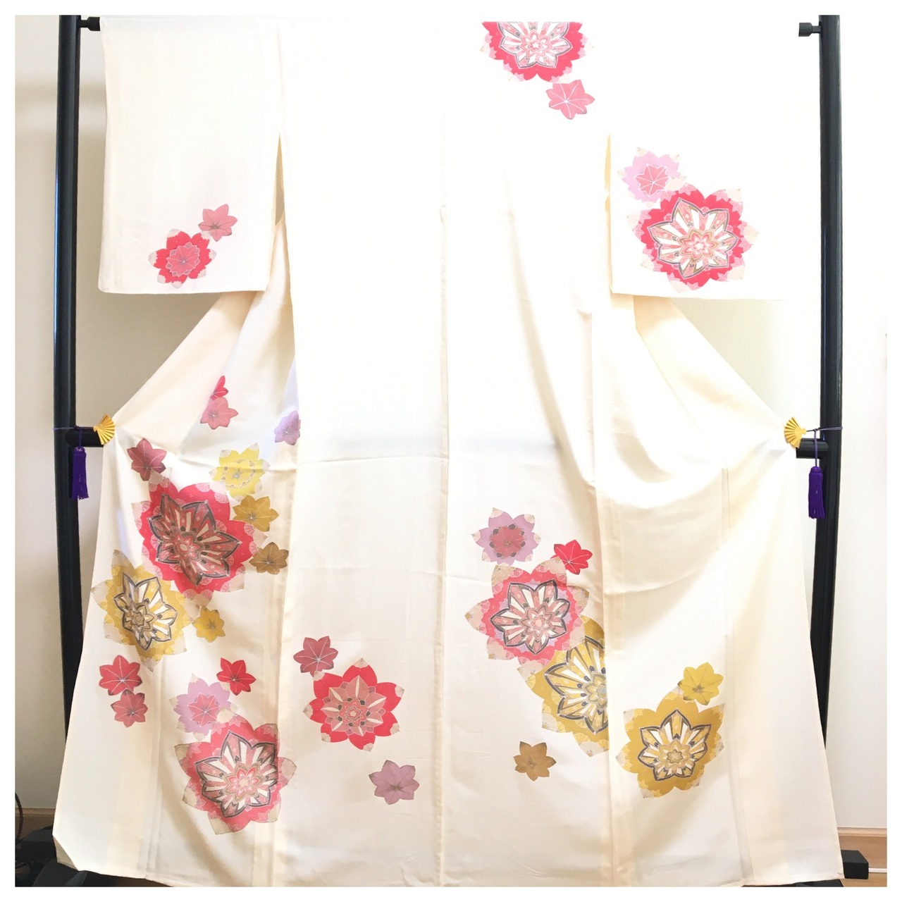正絹 訪問着 単衣仕立て 紋無 華紋 クリーム 身丈162 裄64 リサイクル着物 です。