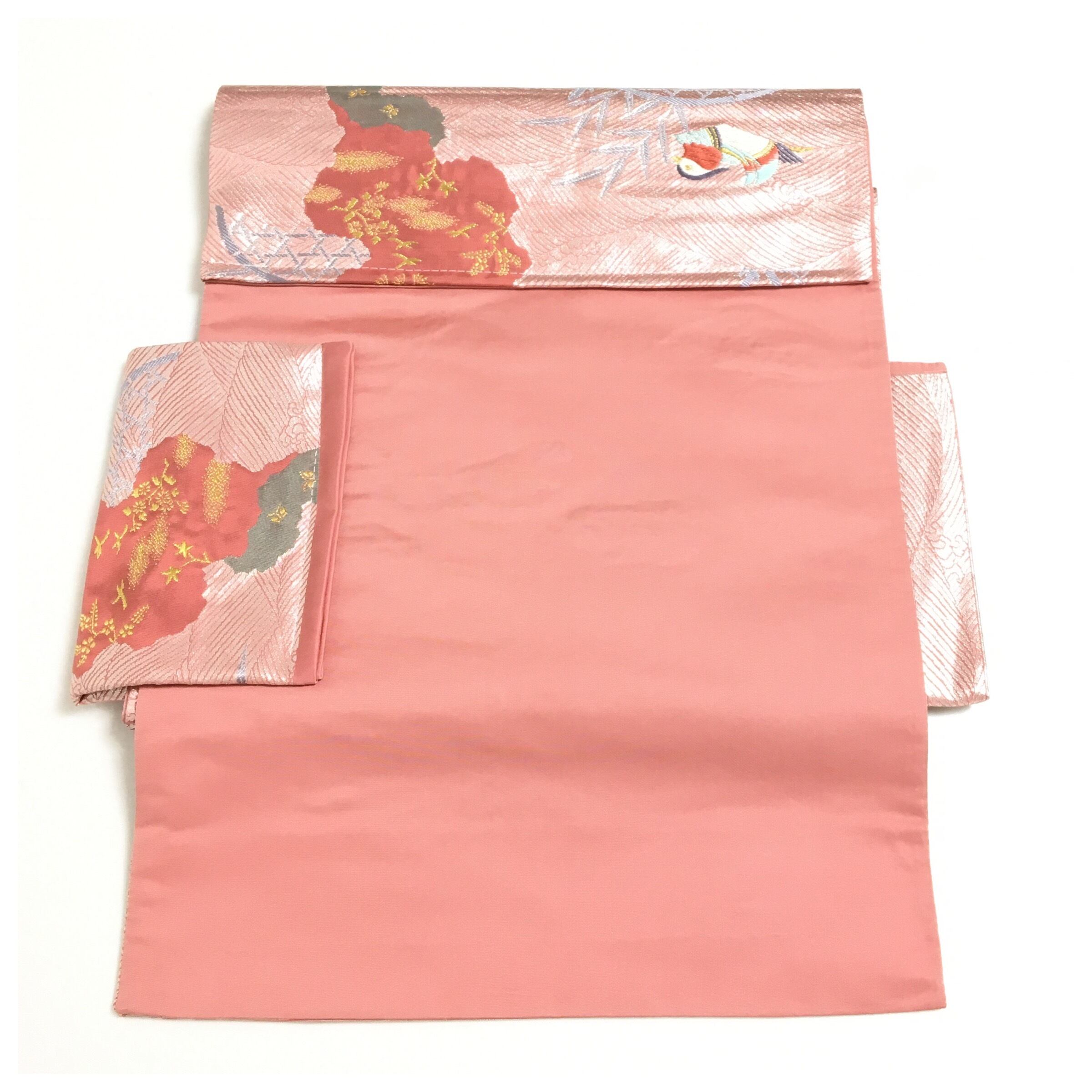 美品 正絹 楽帯 ピンク 鴛鴦 二部式 二重太鼓 作り帯 です。