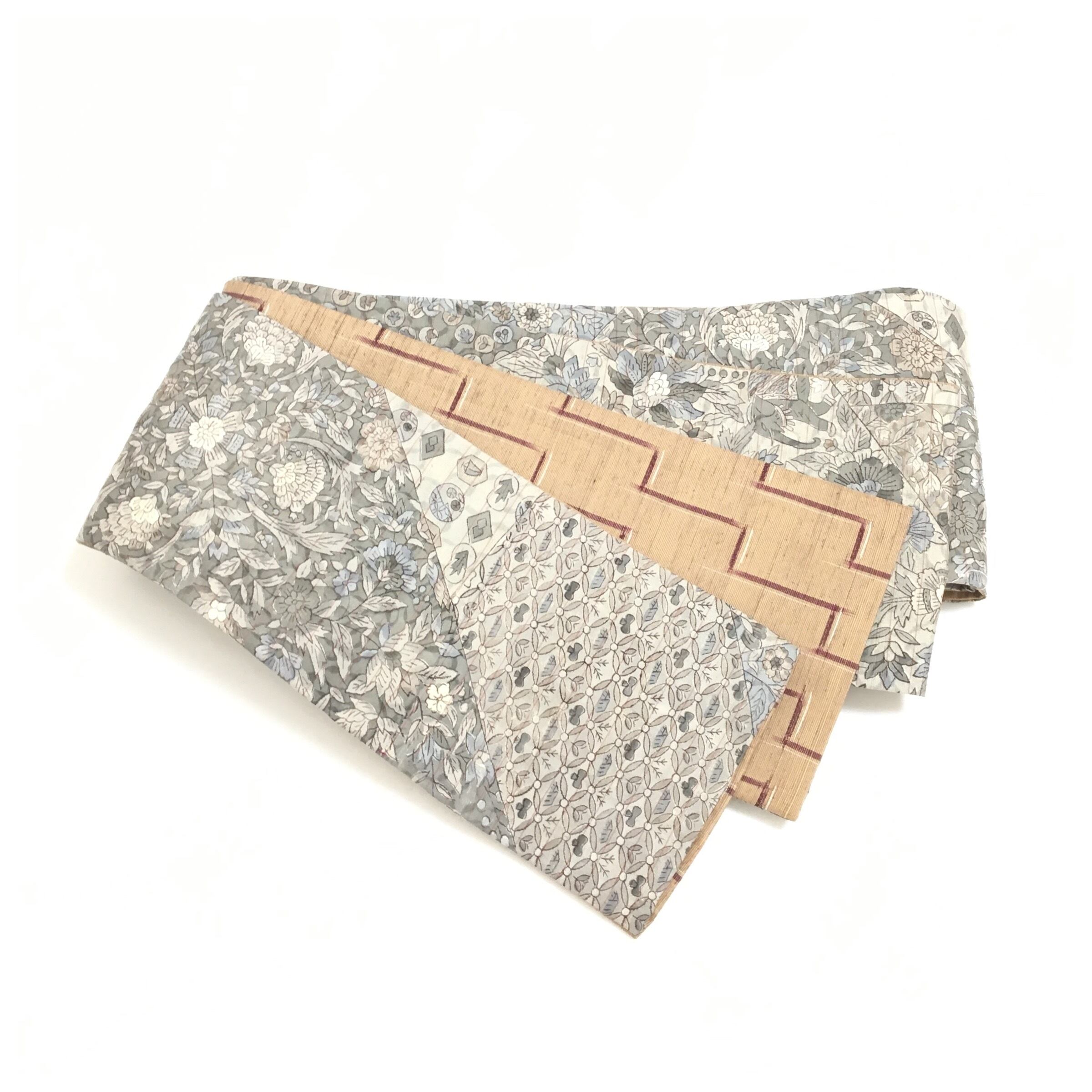 上質 正絹 半幅帯 お洒落更紗 グレーx茶 紬 両面違い 長さ480 幅14.5 中古品 です。