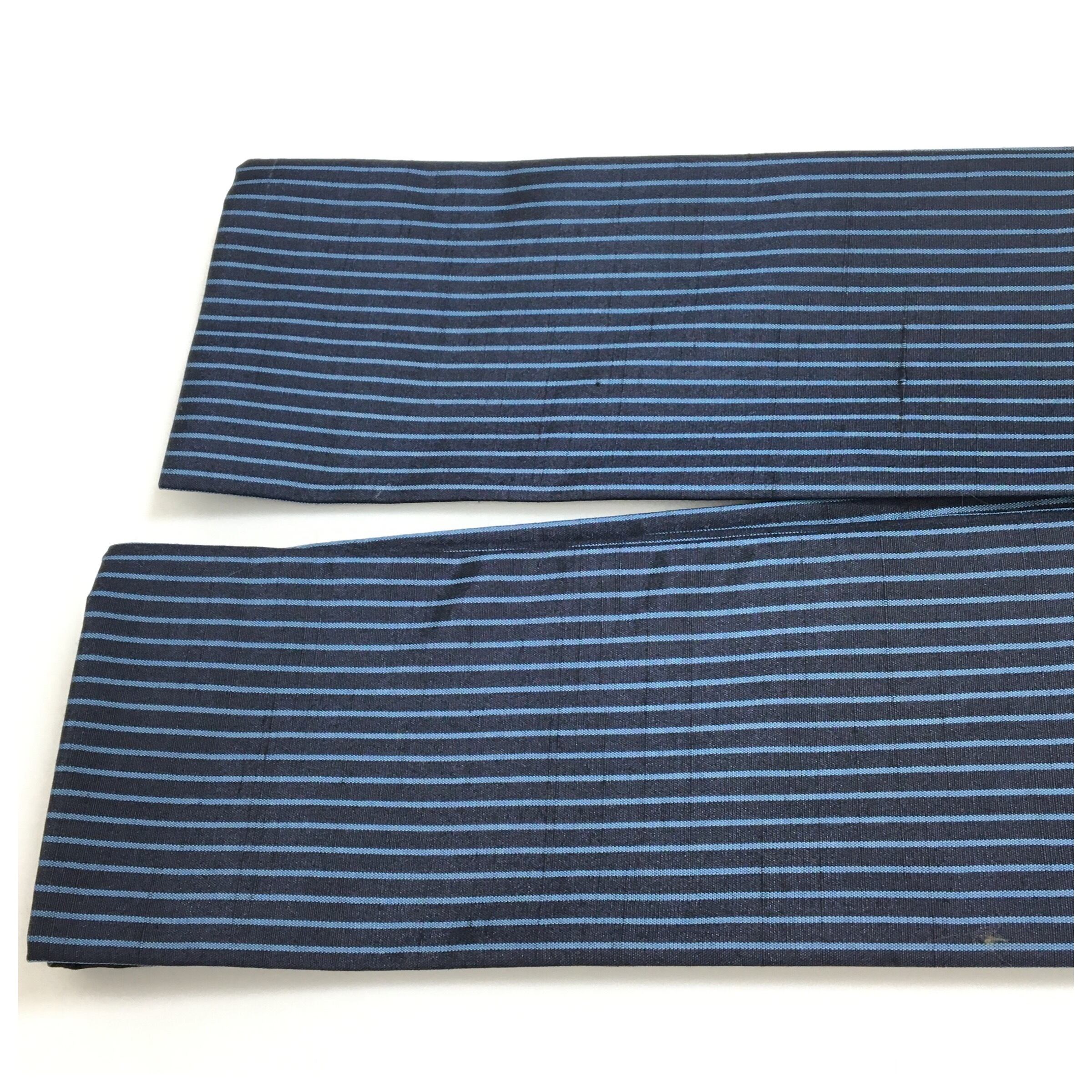 美品 角帯 正絹 男物 紬 縞 青 個性派 全通柄 長さ424