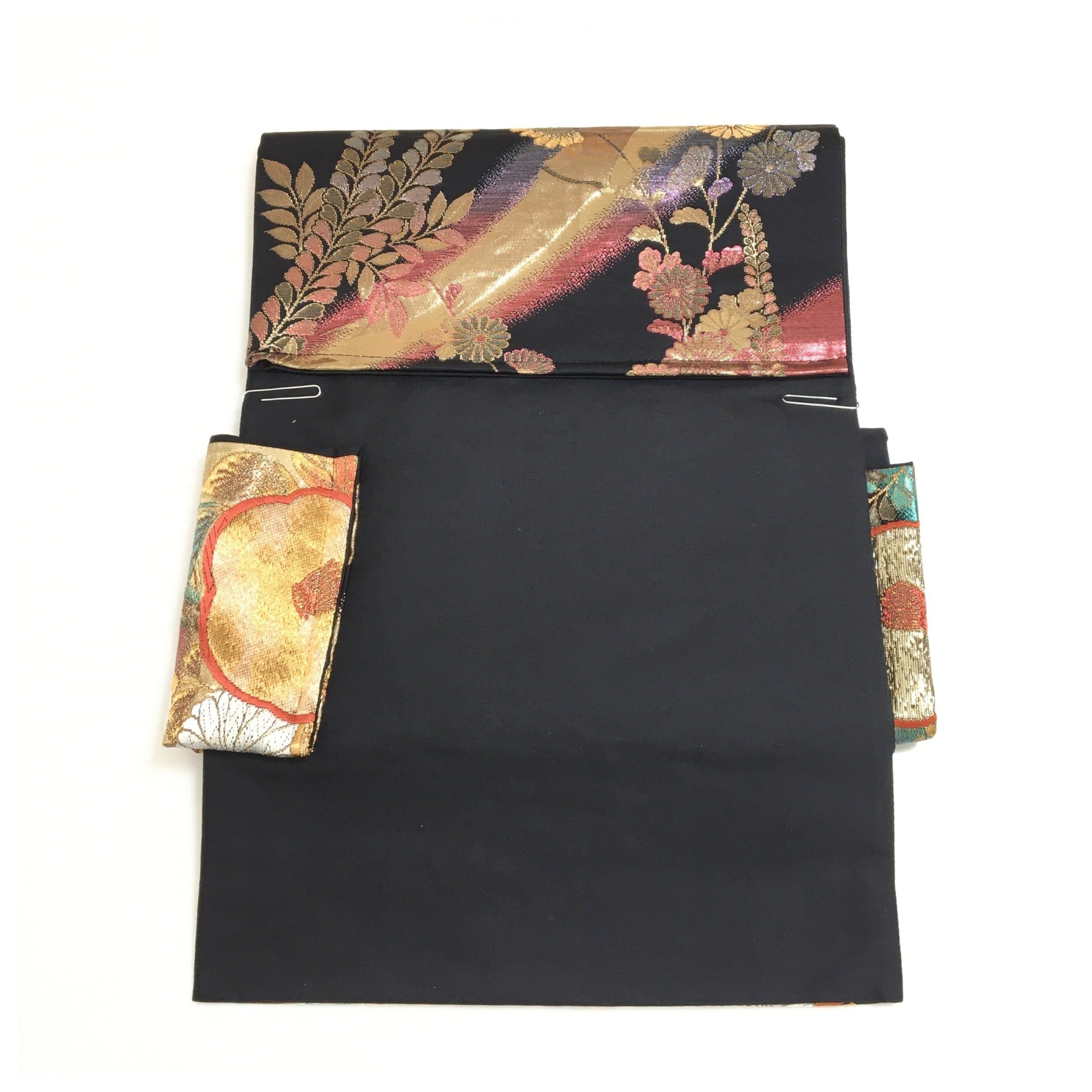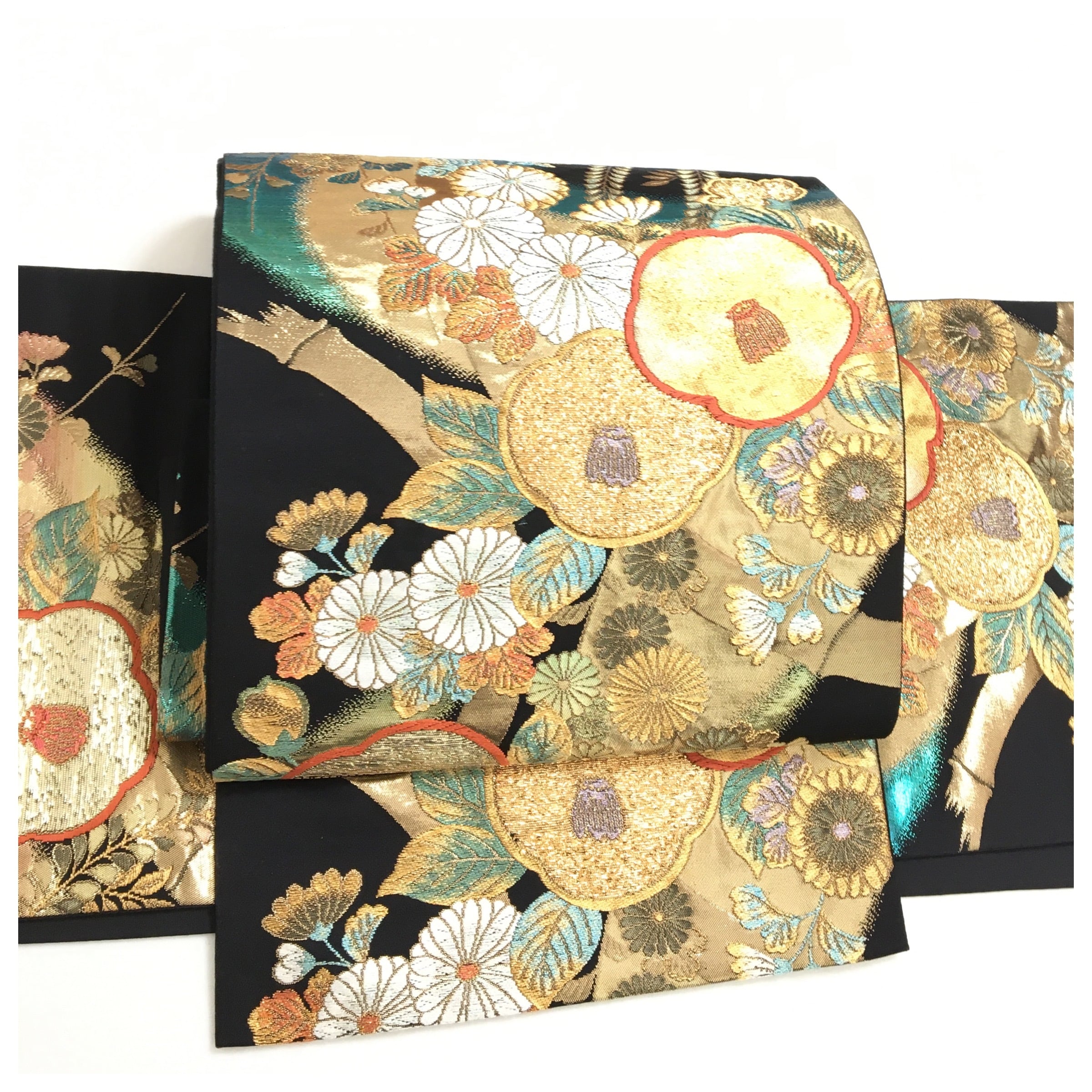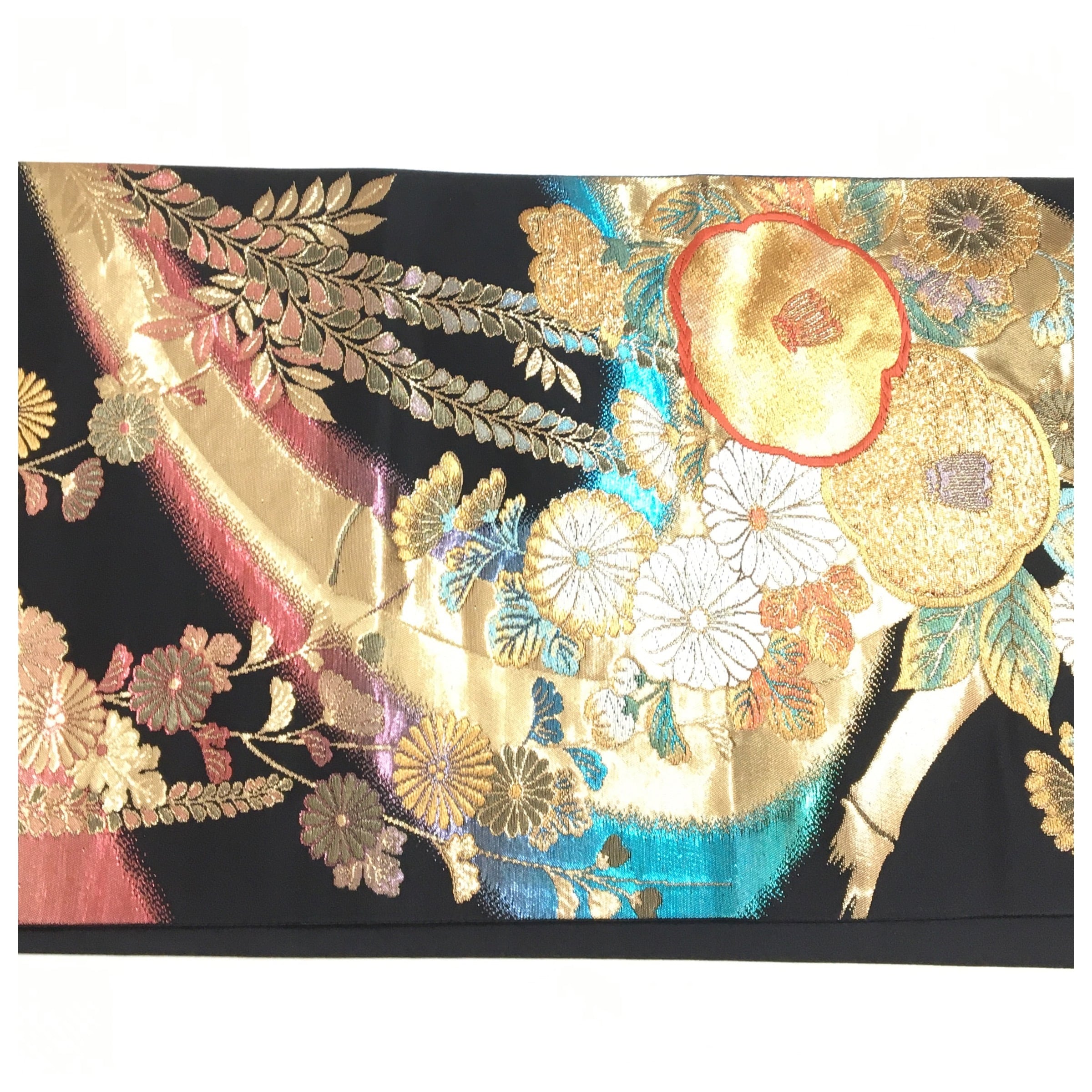 正絹 付け帯 楽帯 黒 金彩 花模様 二部式 二重太鼓 作り帯 です。
