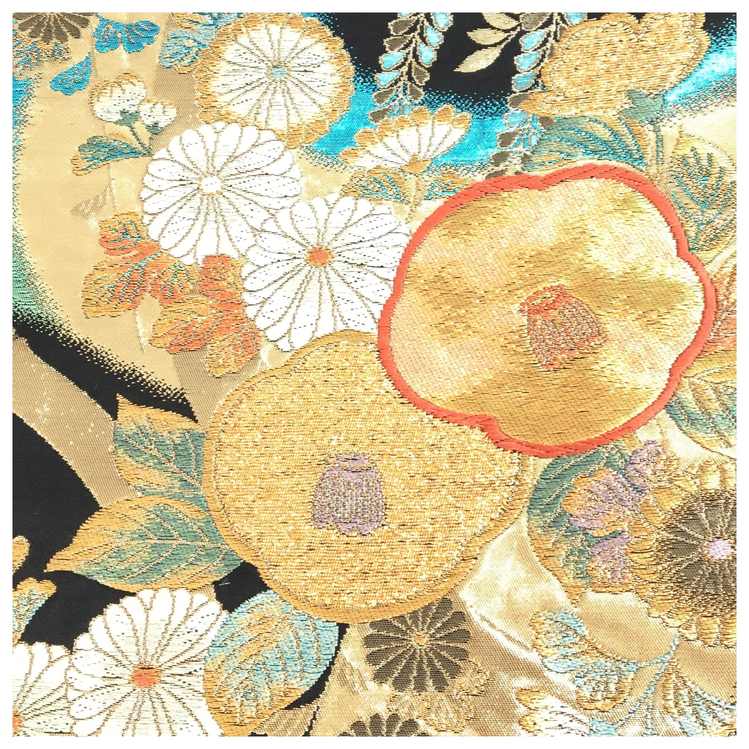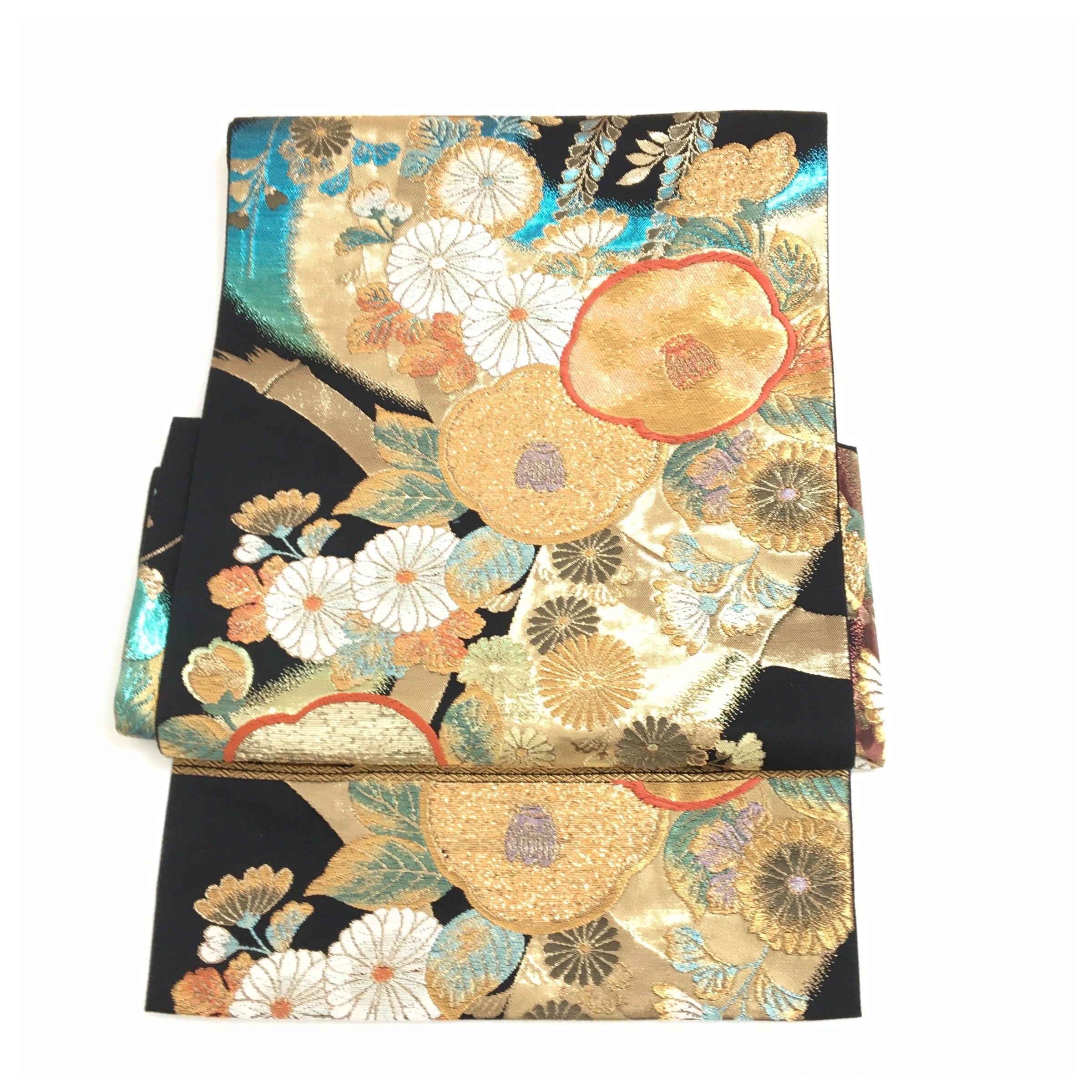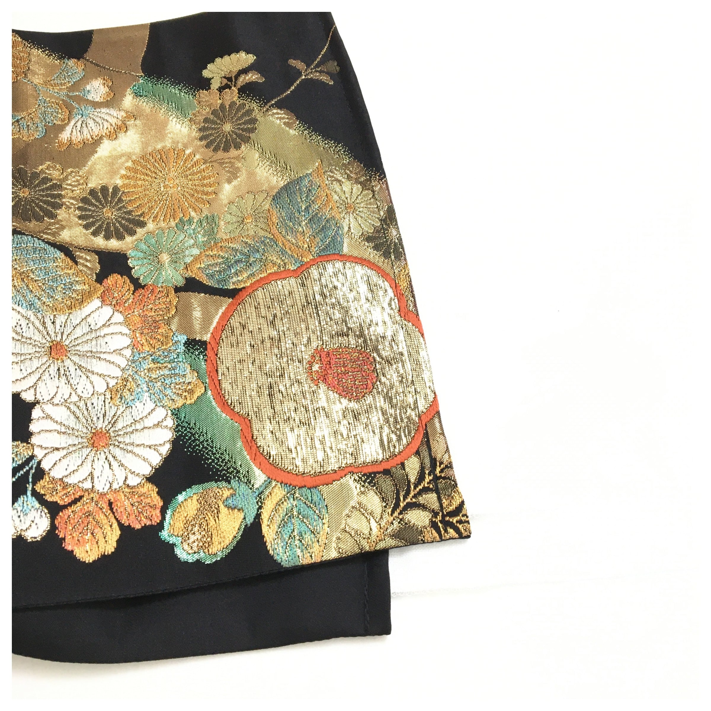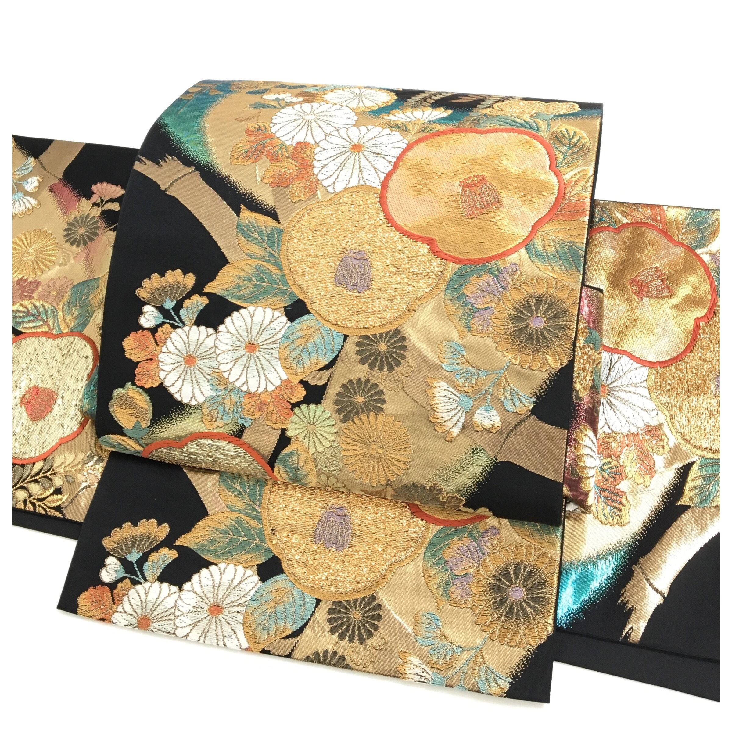 正絹 付け帯 楽帯 黒 金彩 花模様 二部式 二重太鼓 作り帯 です。