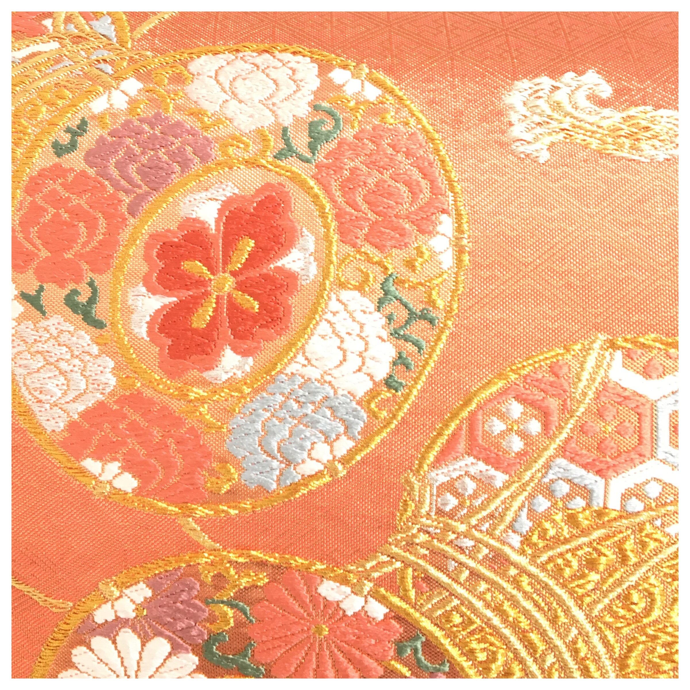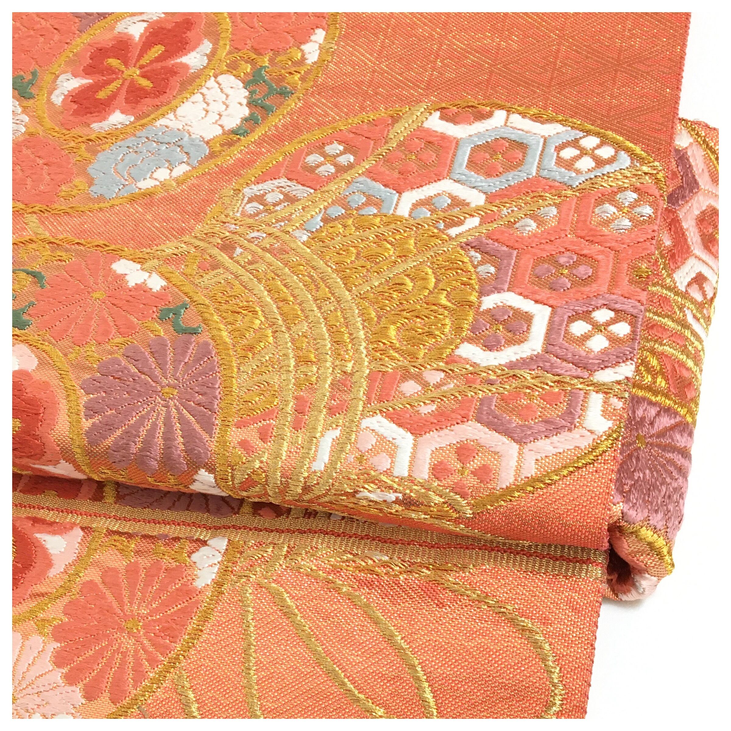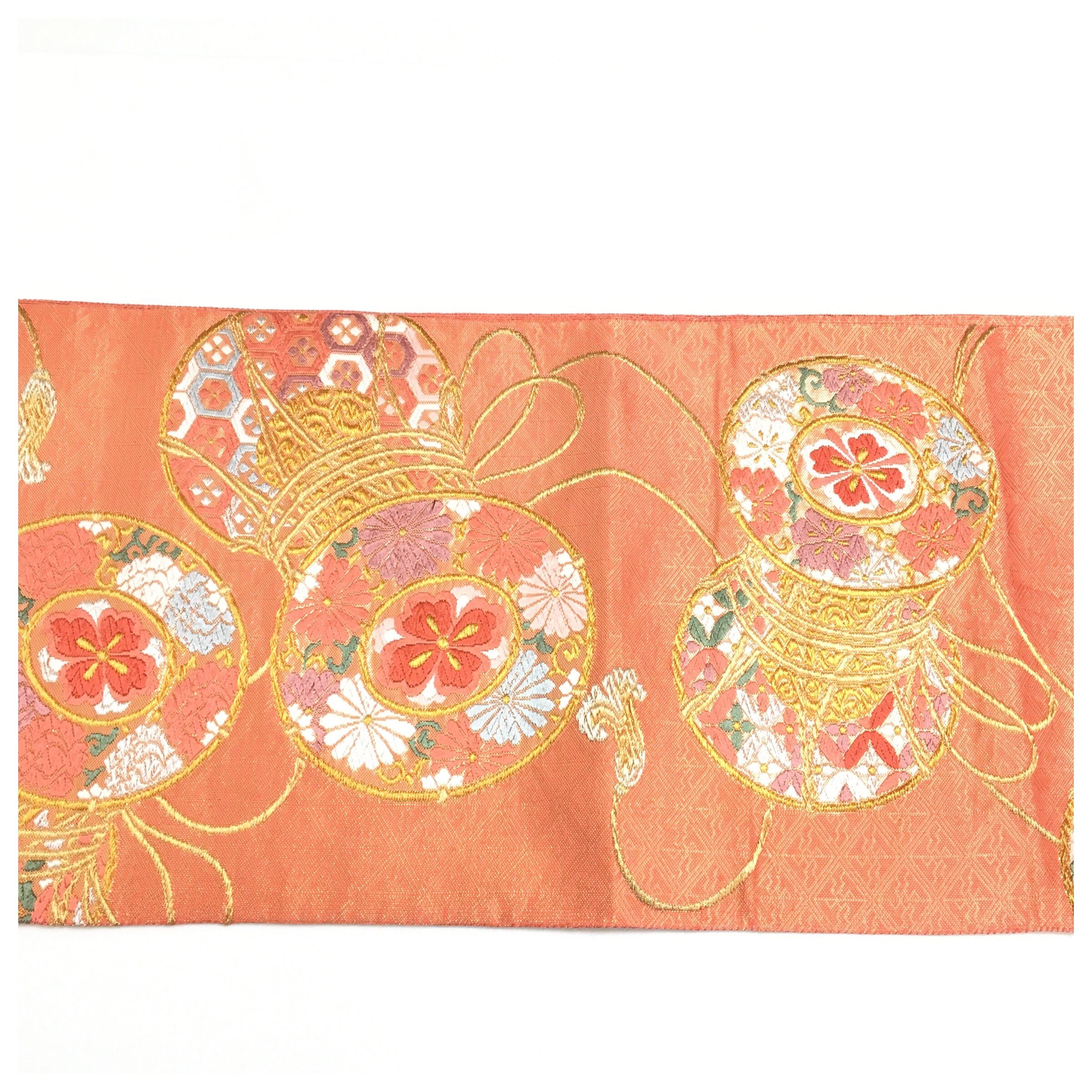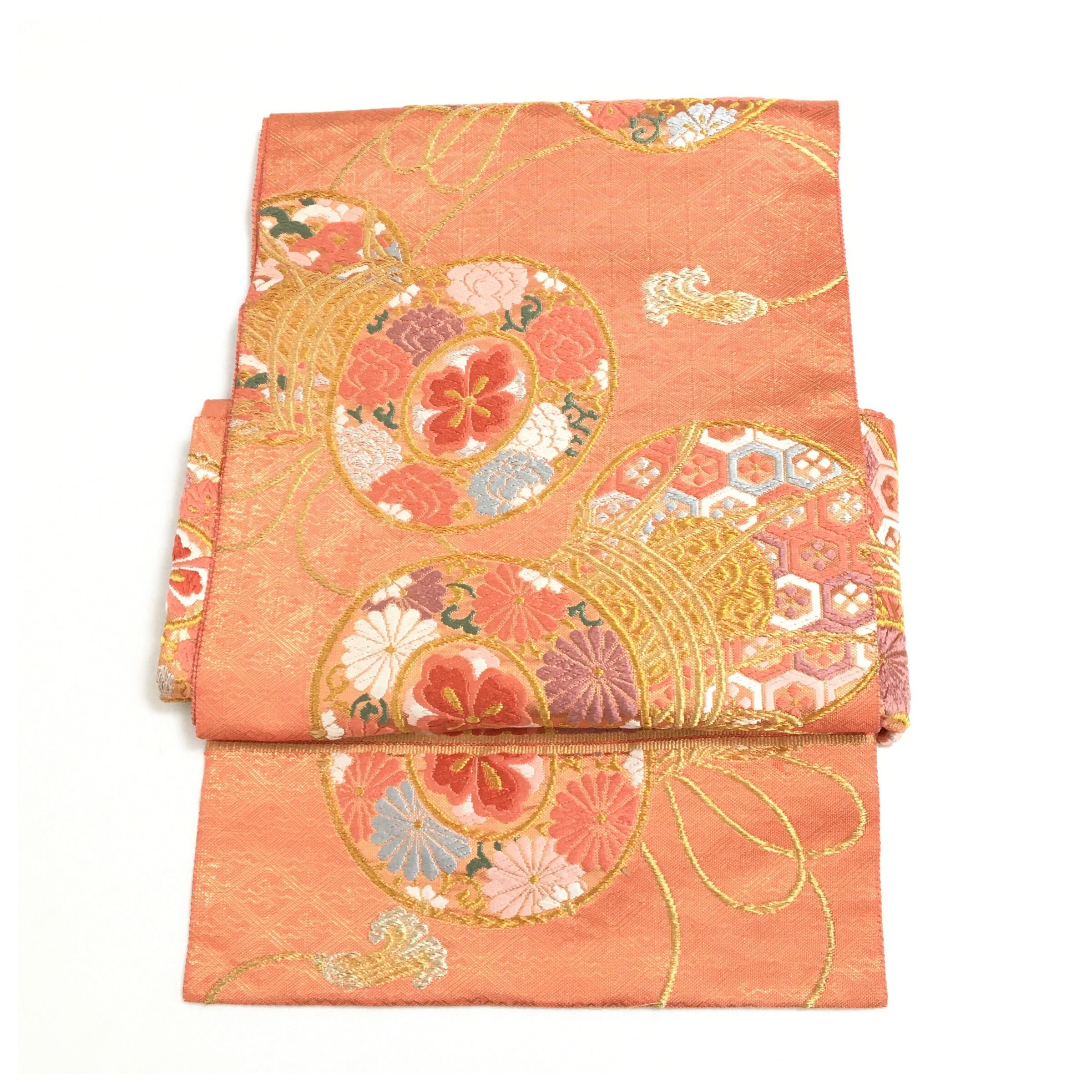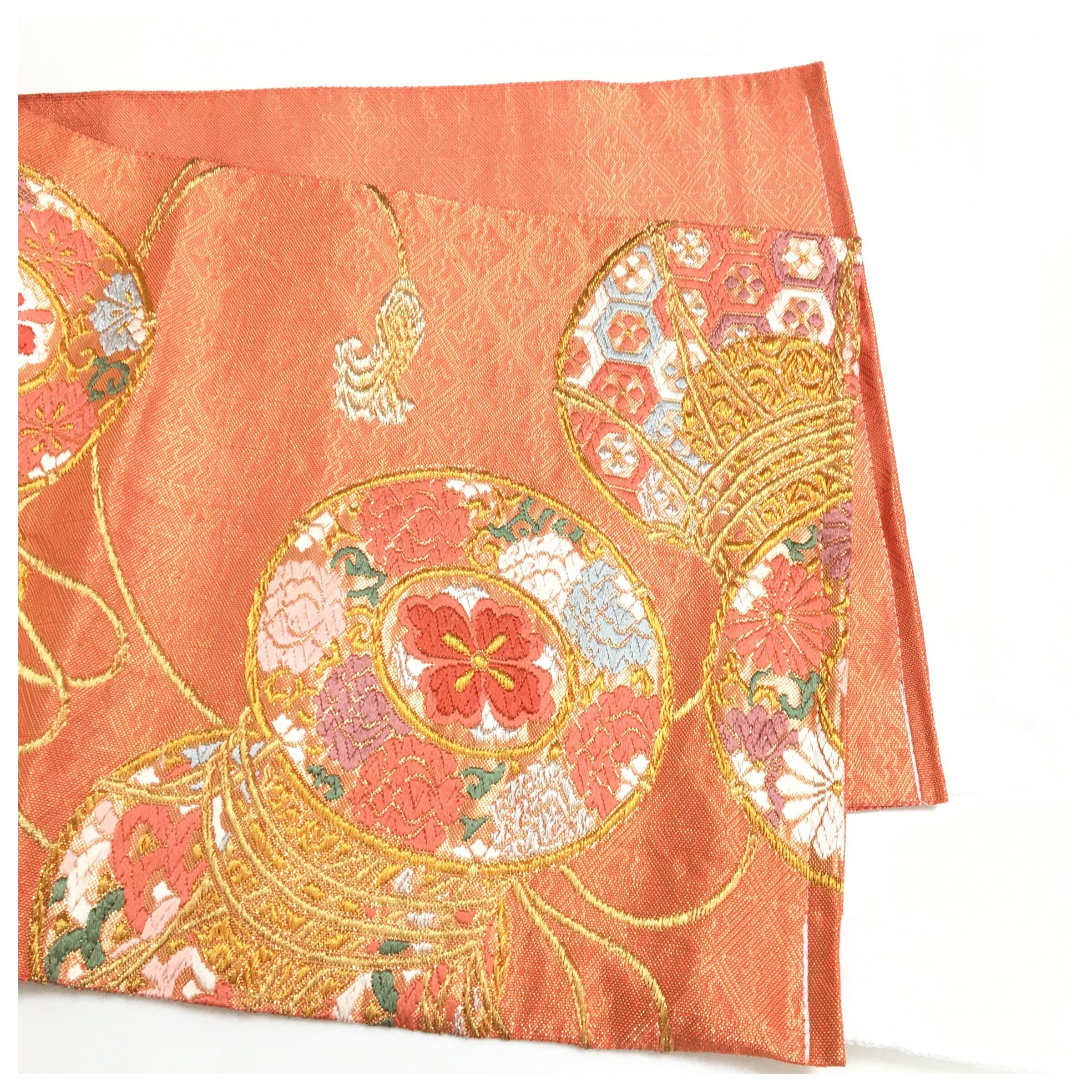 正絹 楽帯 袋帯 サーモンオレンジ 鼓柄 二部式 二重太鼓 作り帯 です。