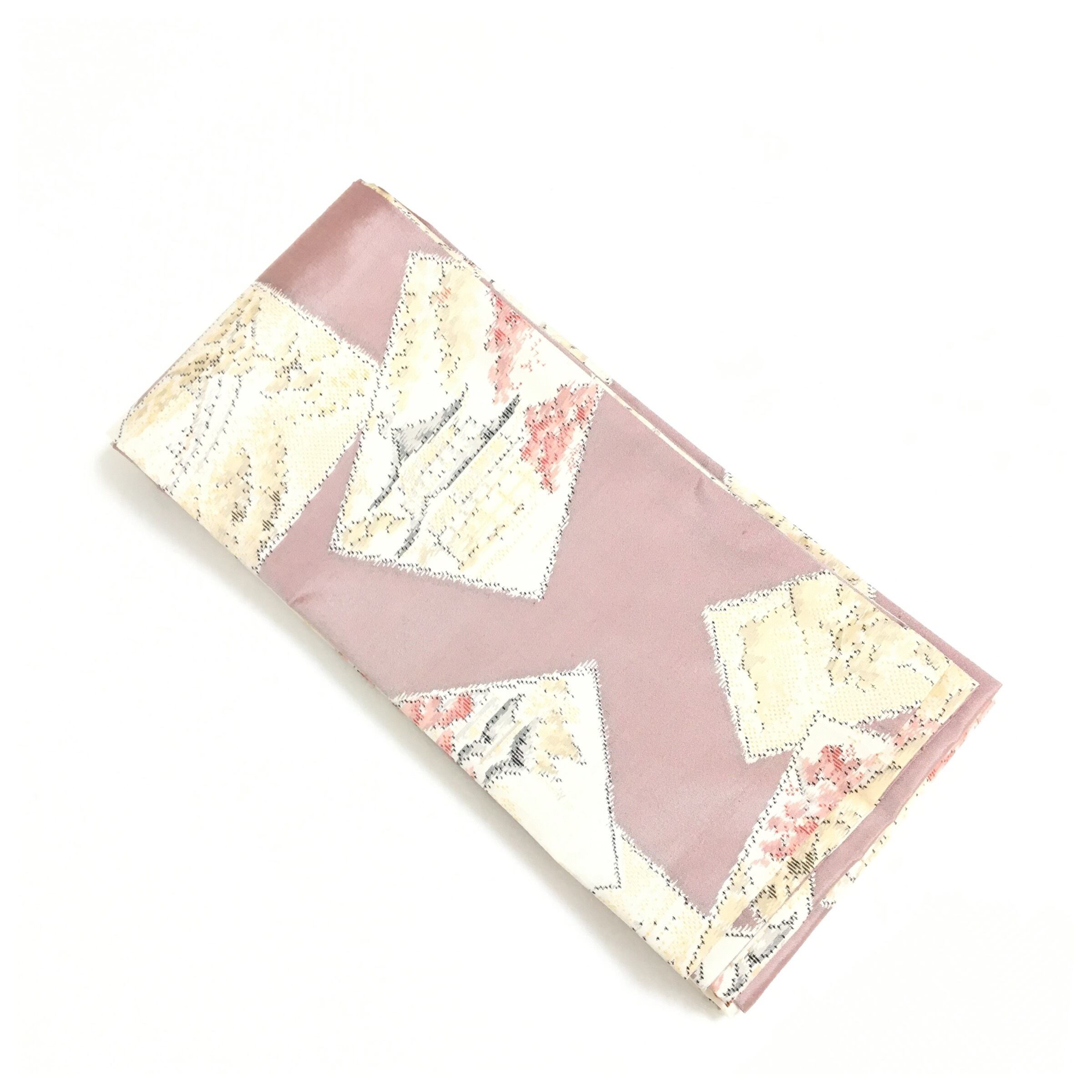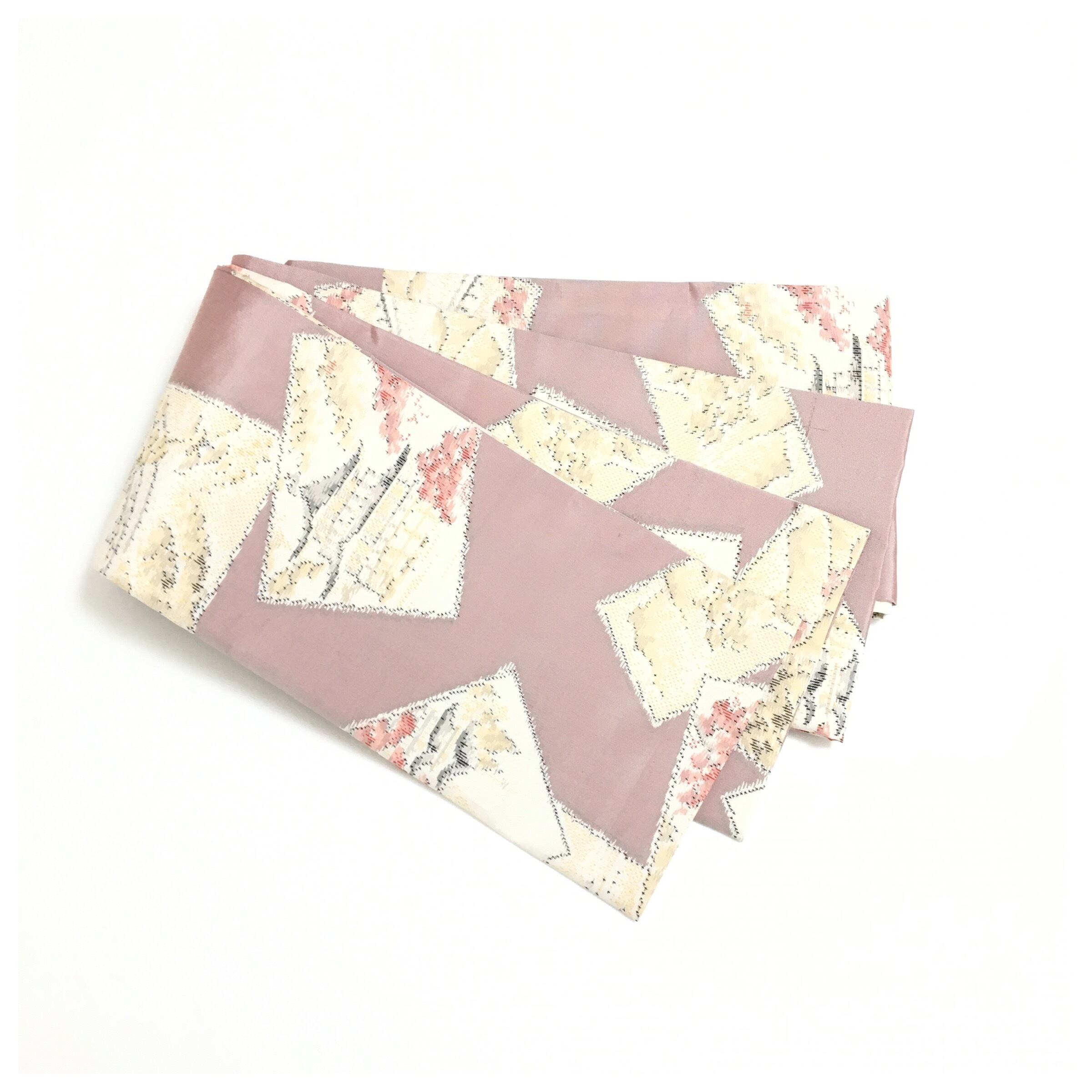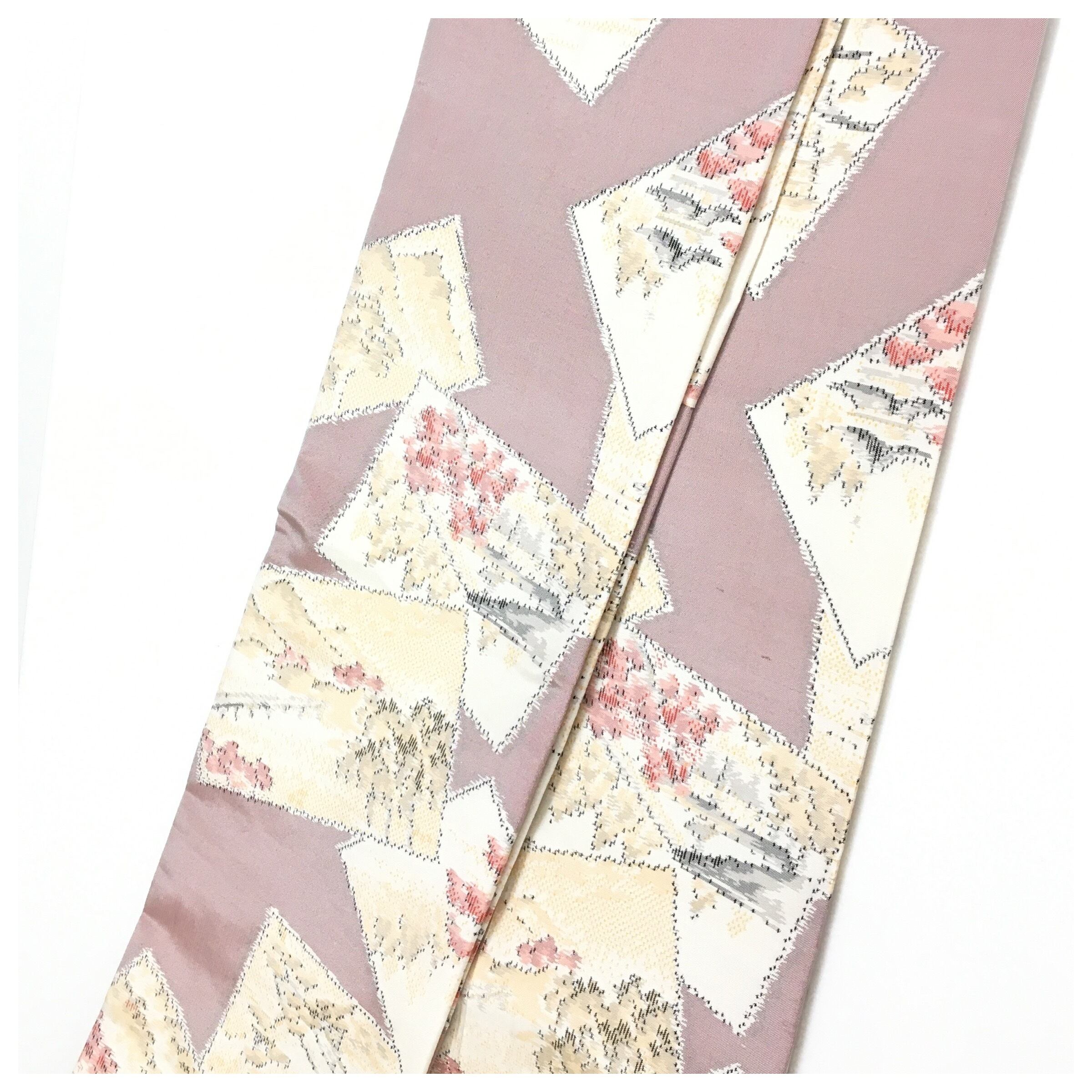 正絹 紬 半幅帯 渋いピンク 風景柄 個性派 長尺428 中古品 です。