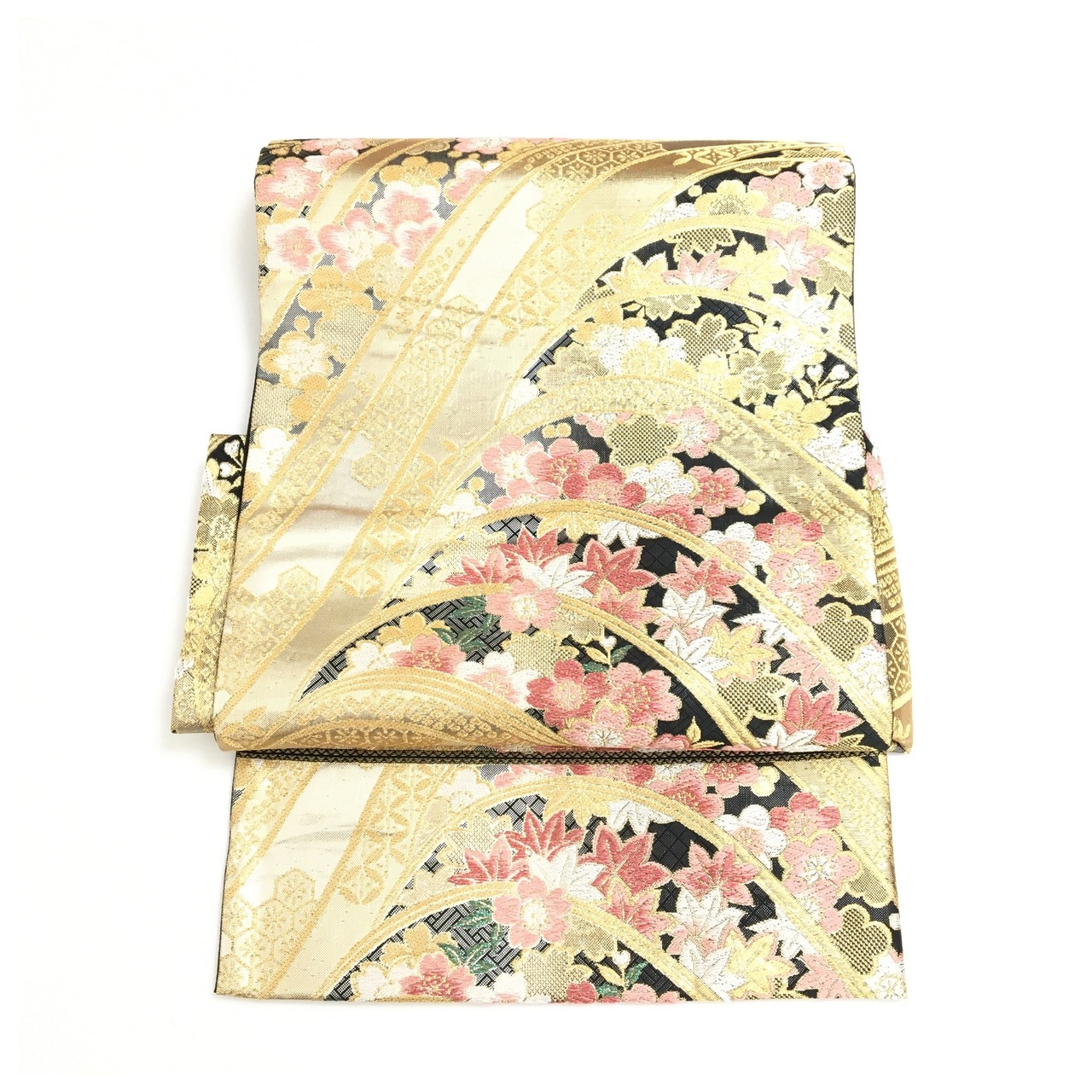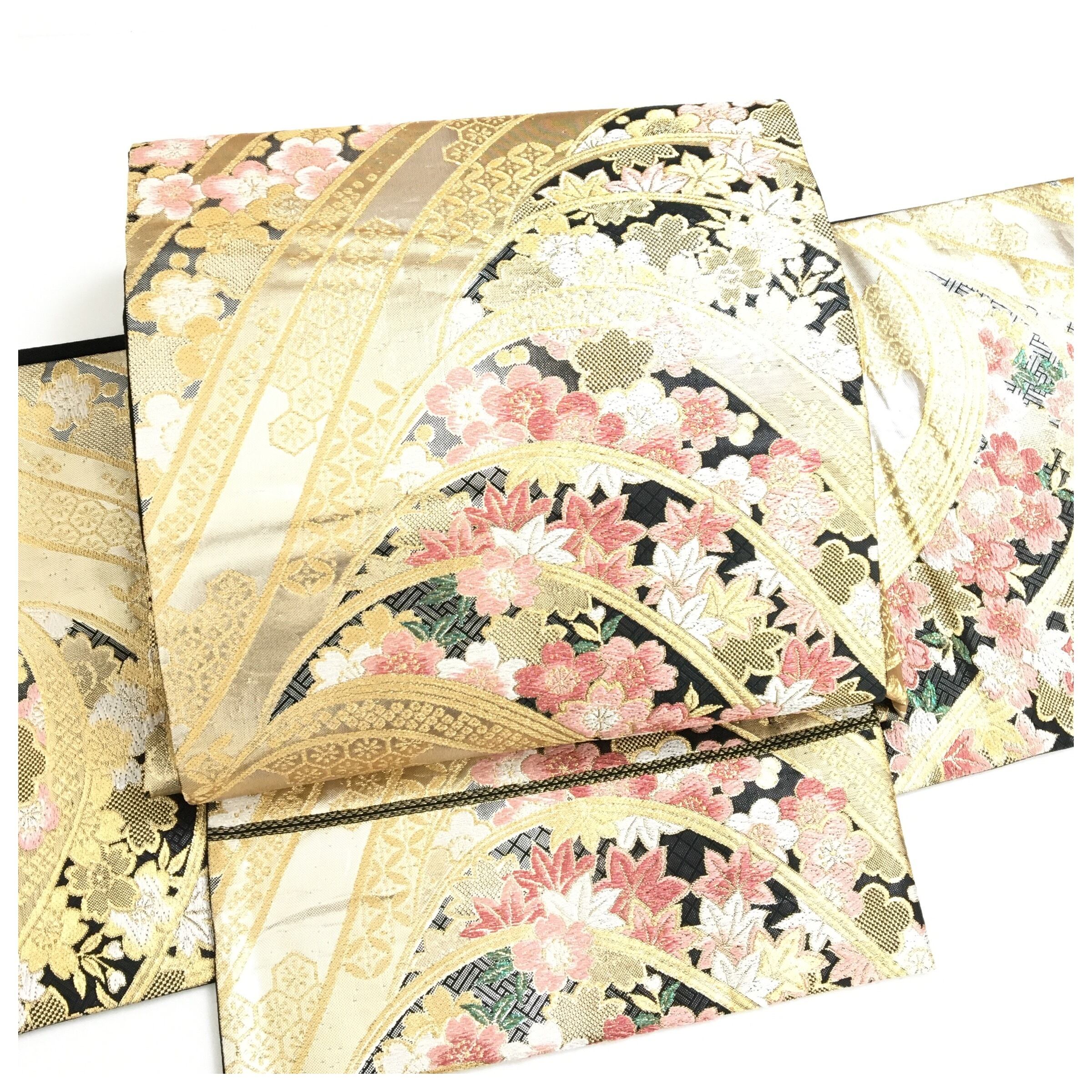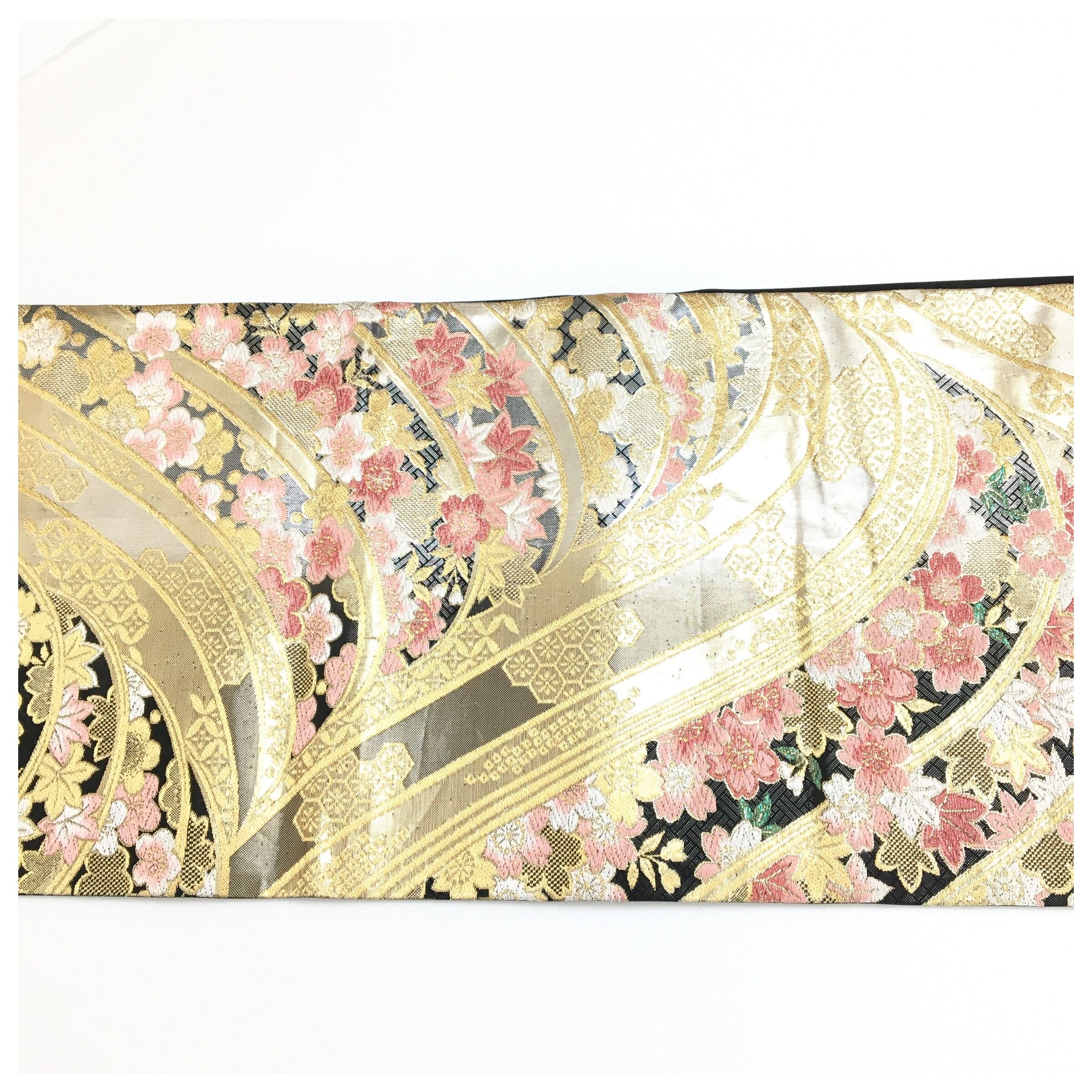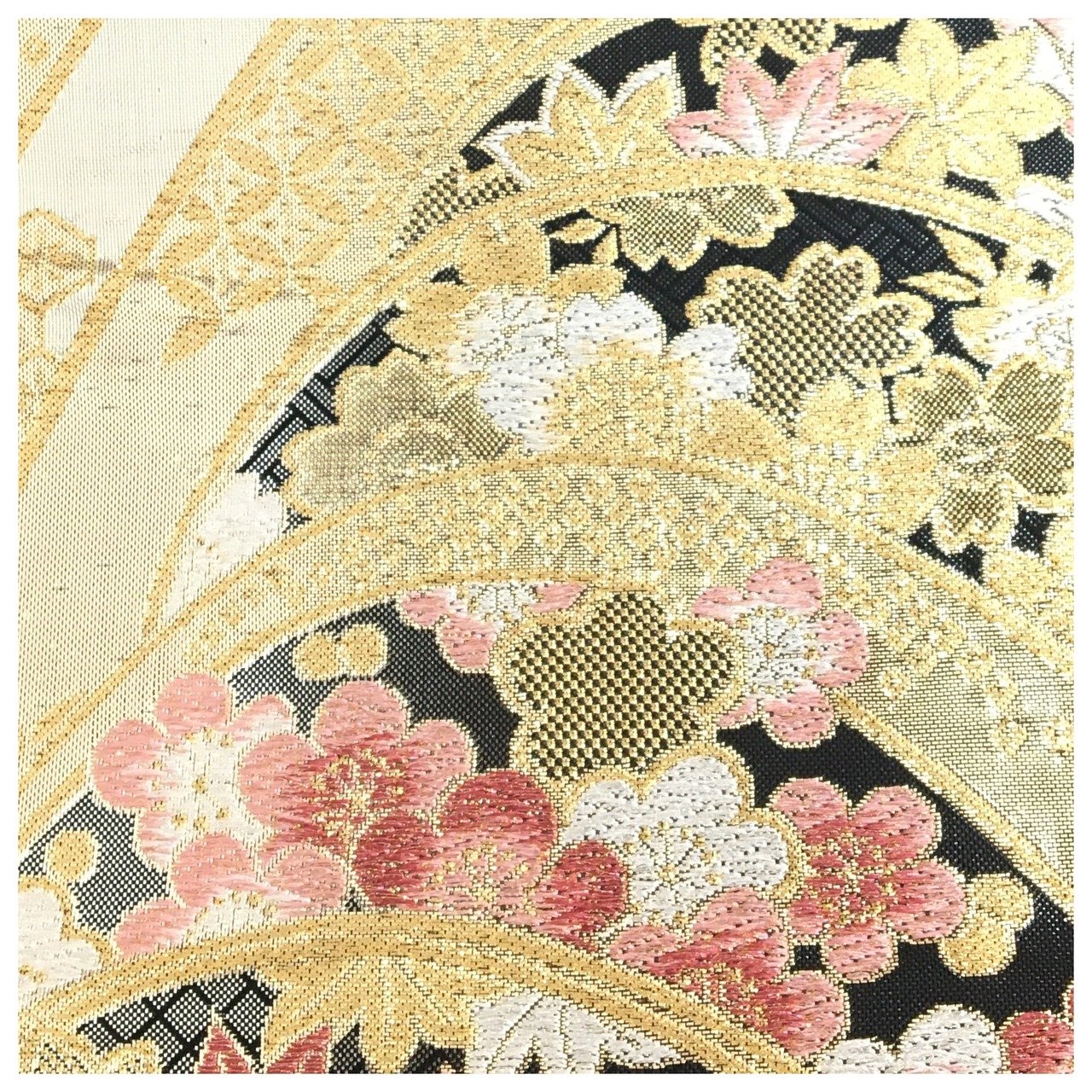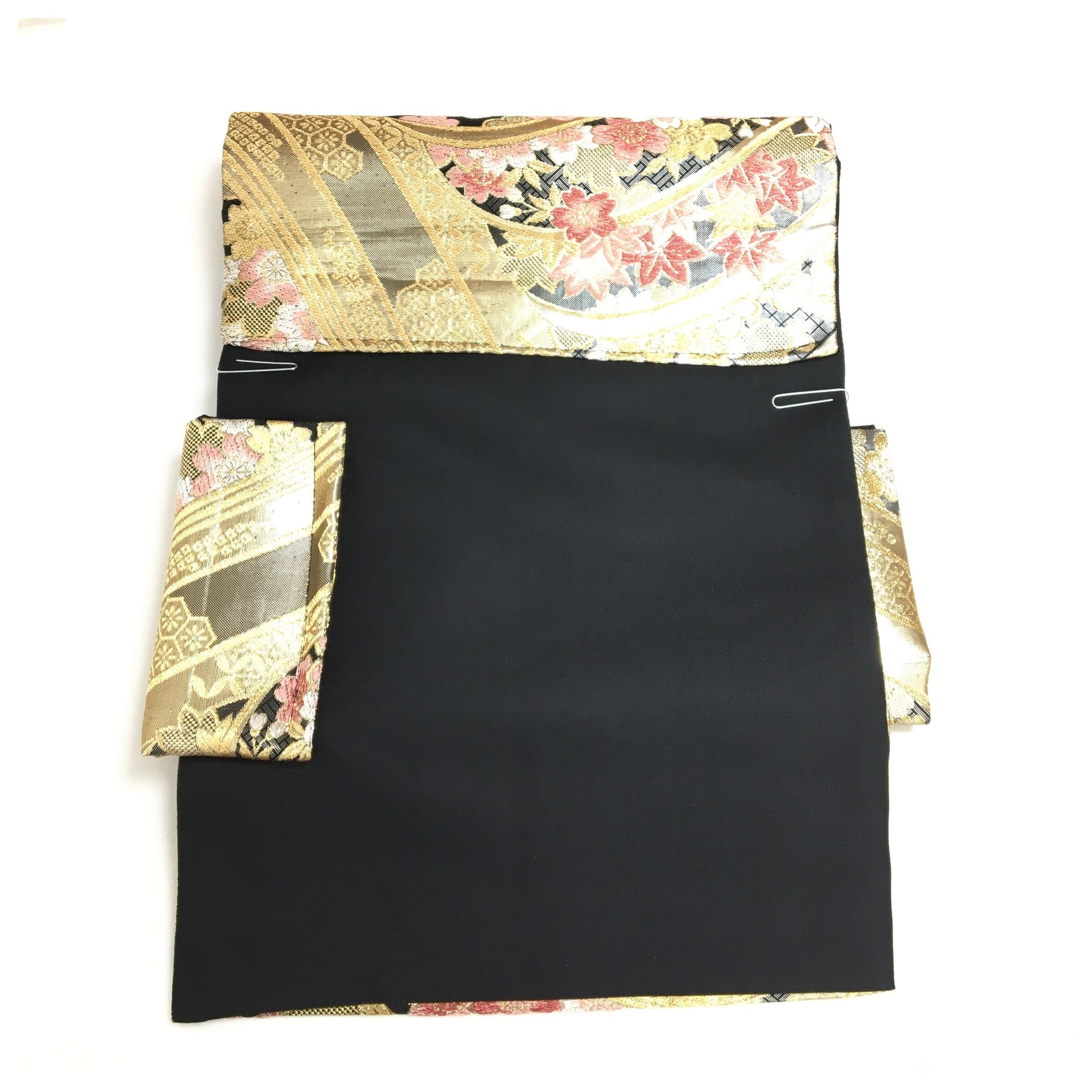 正絹 袋帯 作り帯 楽帯 金彩 黒地 二部式 二重太鼓 作け帯 です。