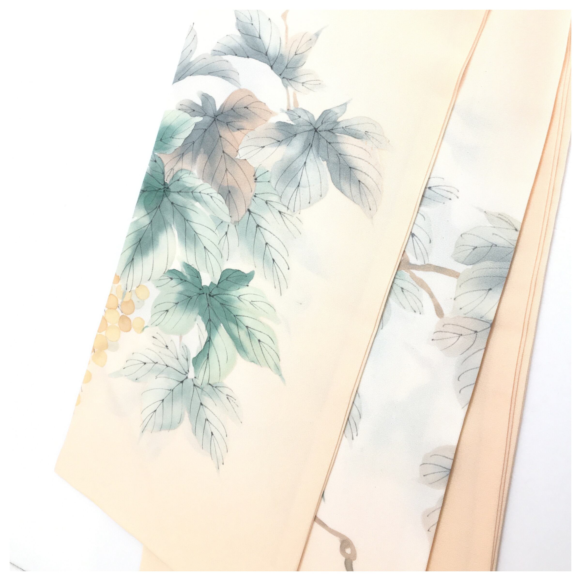 淡く薄いオレンジ色に鳥の羽を描いた訪問着で仕上げた手に馴染む帯地です。
