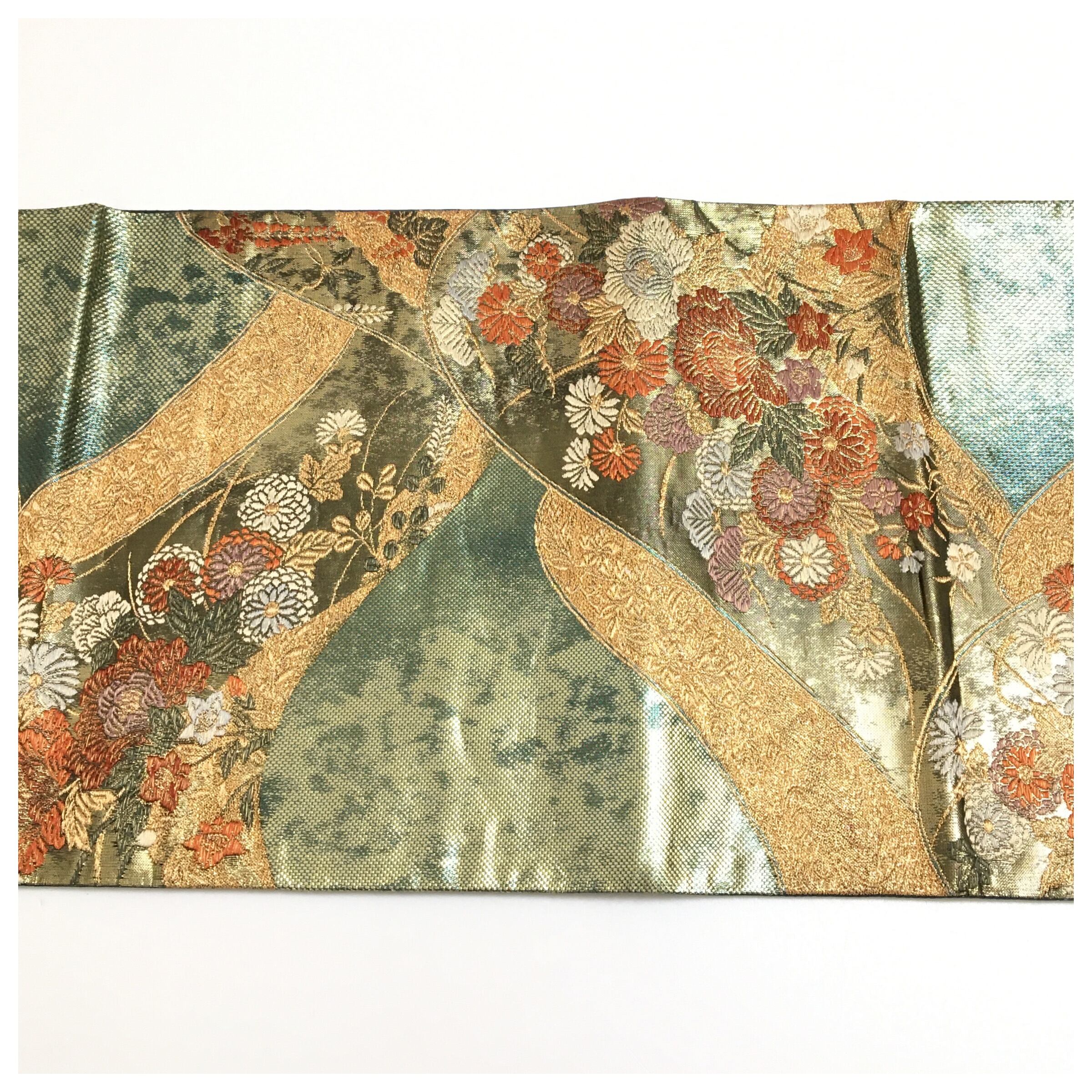正絹 付け帯 楽帯 金彩 グリーン 二部式 二重太鼓 作り帯 です。