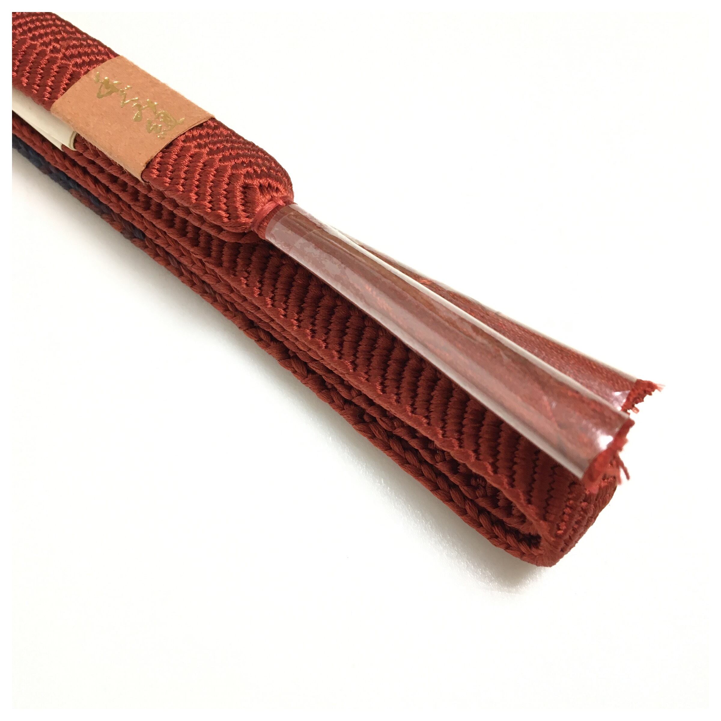 赤と紺の落ち着いたお色で着物に合わせやすい上品なデザインです。