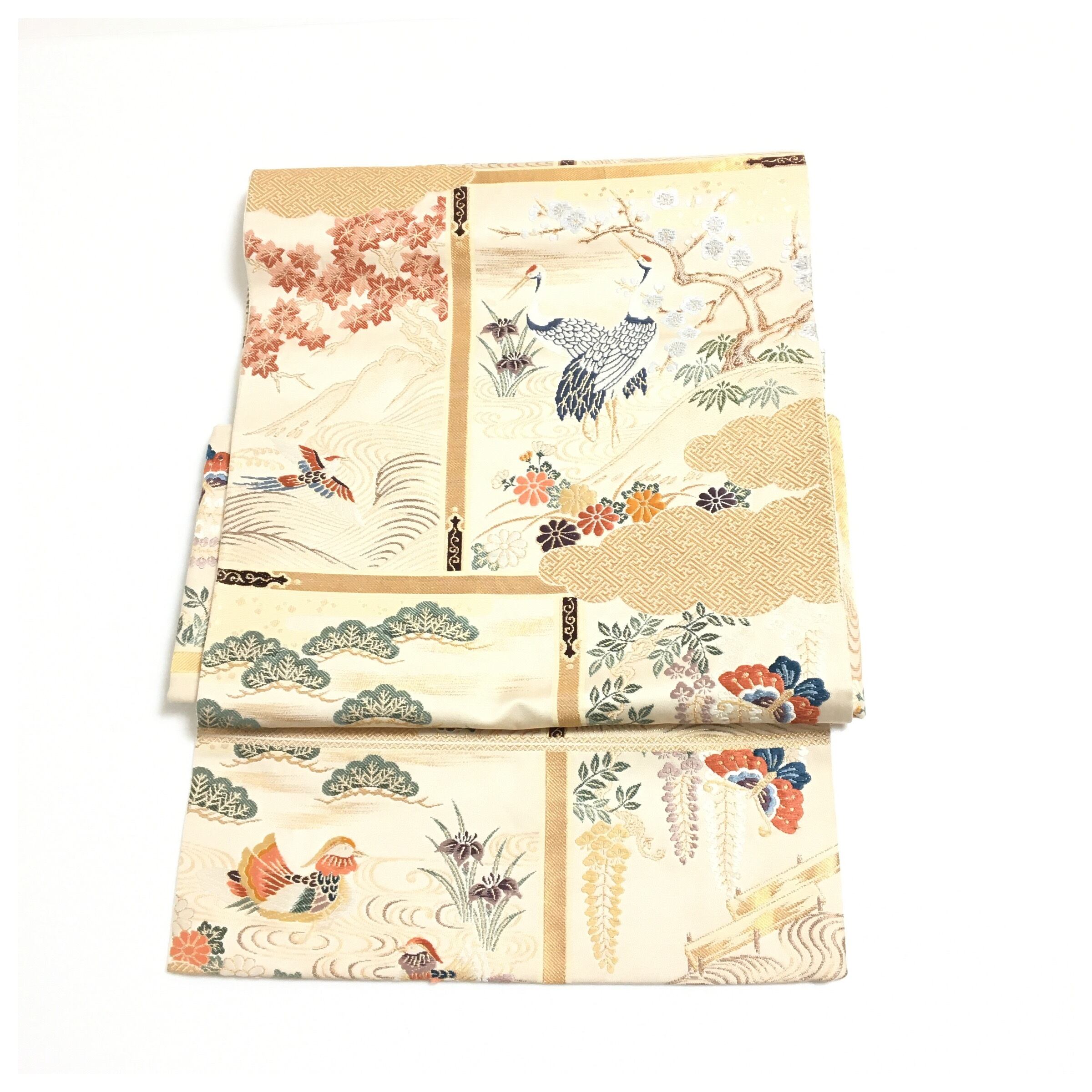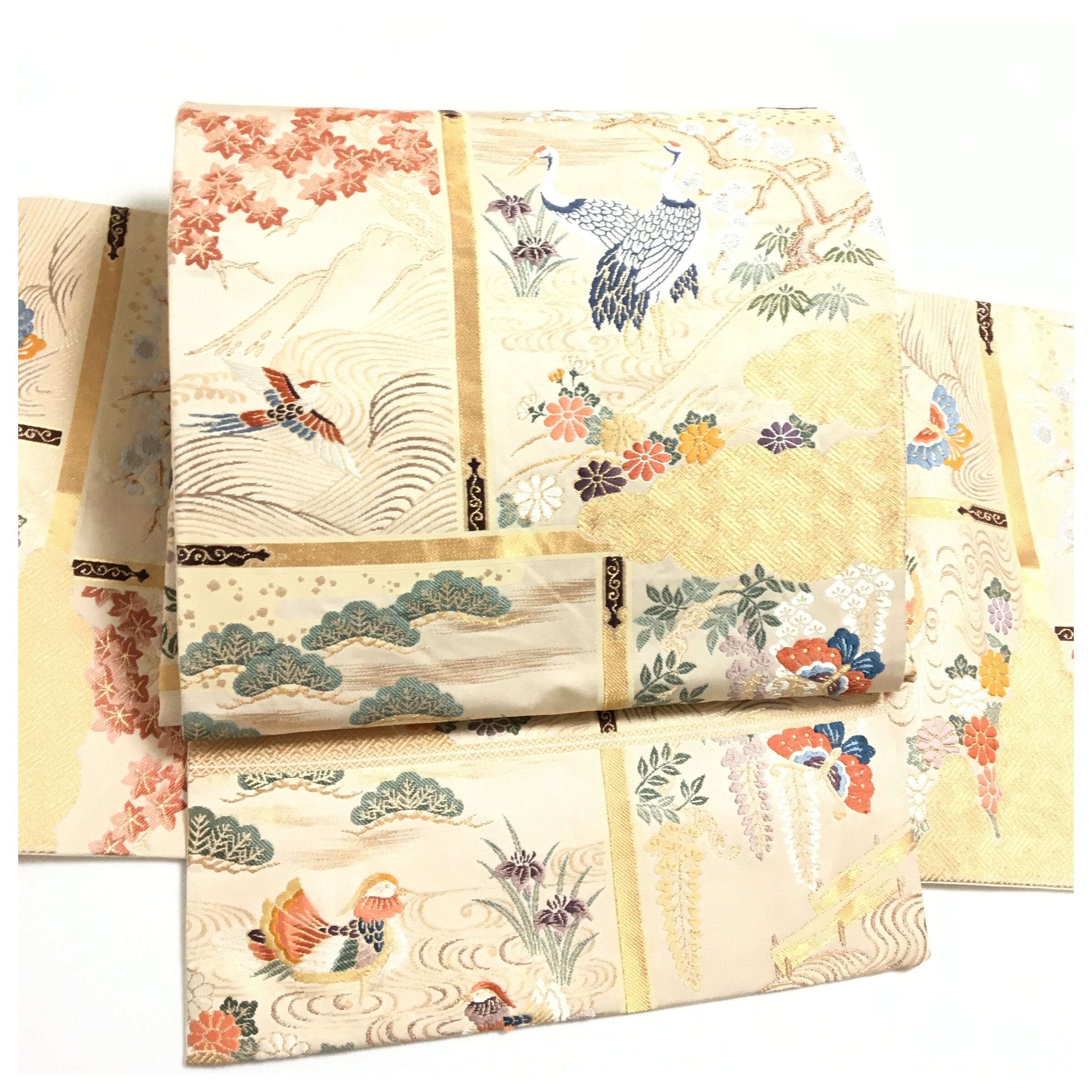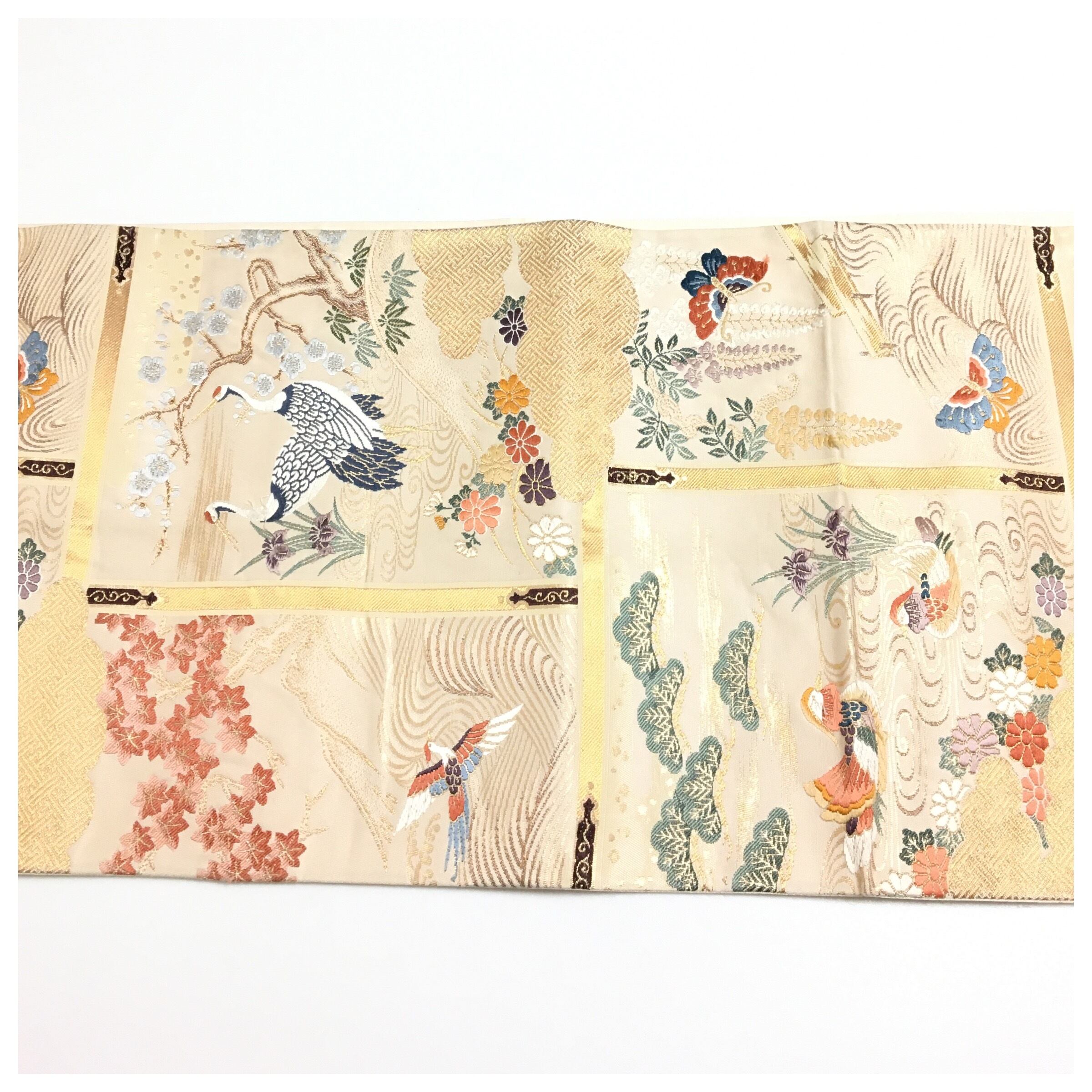 正絹 楽帯 袋帯 クリーム 鶴 二重太鼓 作り帯 です。