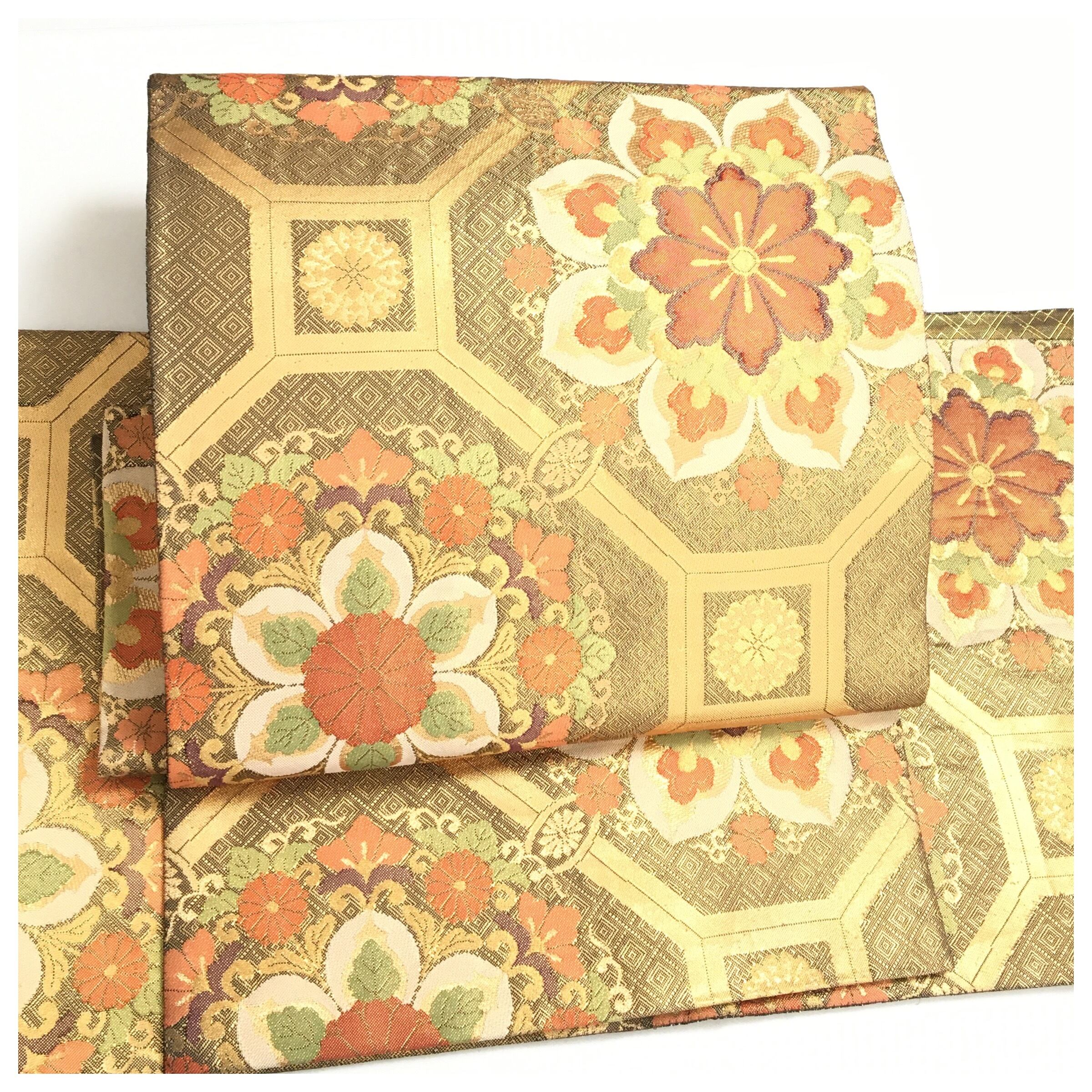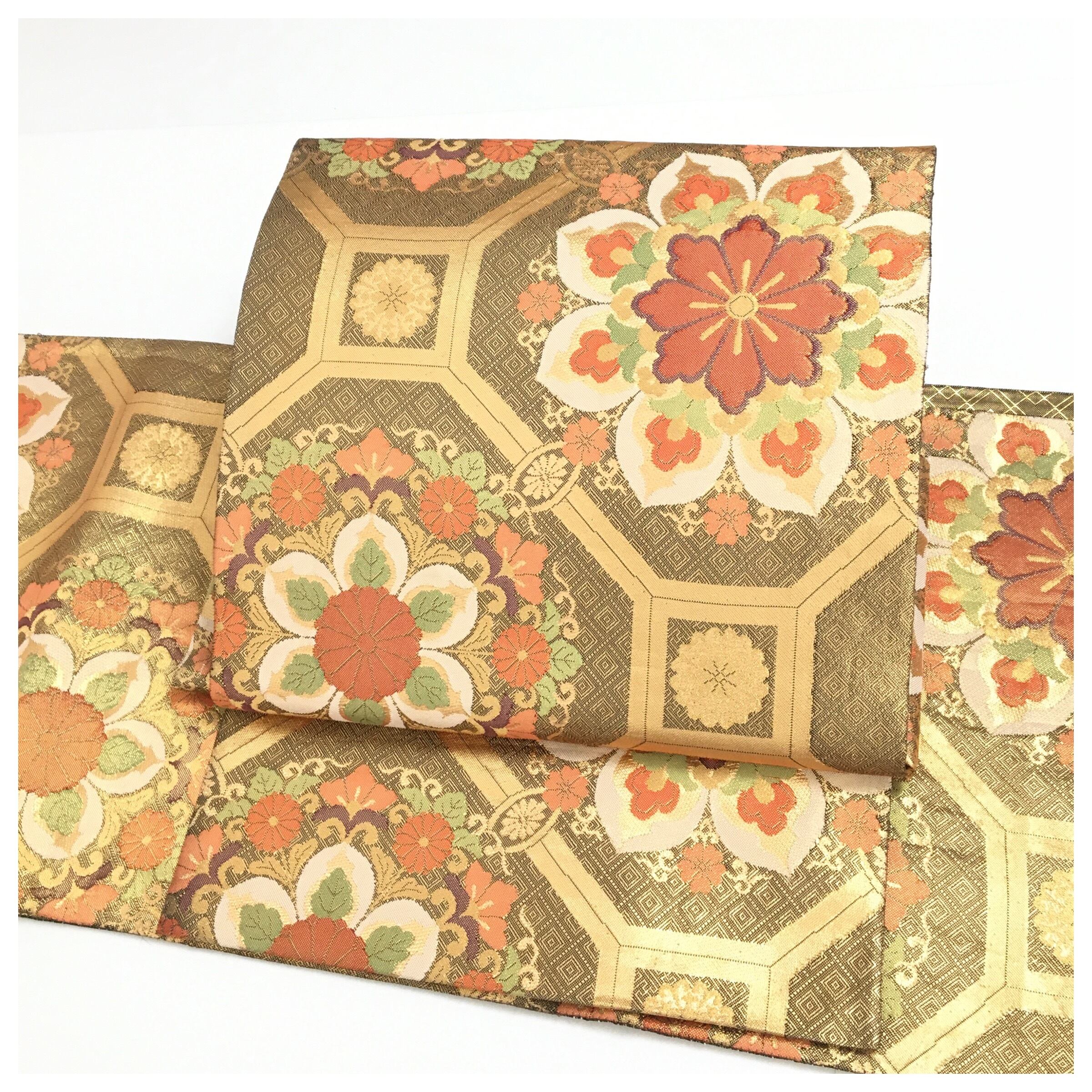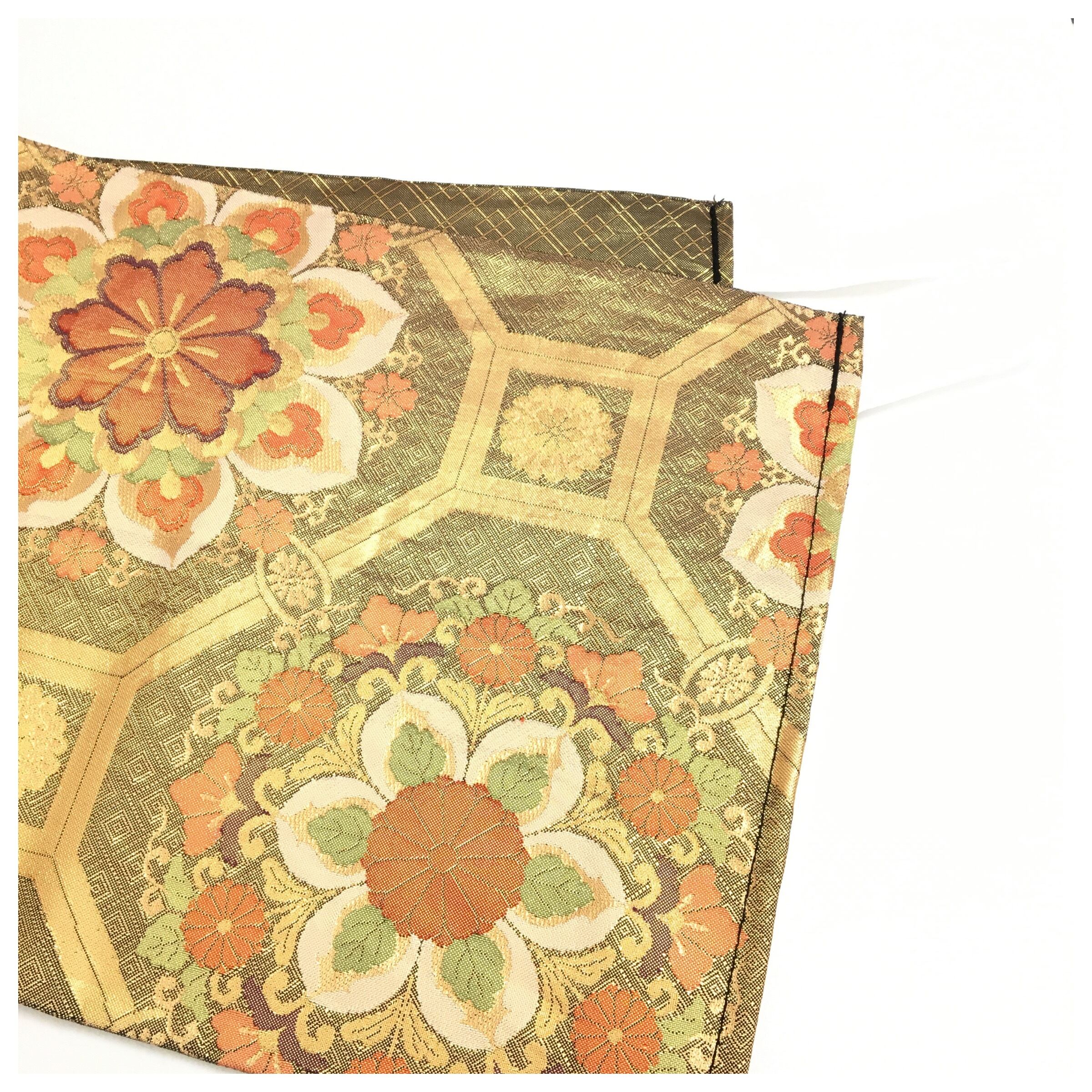 正絹 楽帯 袋帯 金糸 金茶 華紋 二重太鼓 作り帯 です。