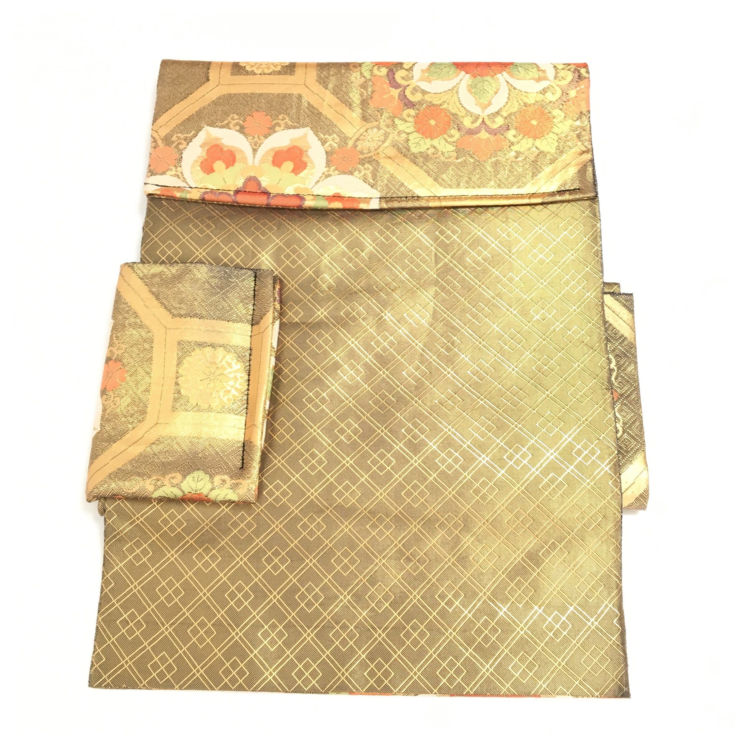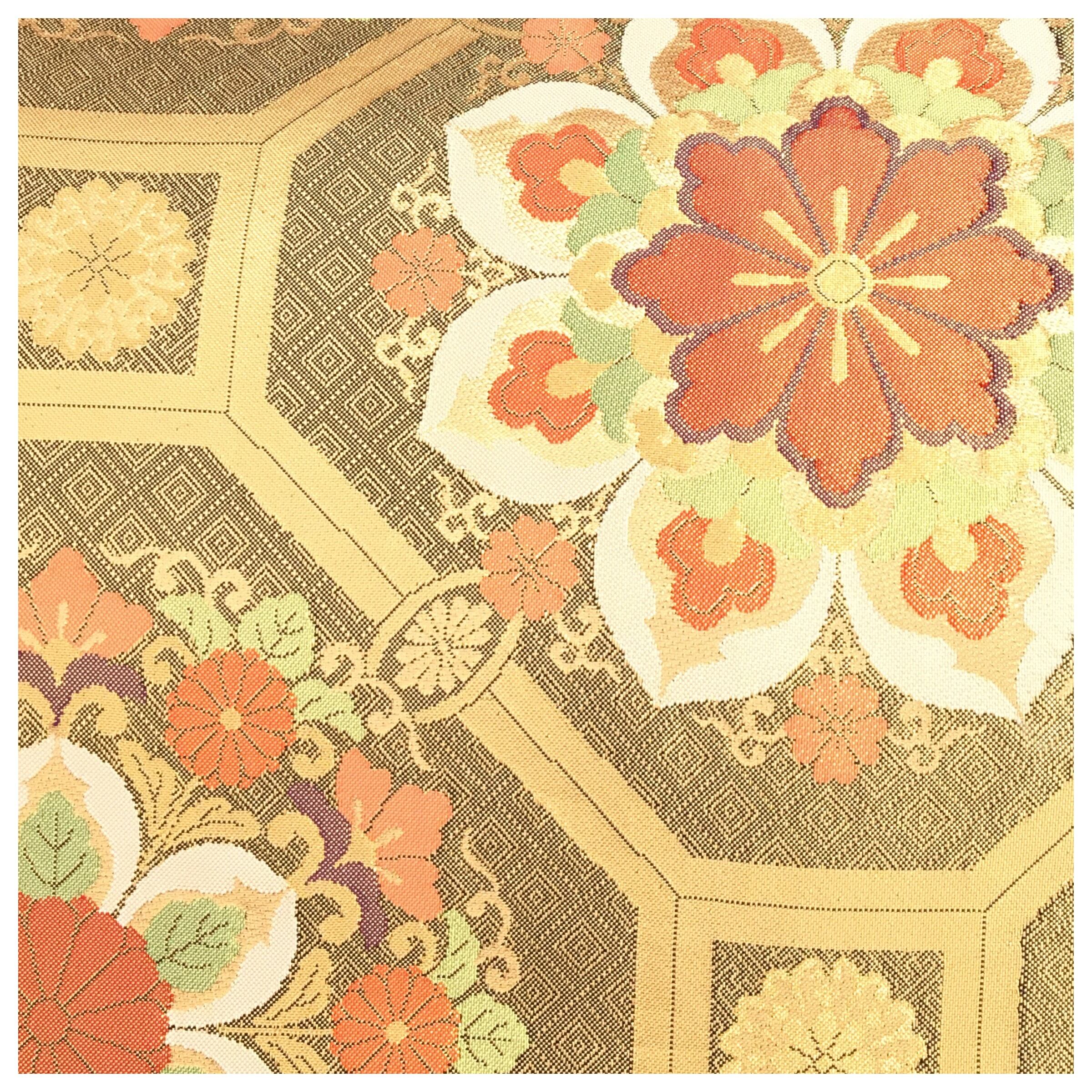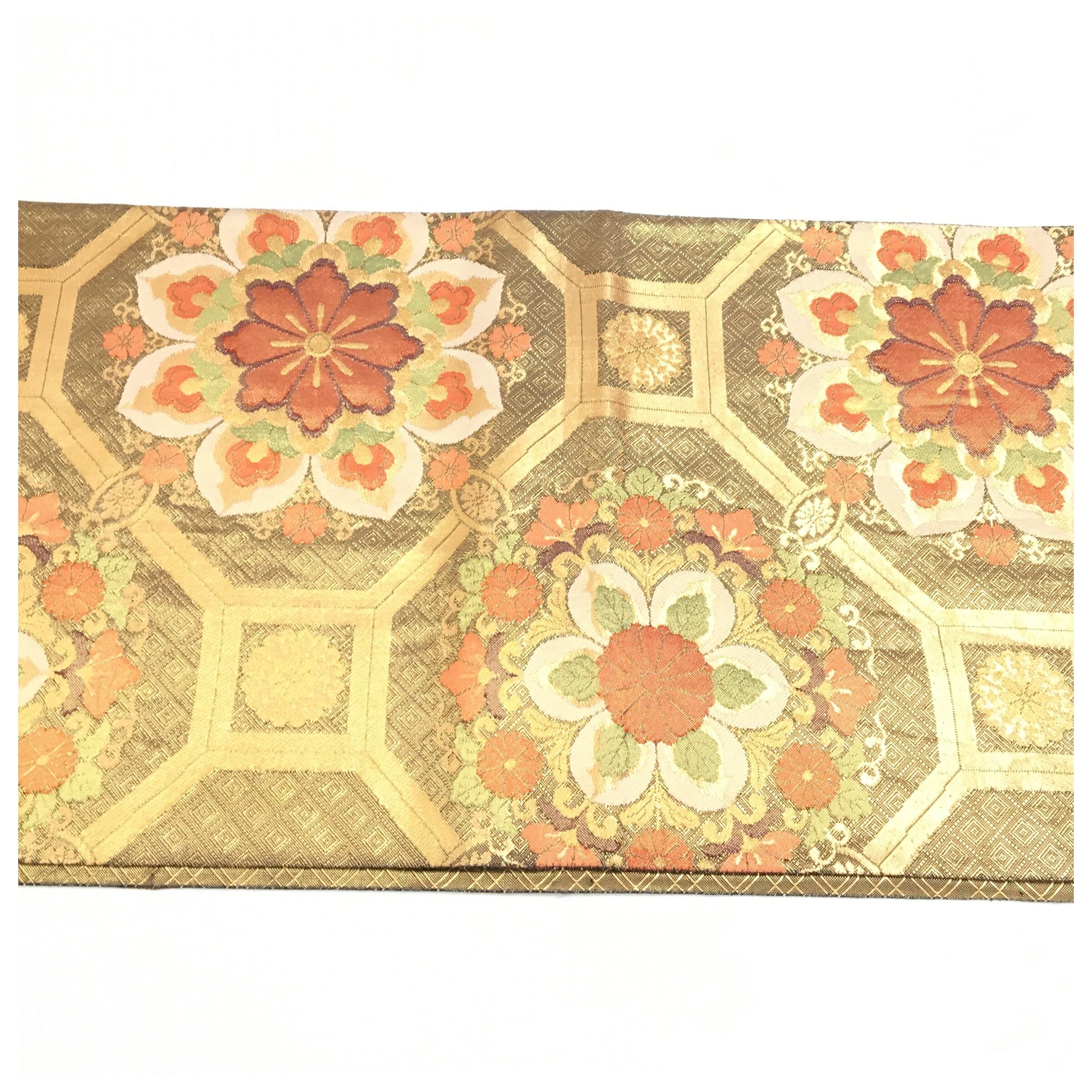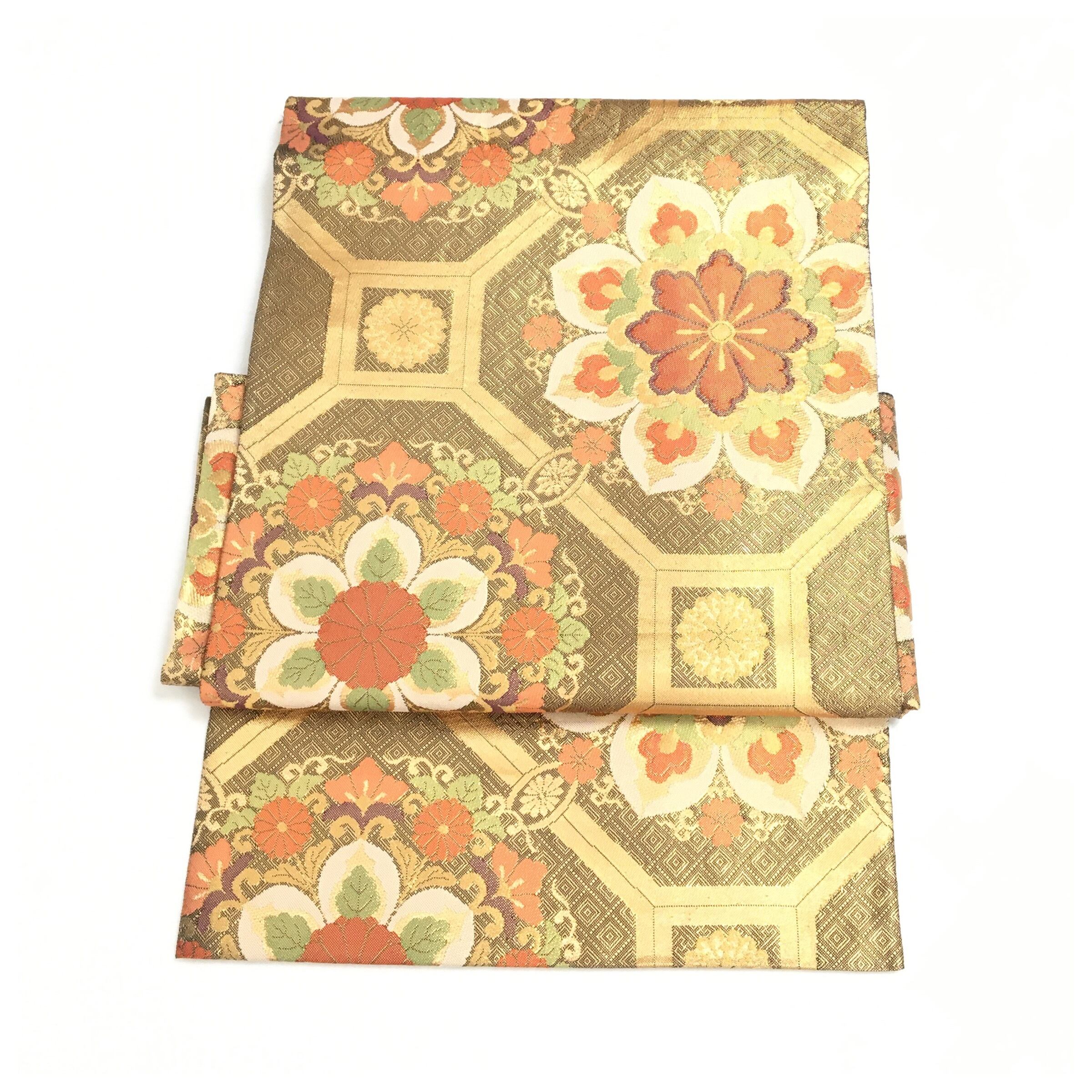 正絹 楽帯 袋帯 金糸 金茶 華紋 二重太鼓 作り帯 です。