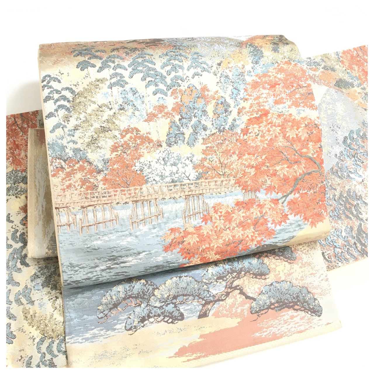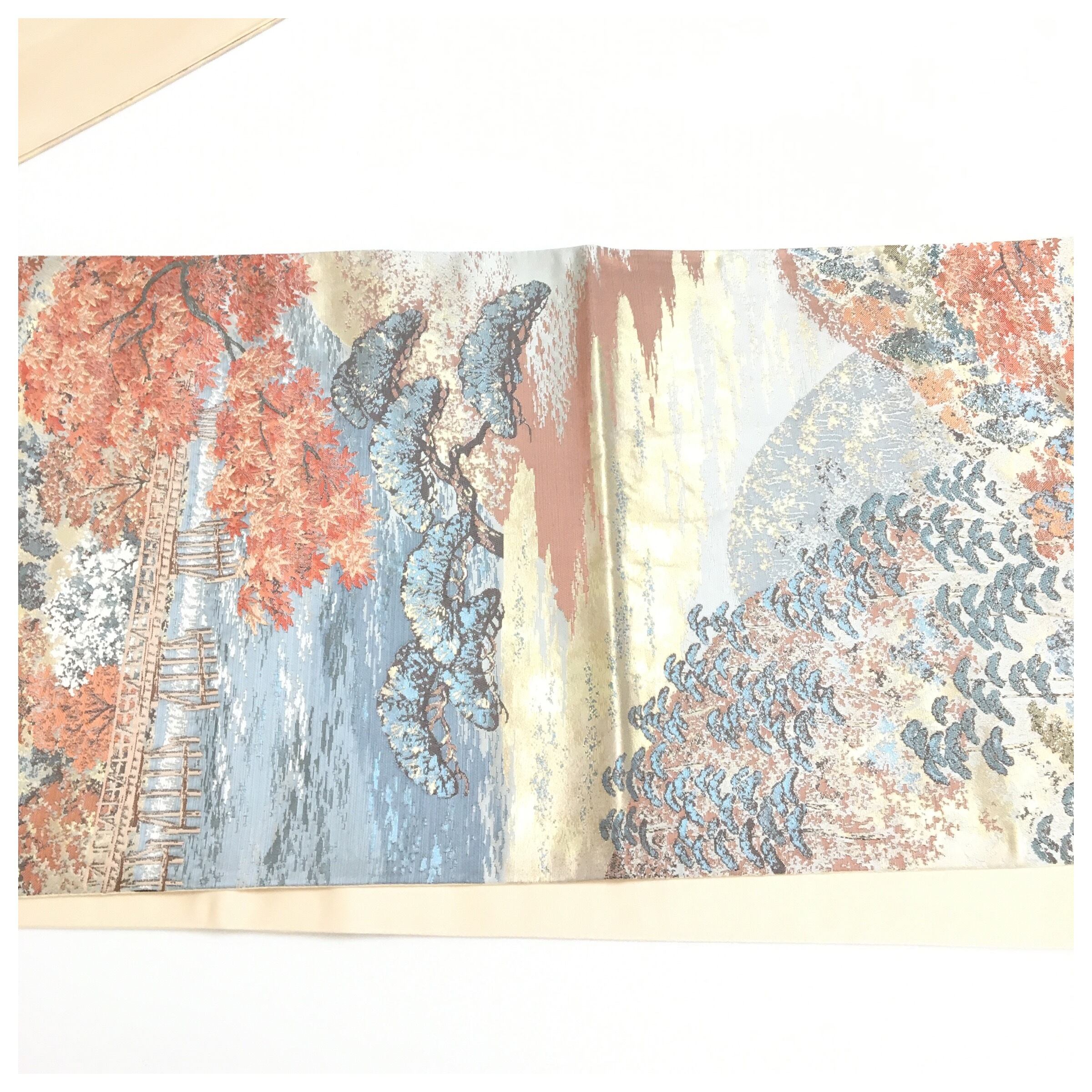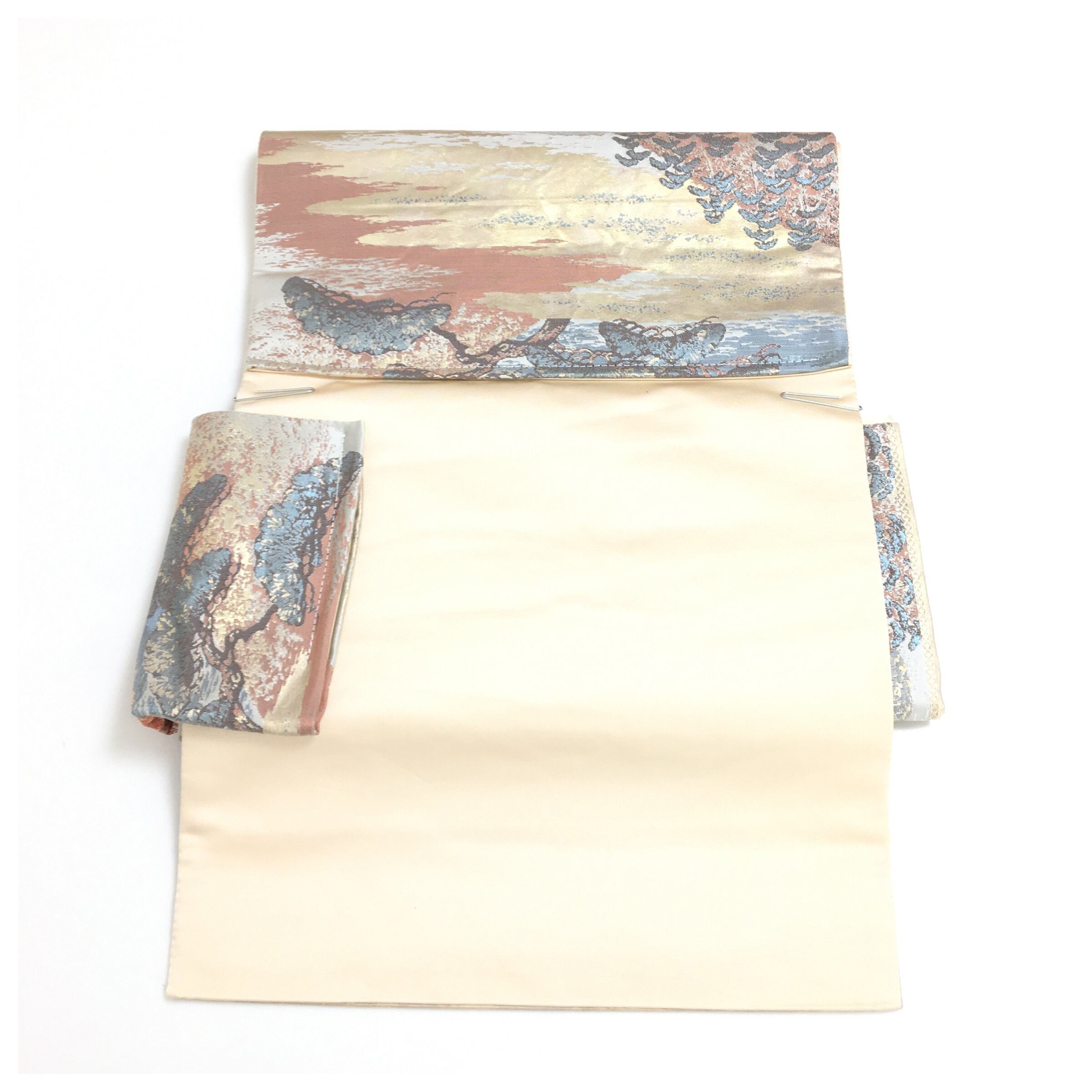 正絹 楽帯 袋帯 織り 風景柄 クリーム 二部式 二重太鼓 作り帯 です。