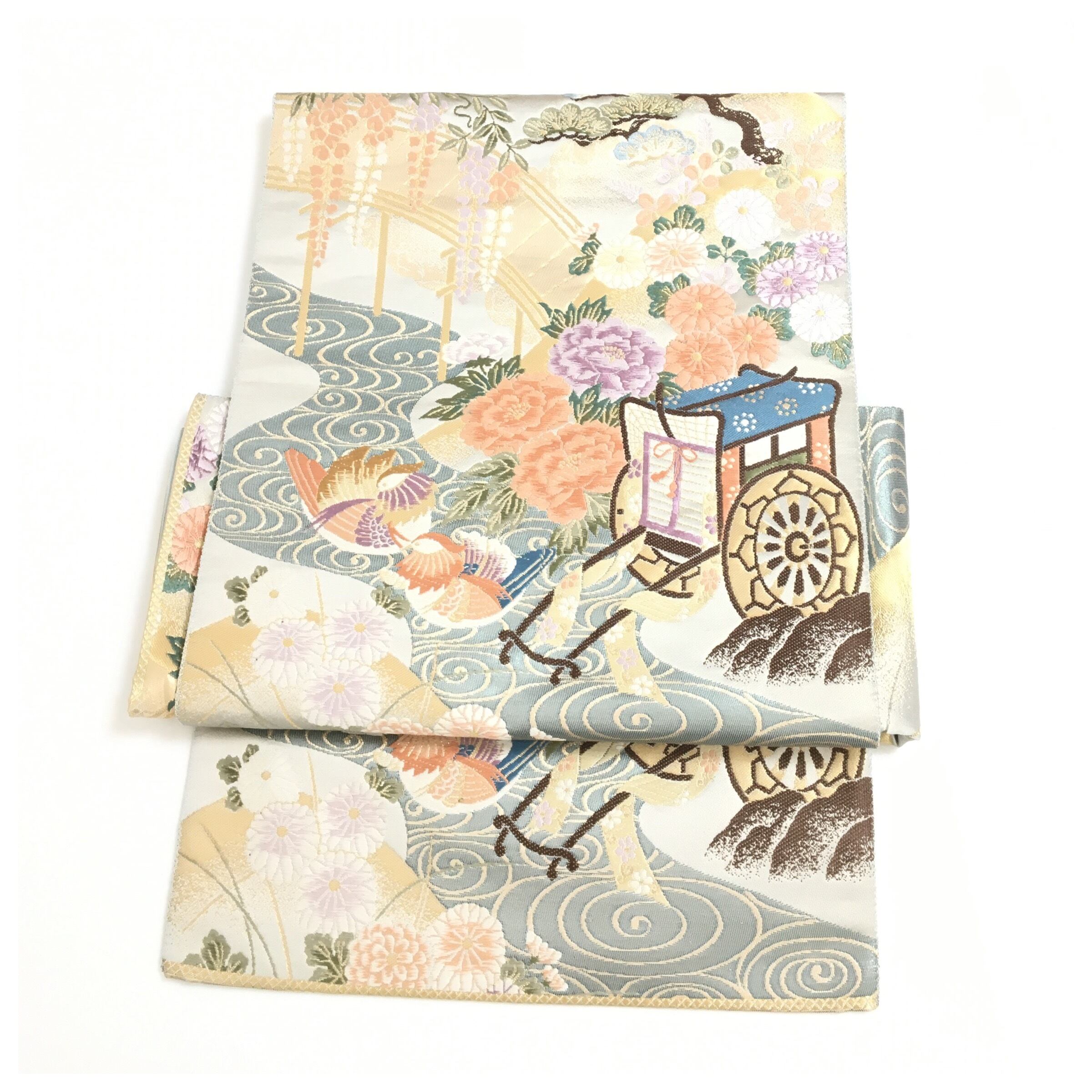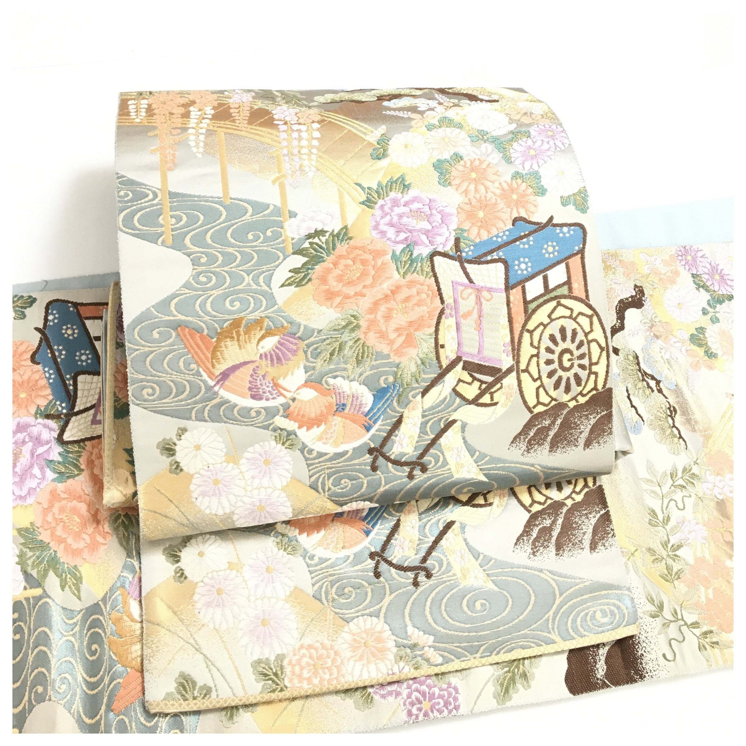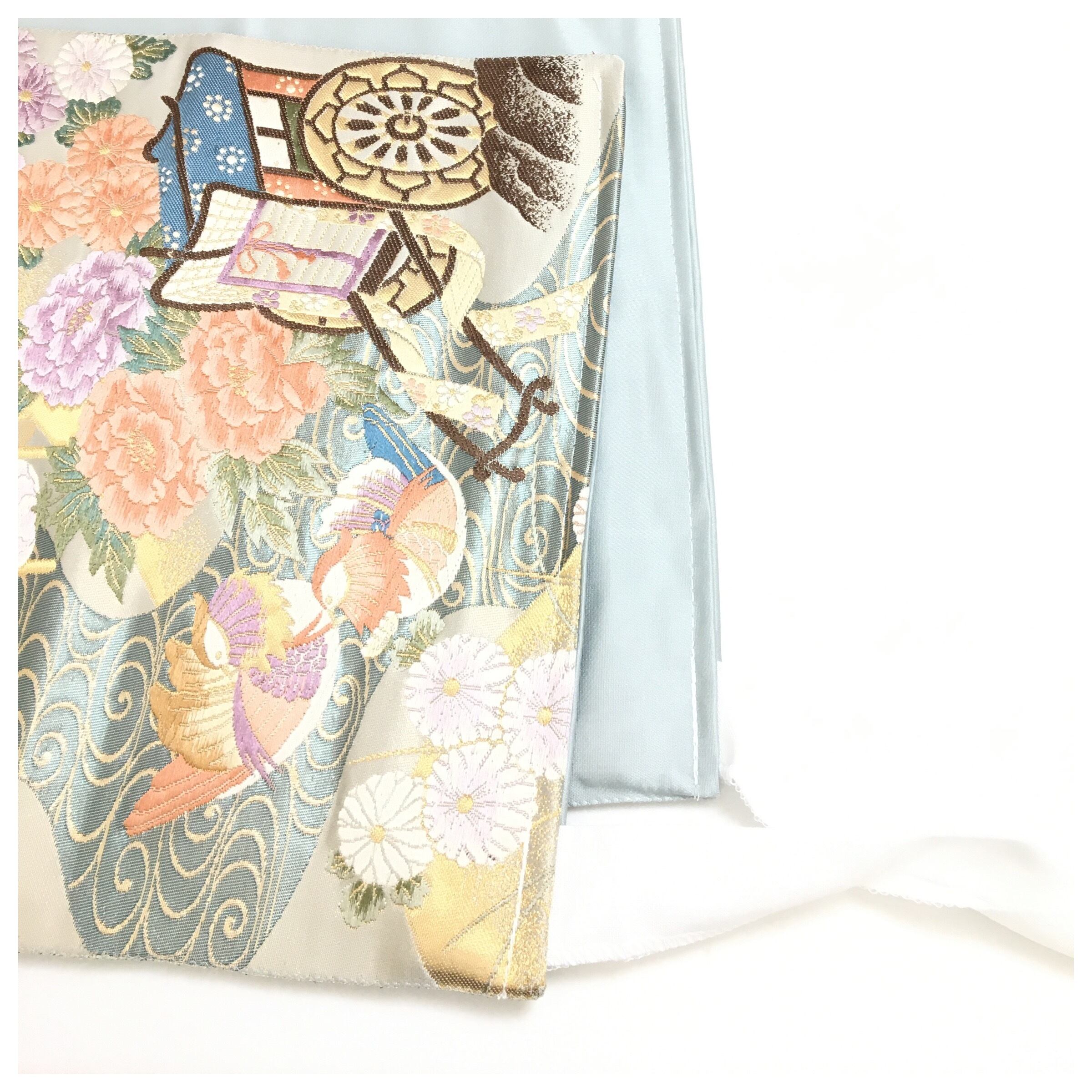 美品 正絹 楽帯 袋帯 アイスブルー 華 御所車 二部式 二重太鼓 作り帯 です。