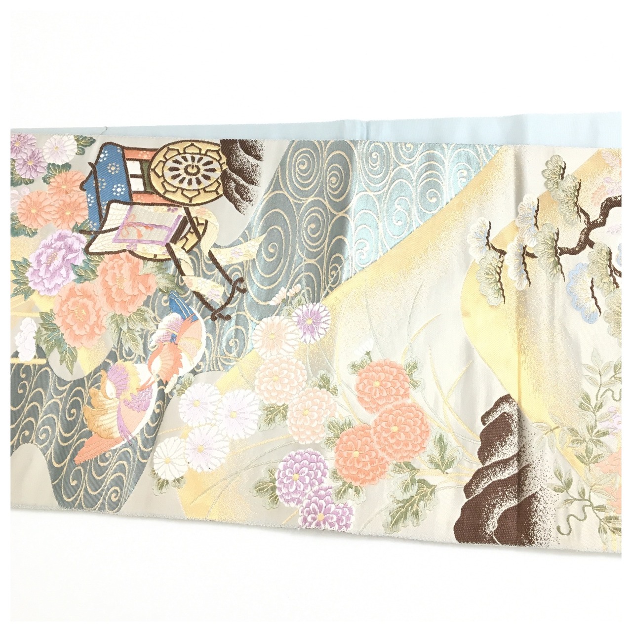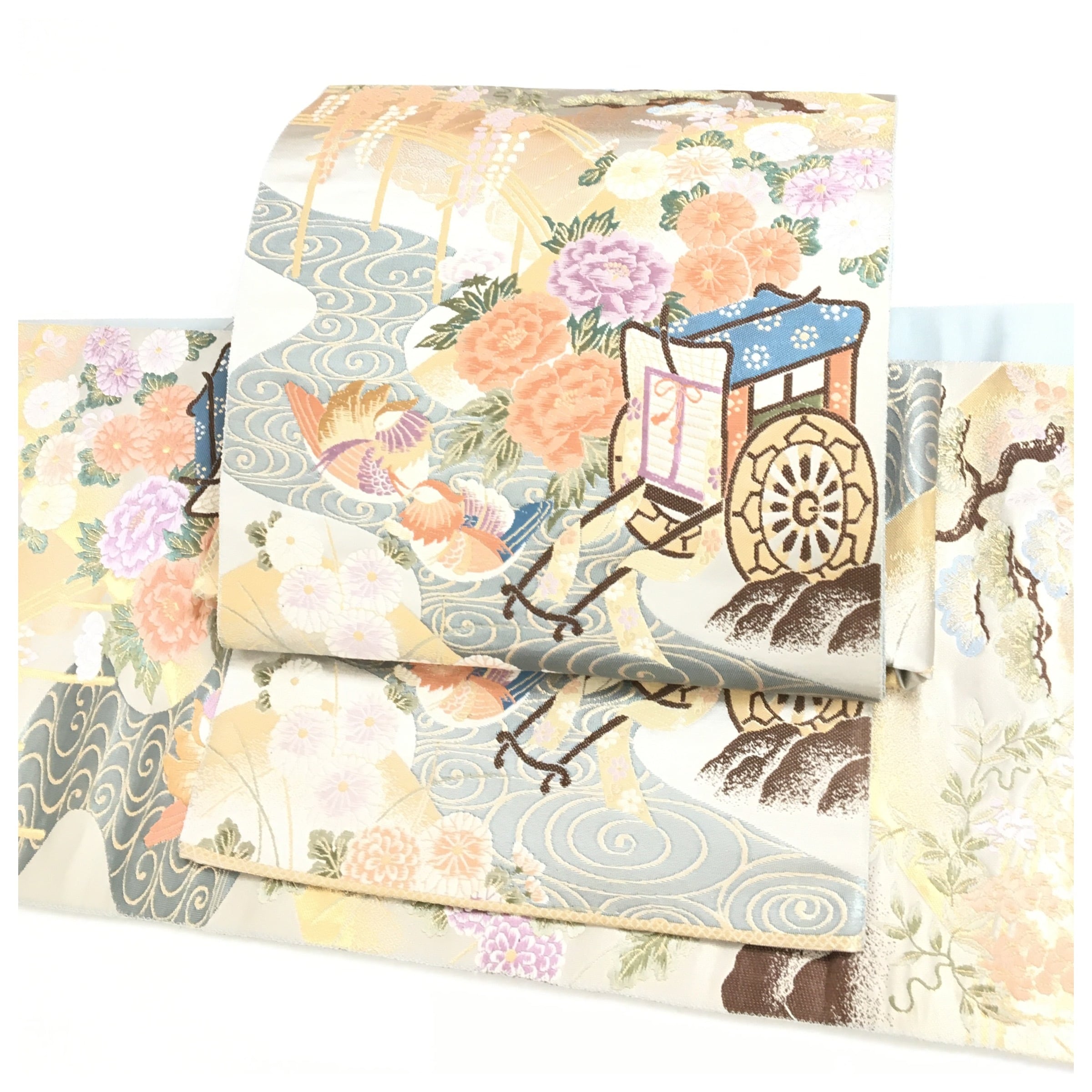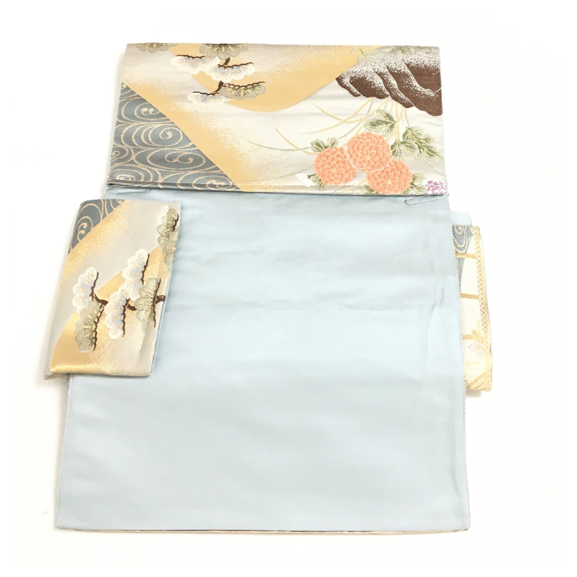 美品 正絹 楽帯 袋帯 アイスブルー 華 御所車 二部式 二重太鼓 作り帯 です。