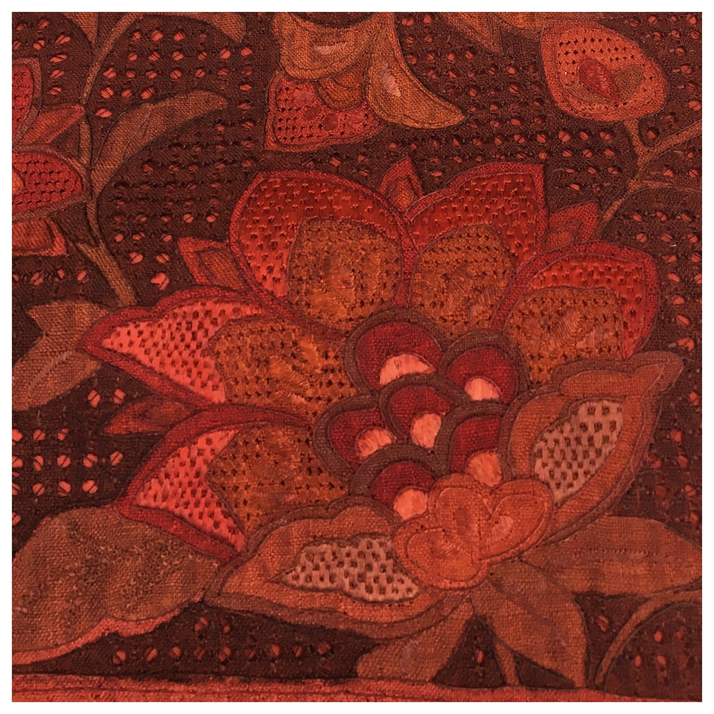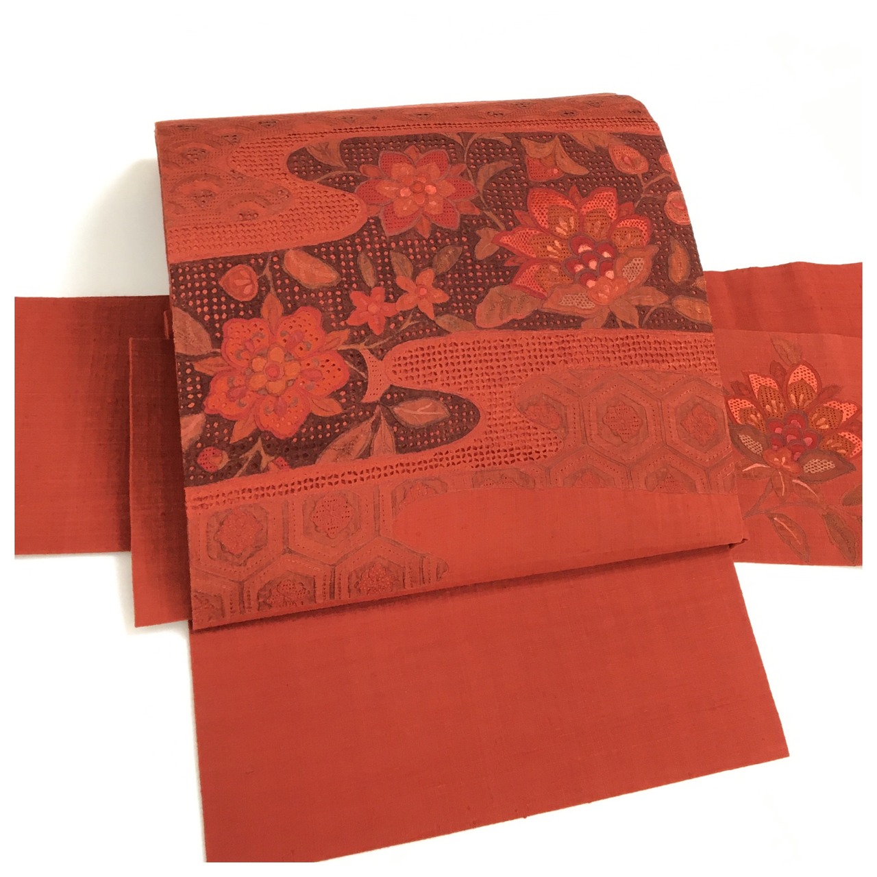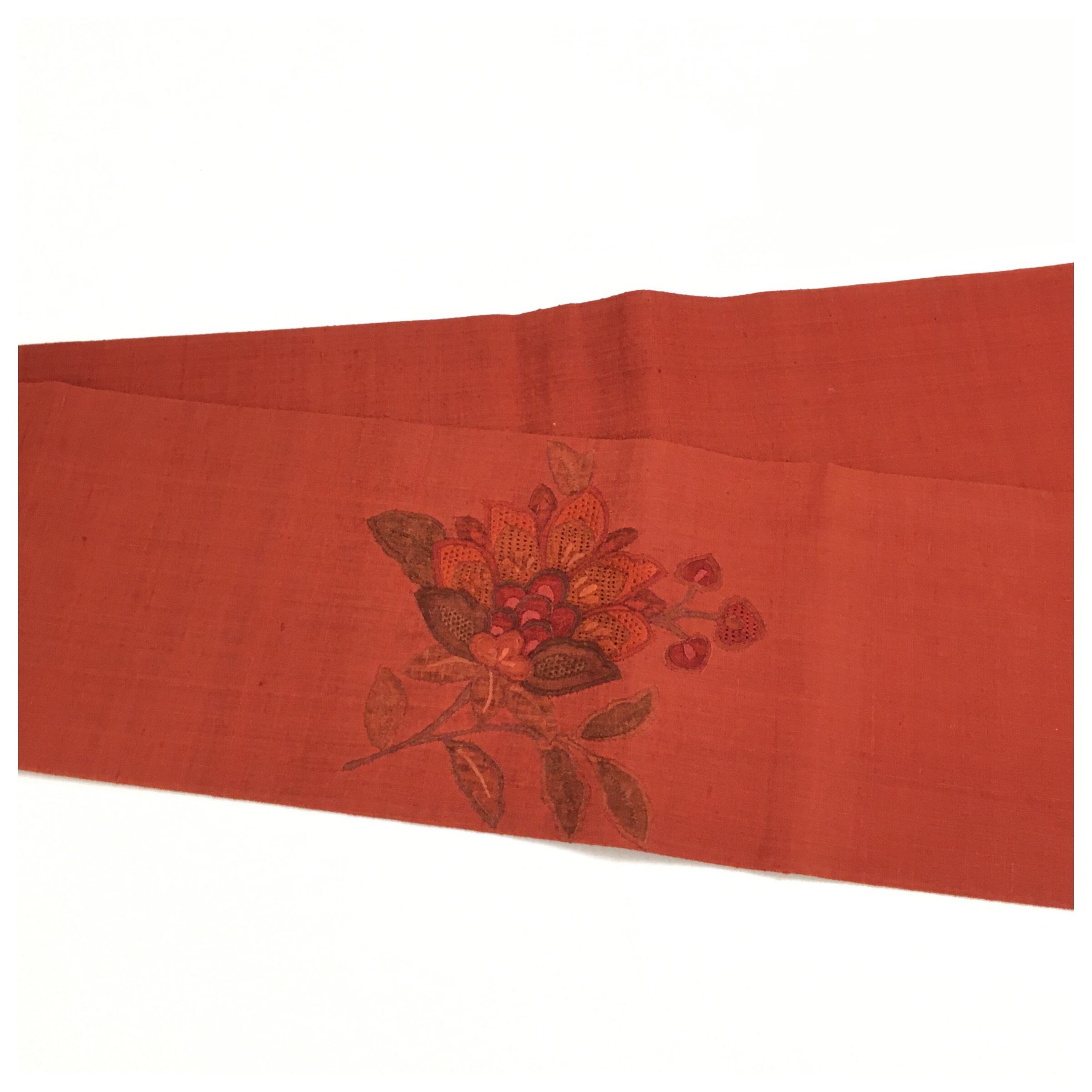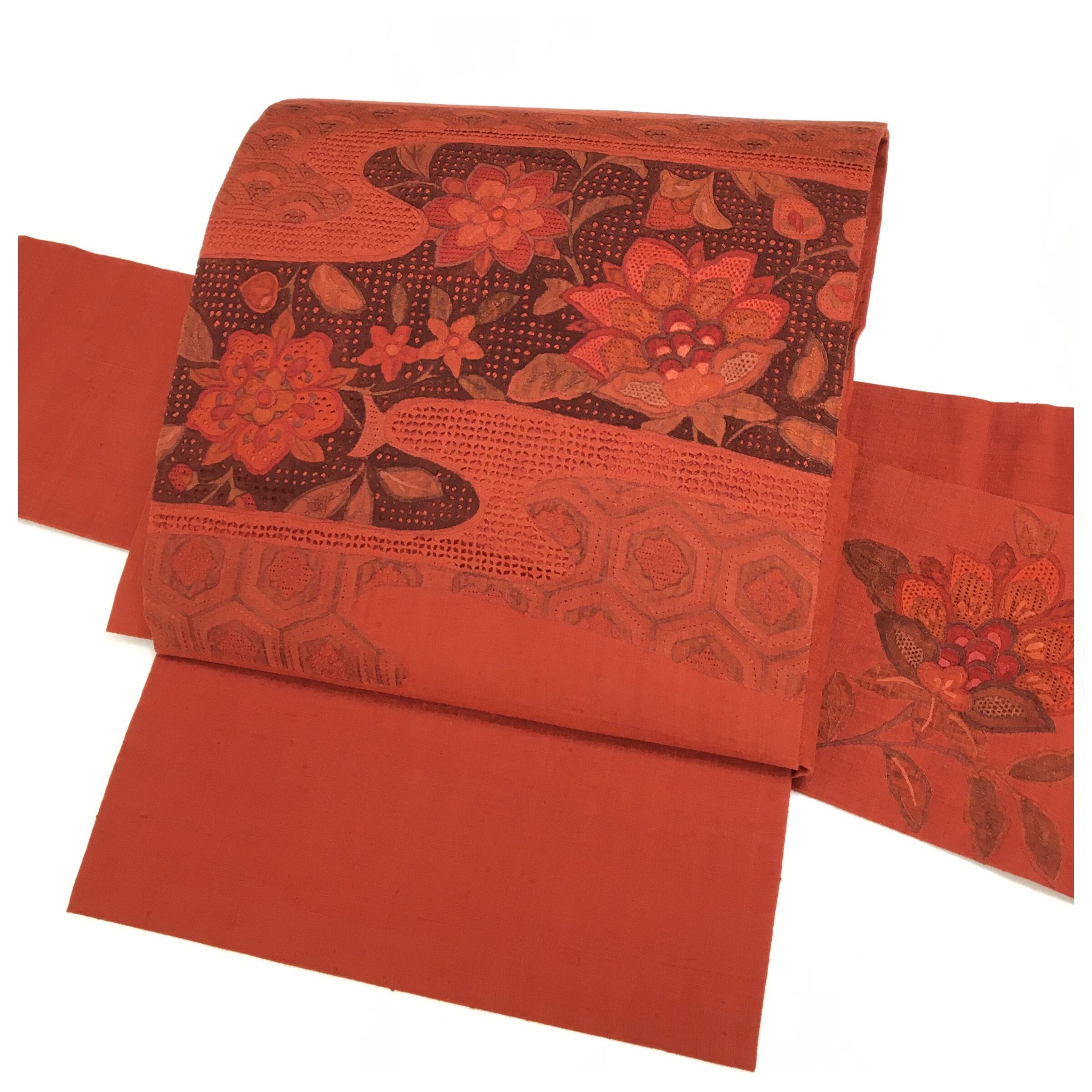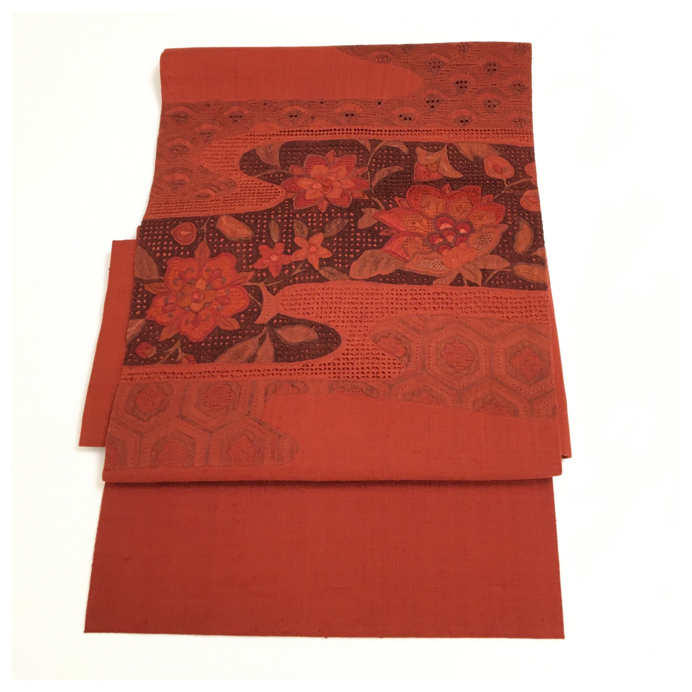 濃く目を惹く赤色にエレガントな華模様のデザインがお洒落な名古屋帯です。