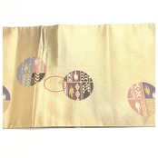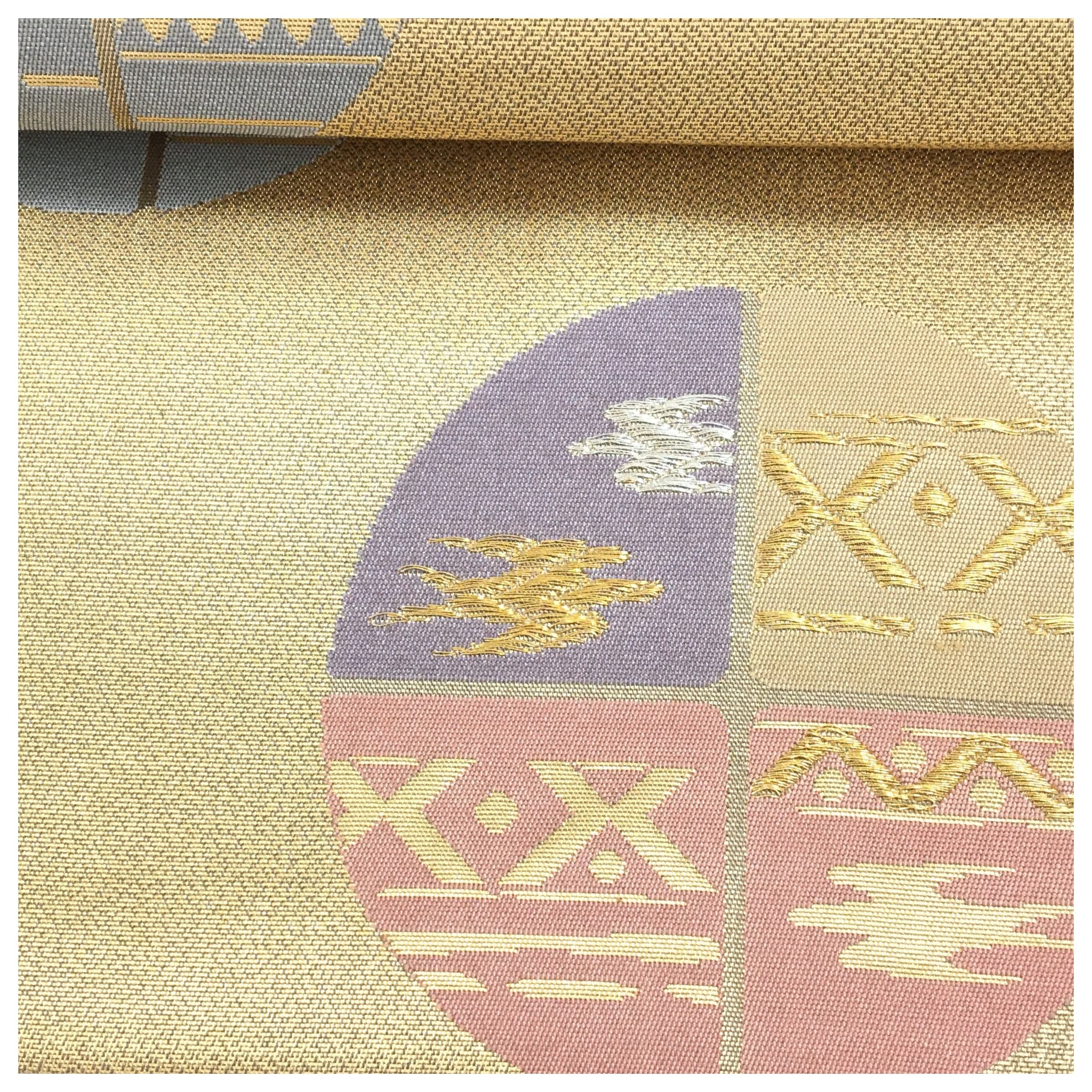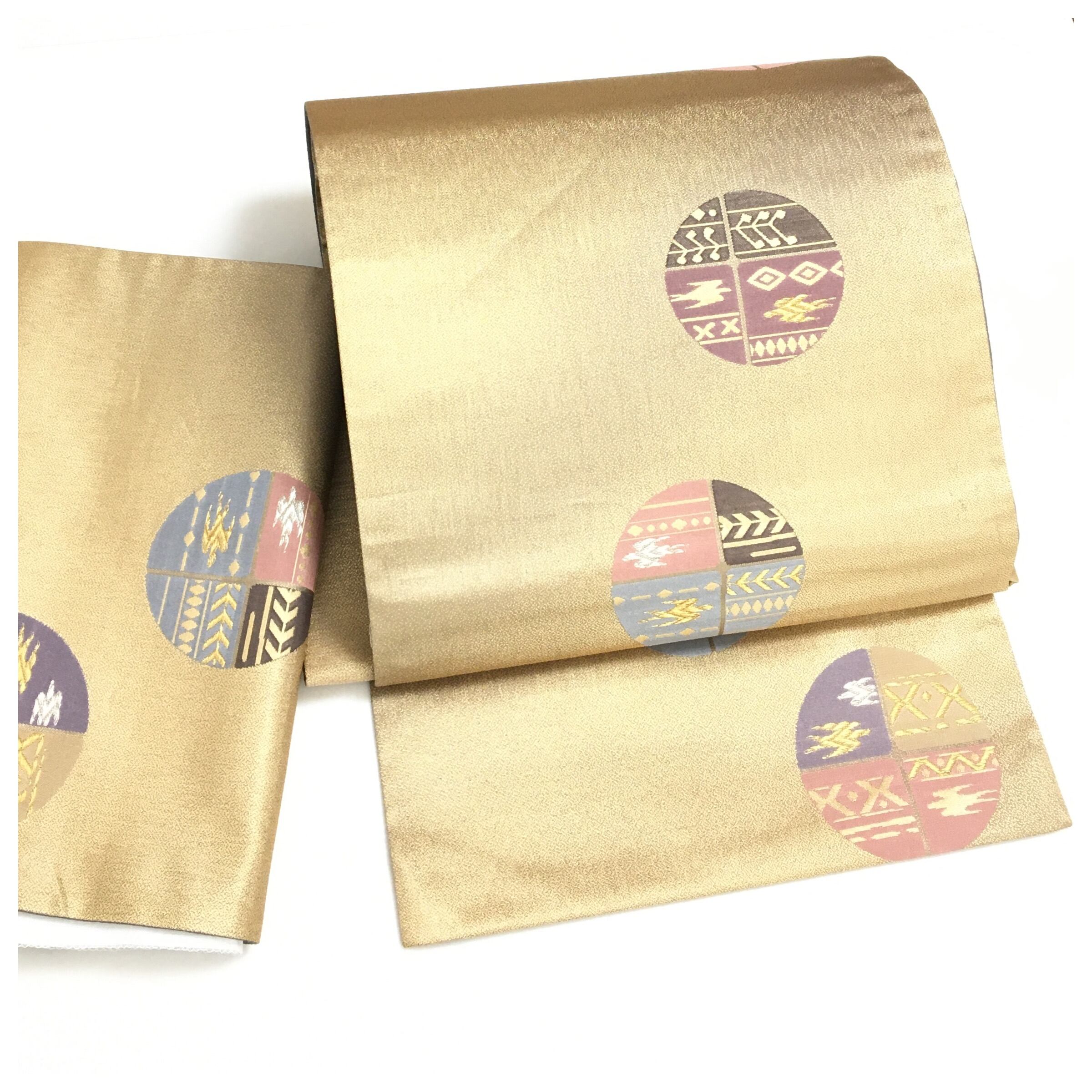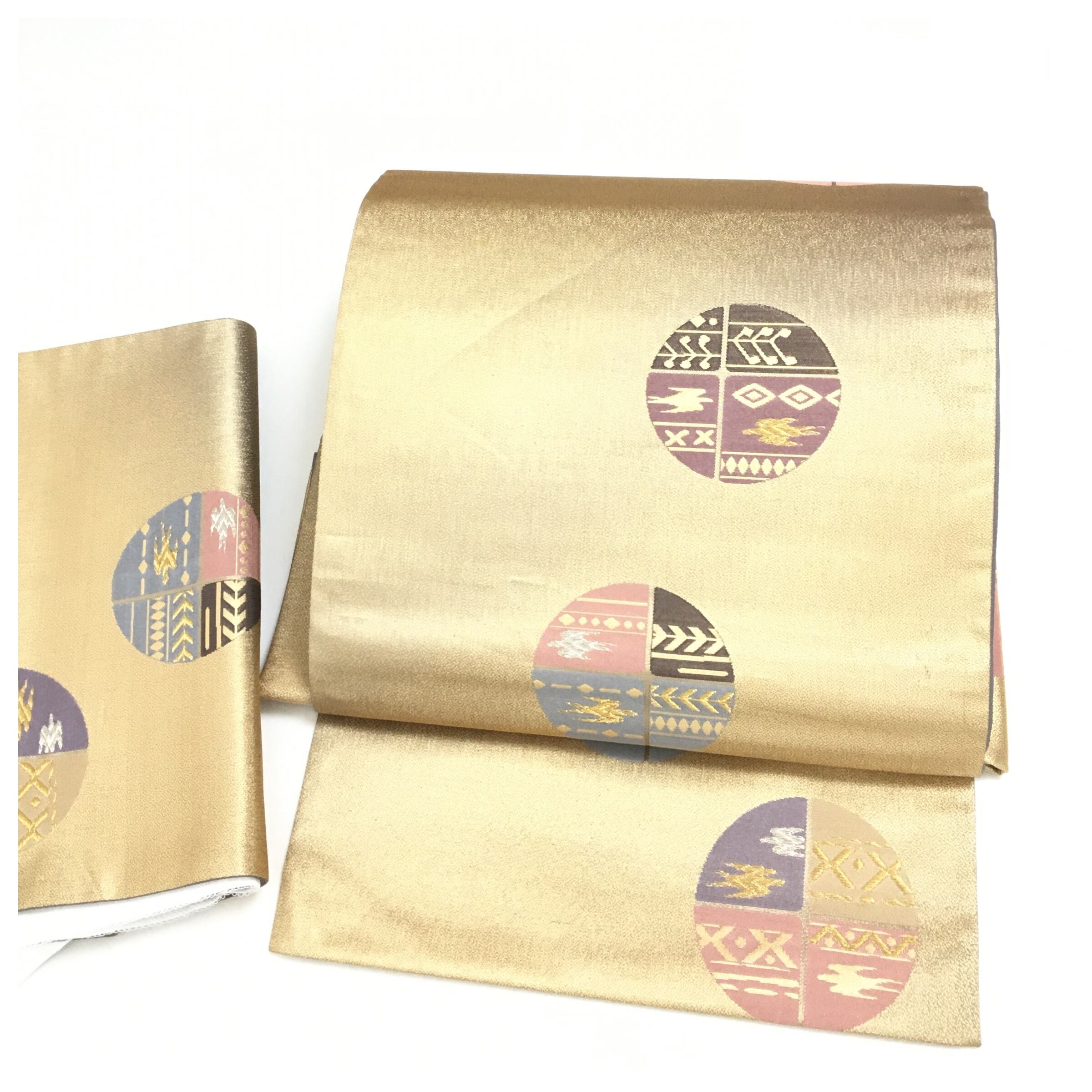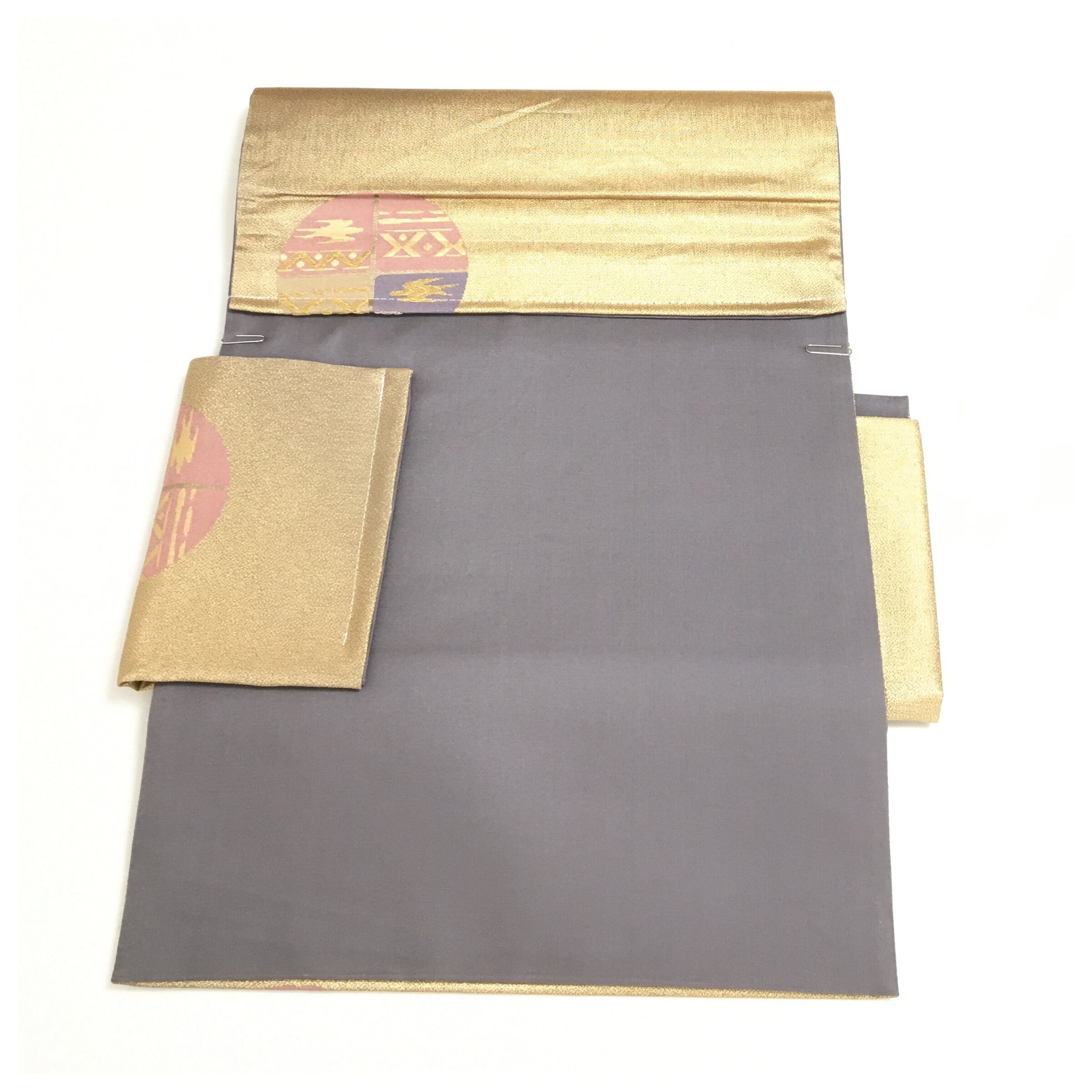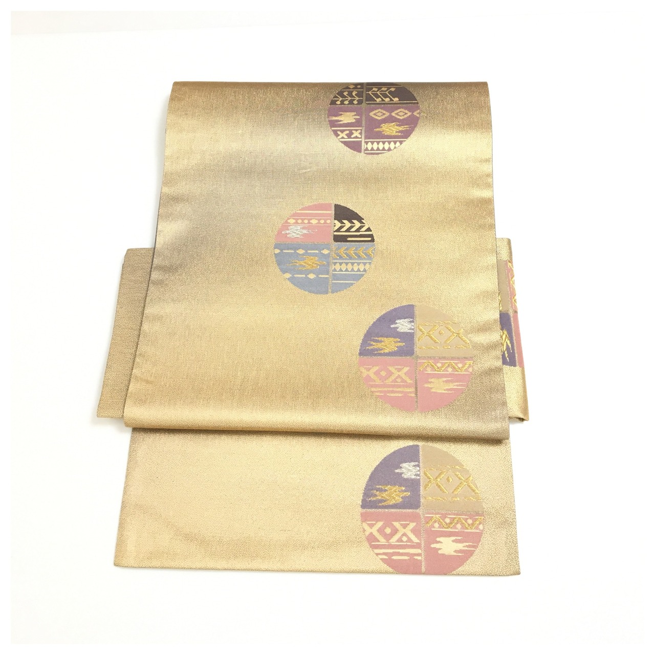 金彩に丸紋の落ち着いた色柄で着物にあわせやすい意匠です。