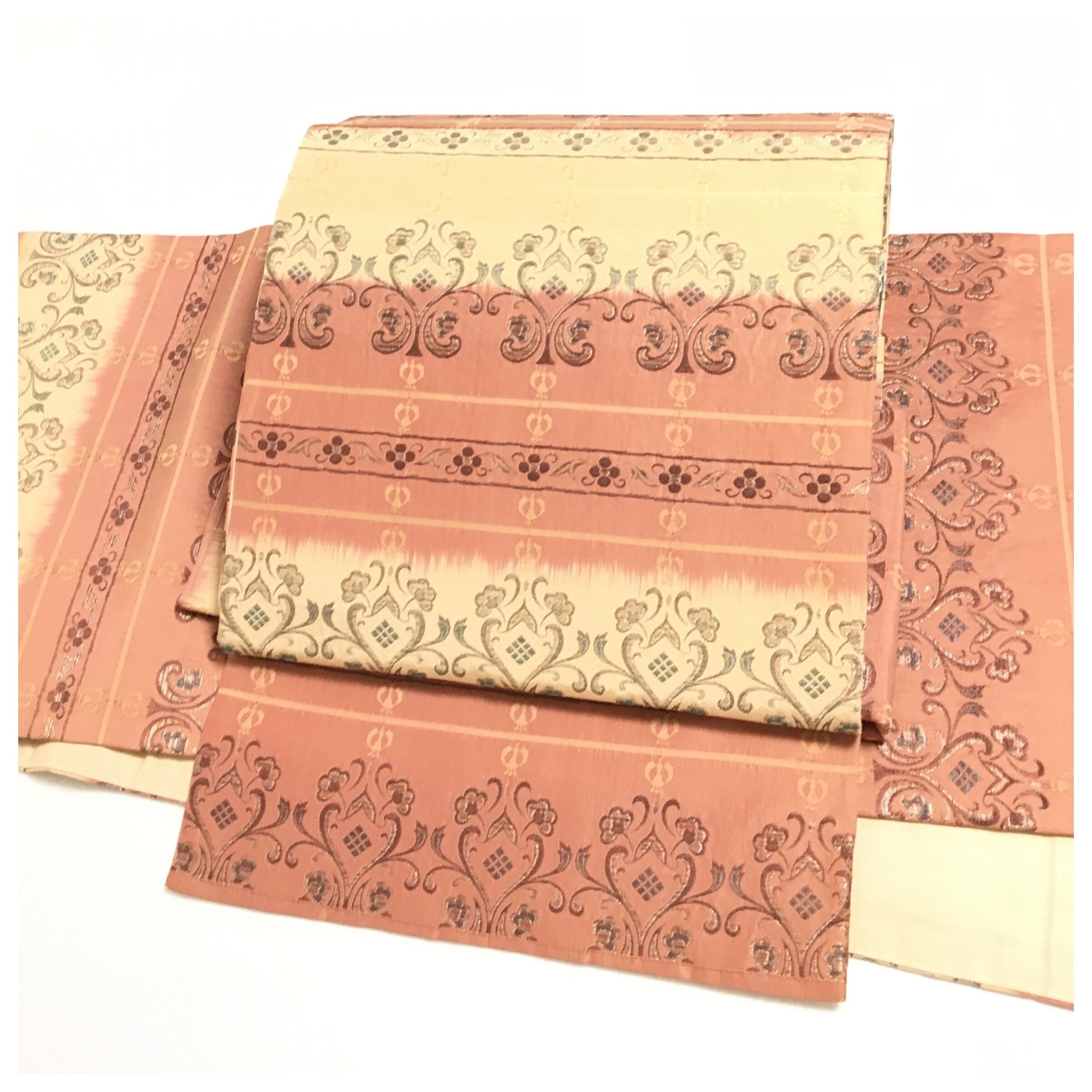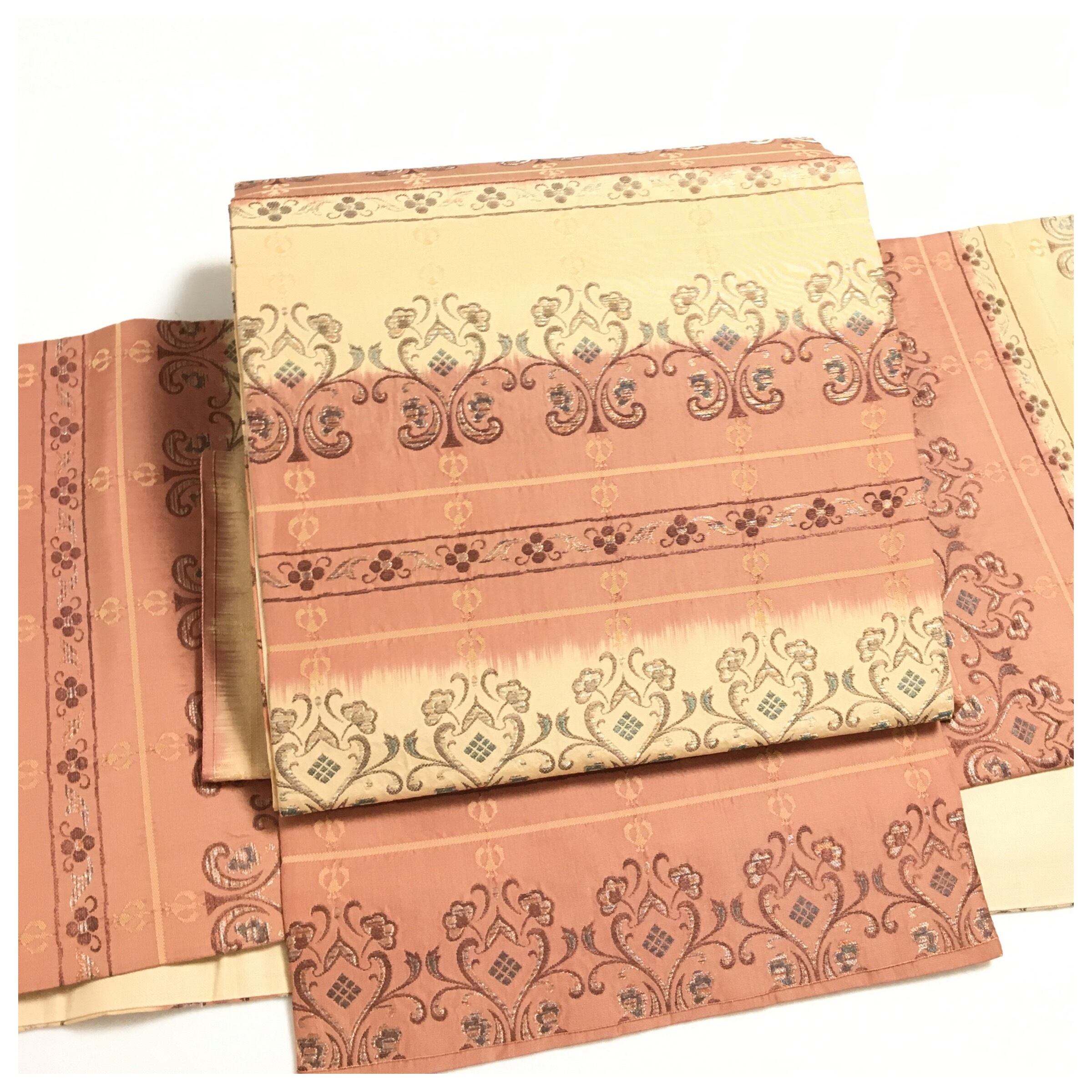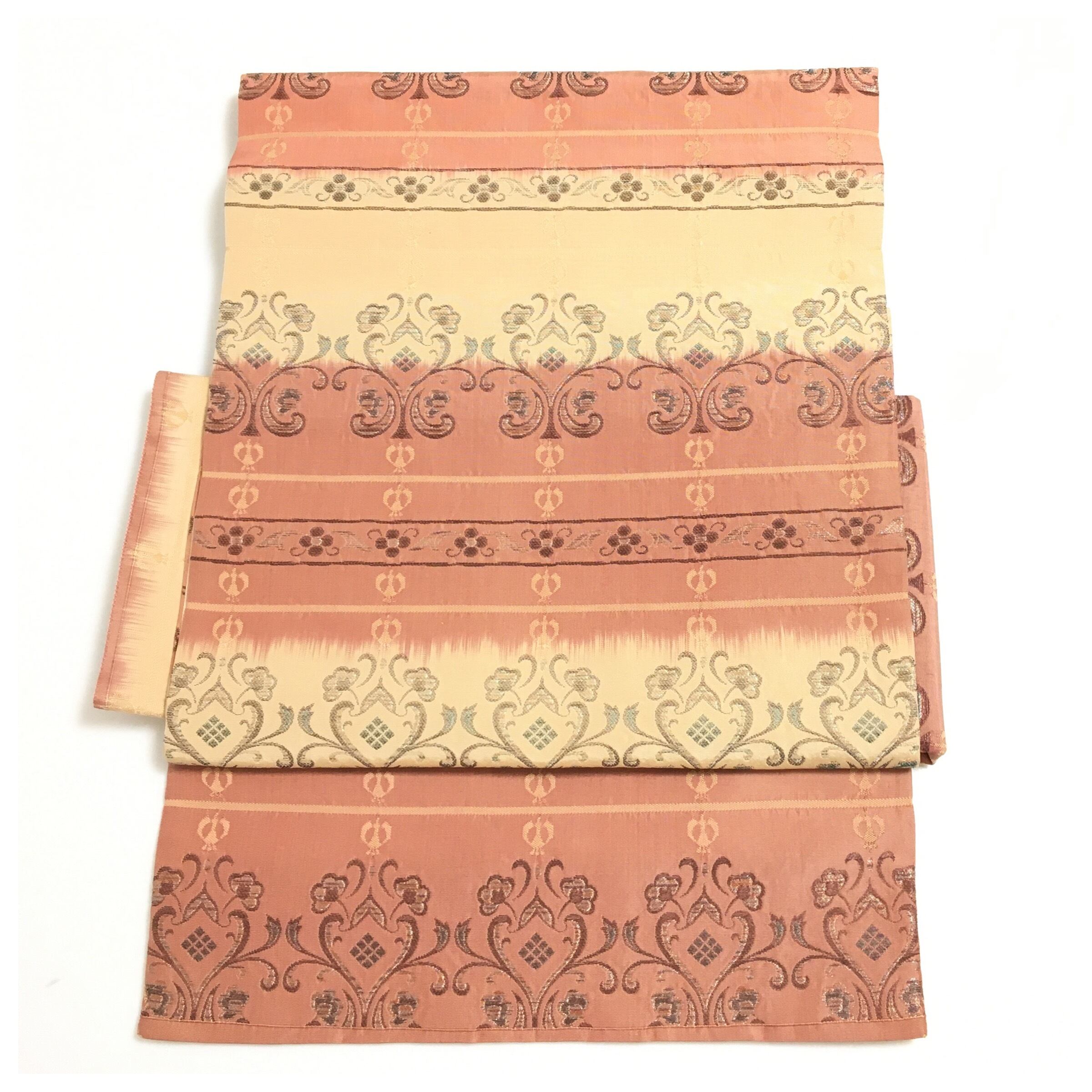 正絹 楽帯 袋帯 染分け 横段 華 二部式 織り柄 二重太鼓 作り帯 です。