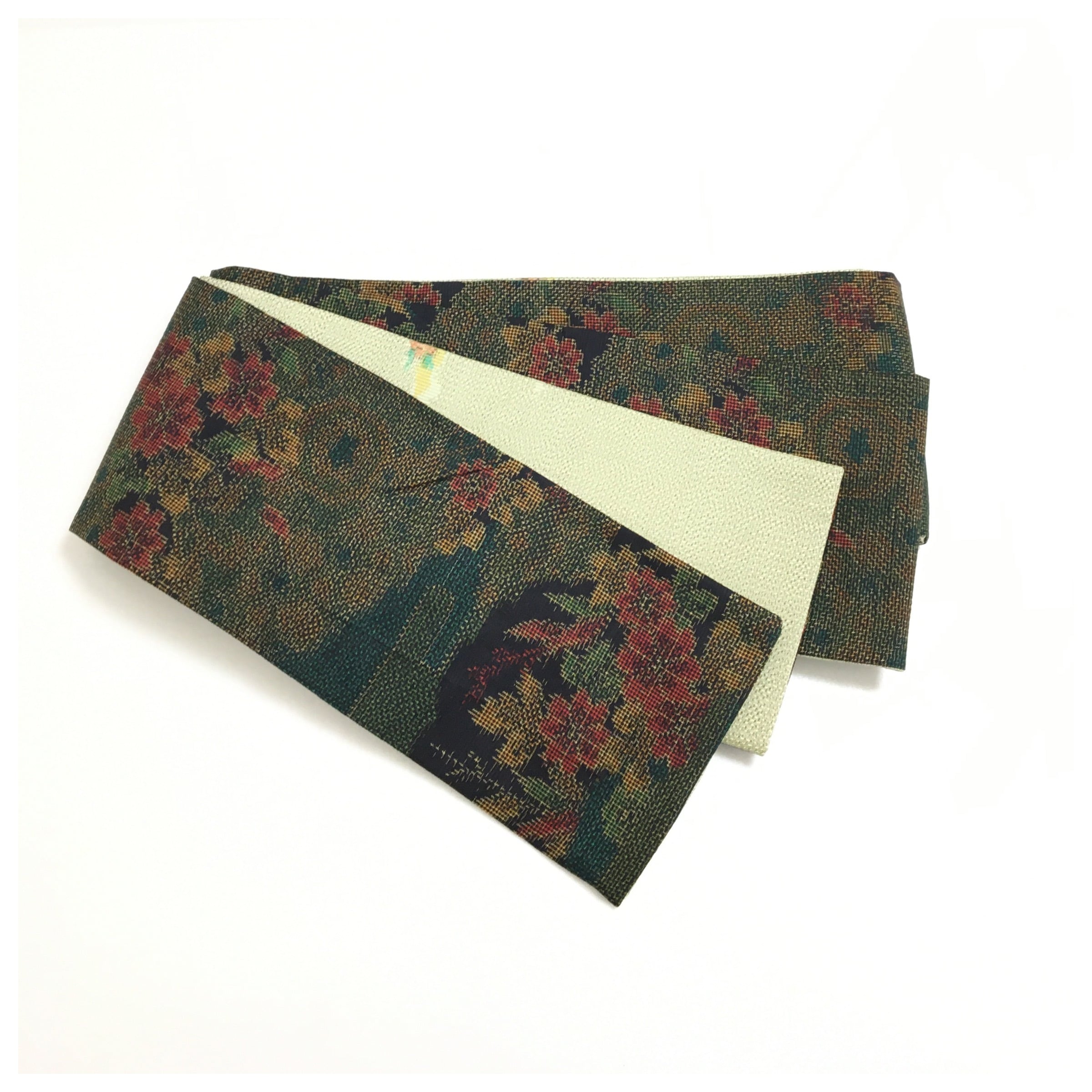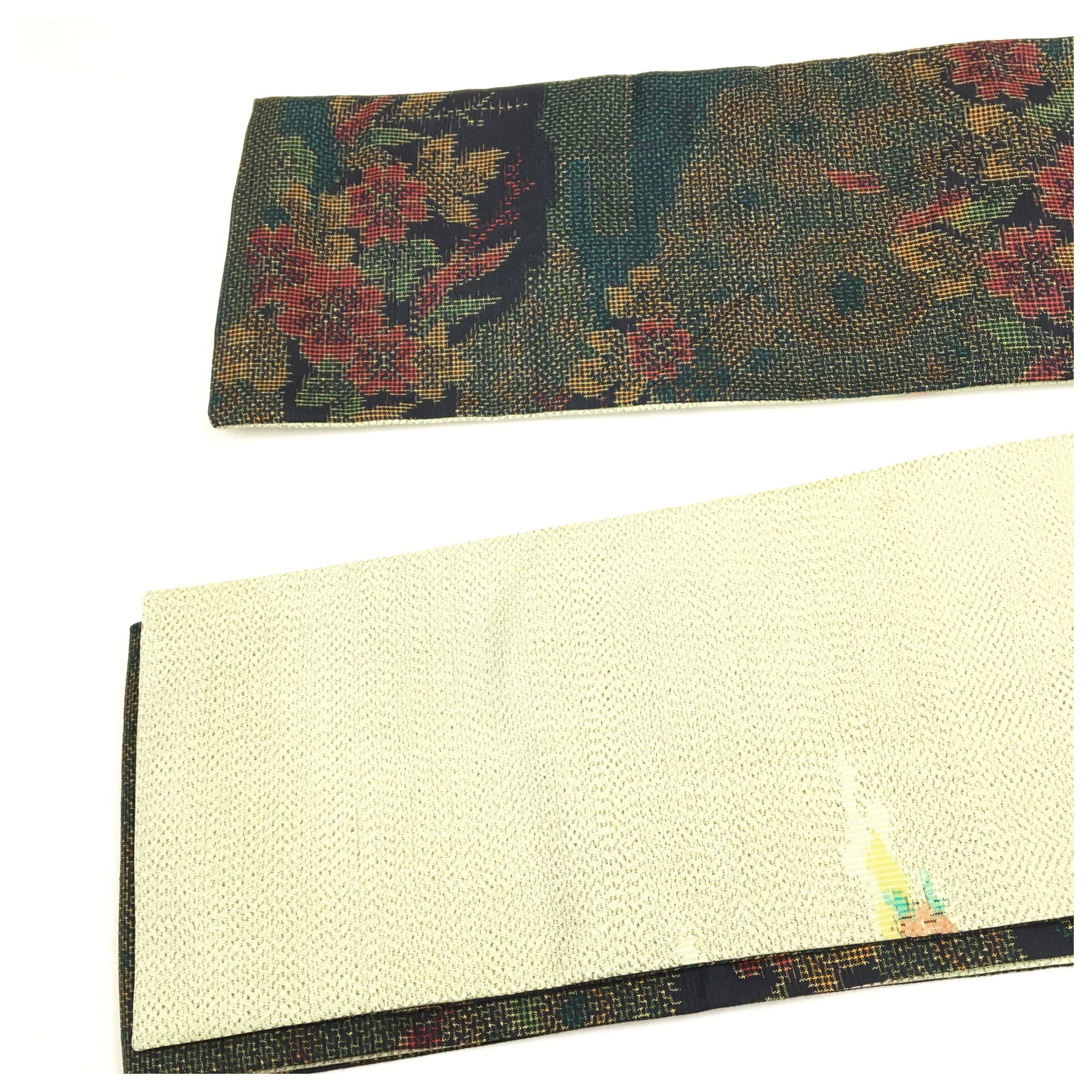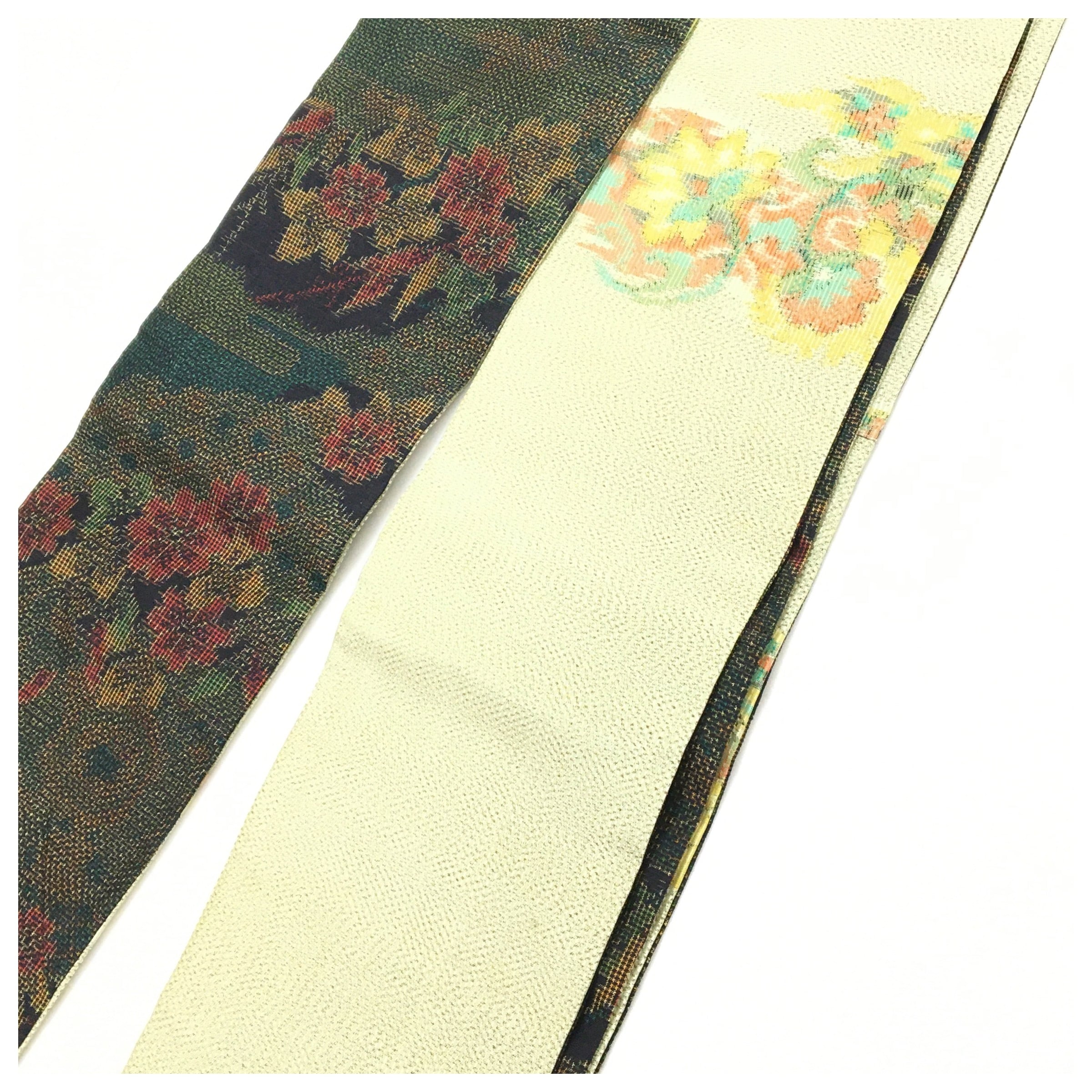 美品 上質 正絹 紬 半幅 グリーン系 両面違い 長尺460cm