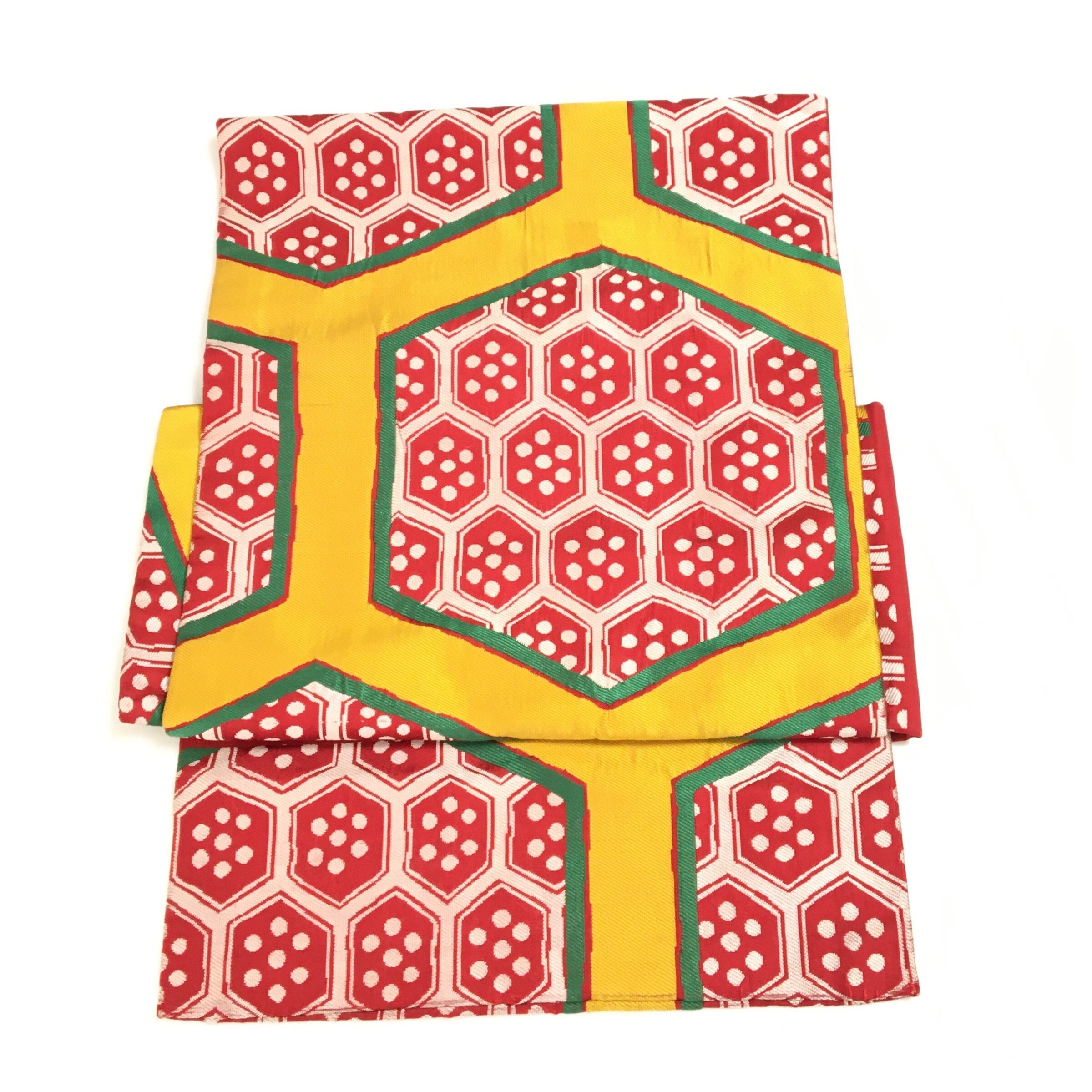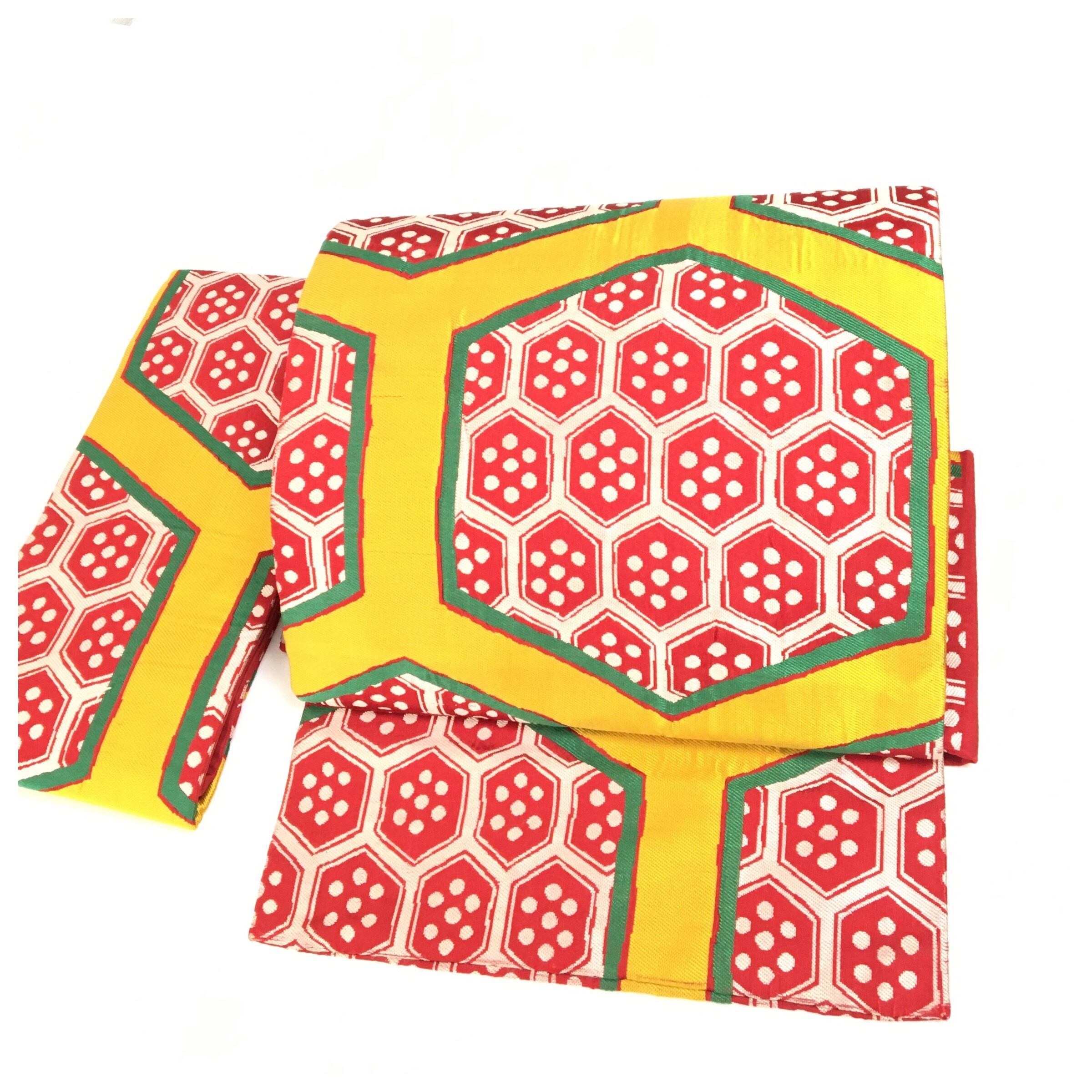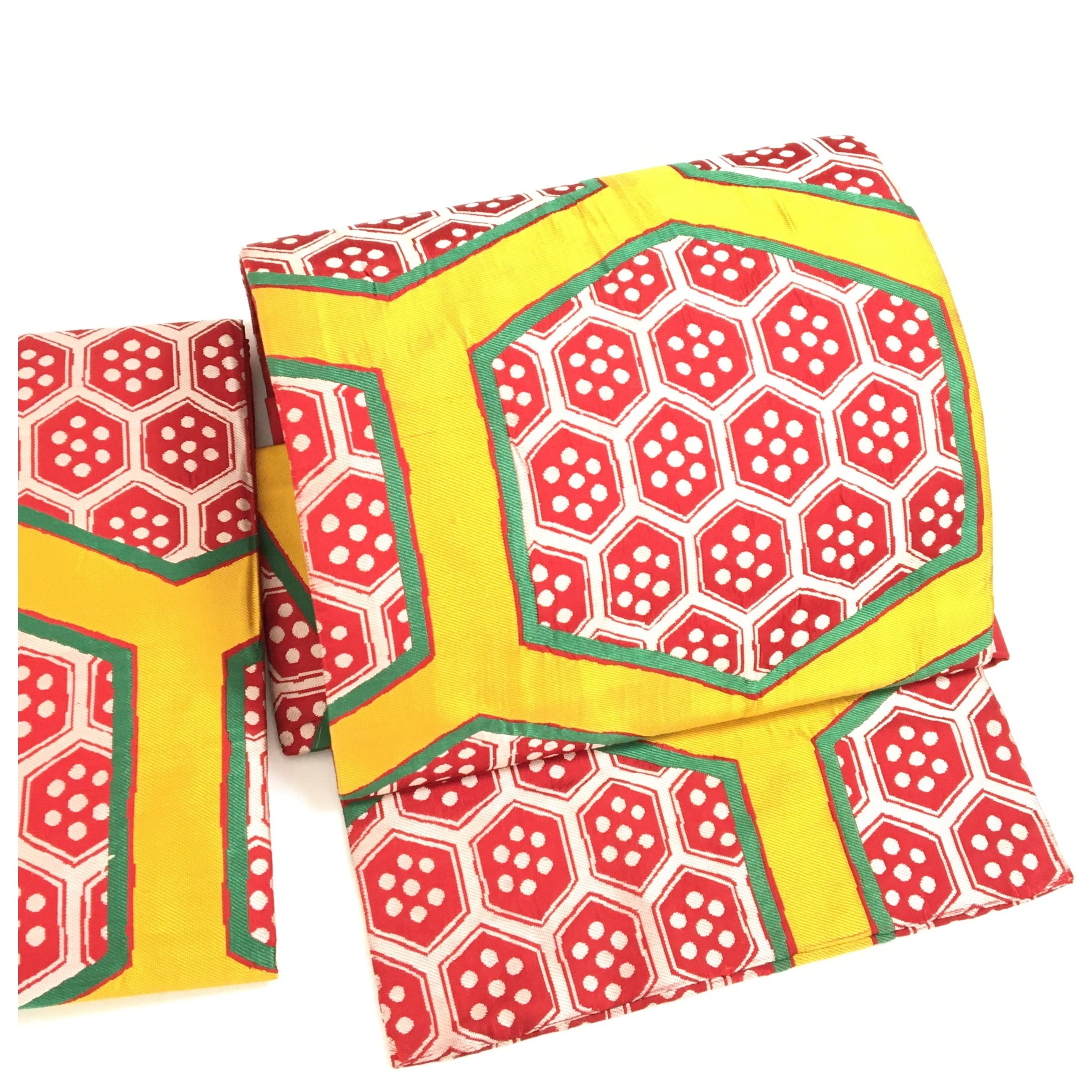 正絹 アンティーク 赤 黄色 名古屋帯 二部式 作り帯 簡単装着