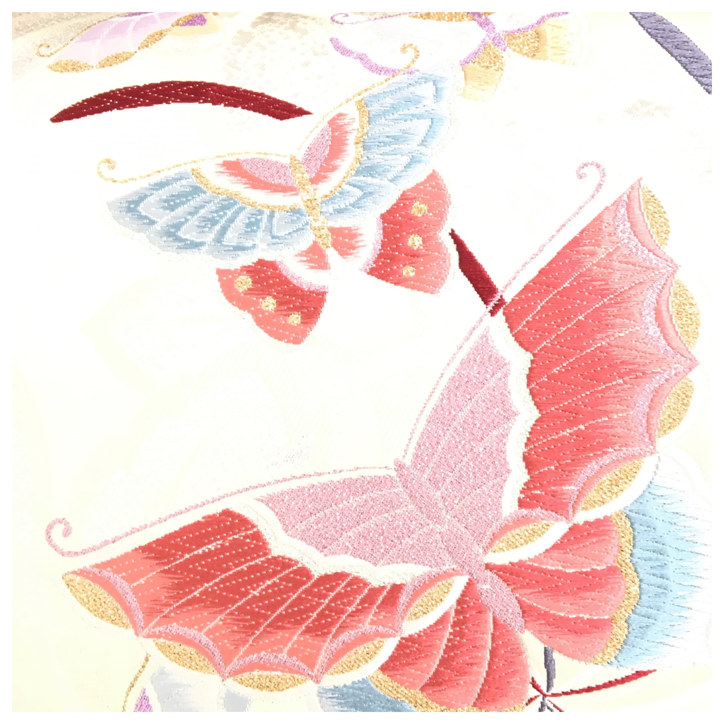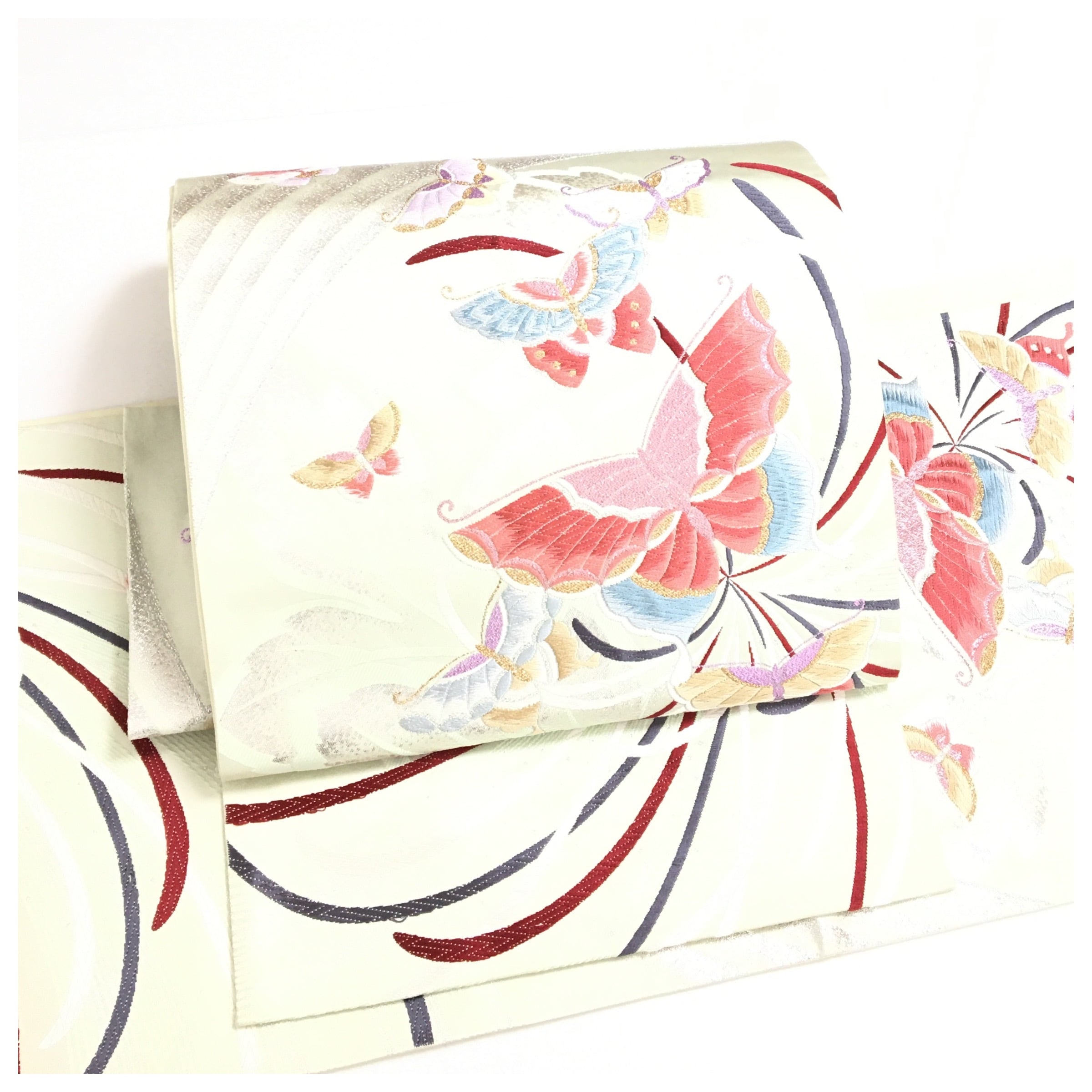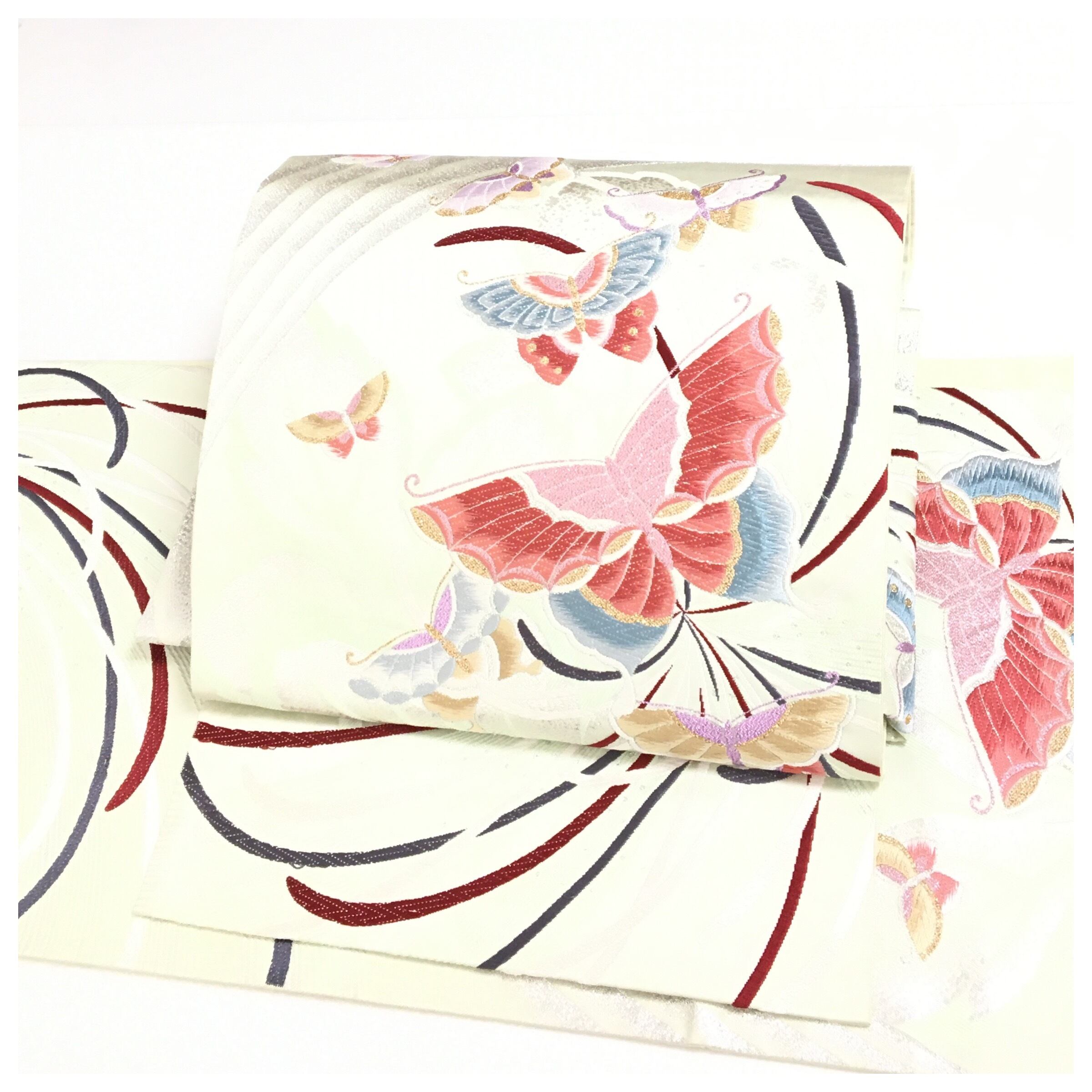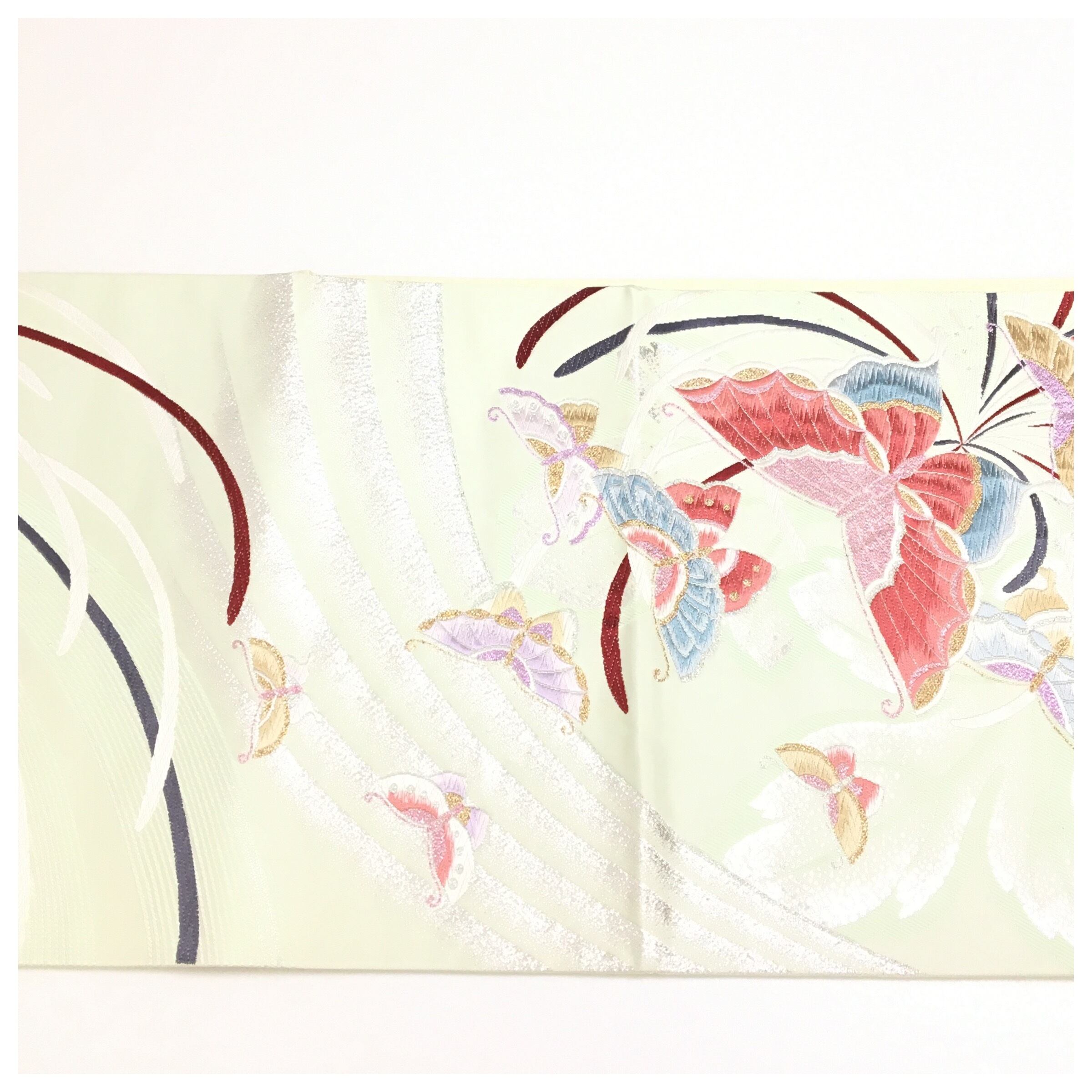 正絹 楽帯 袋帯 淡いグリーン 蝶々柄 二重太鼓 作り帯 です。