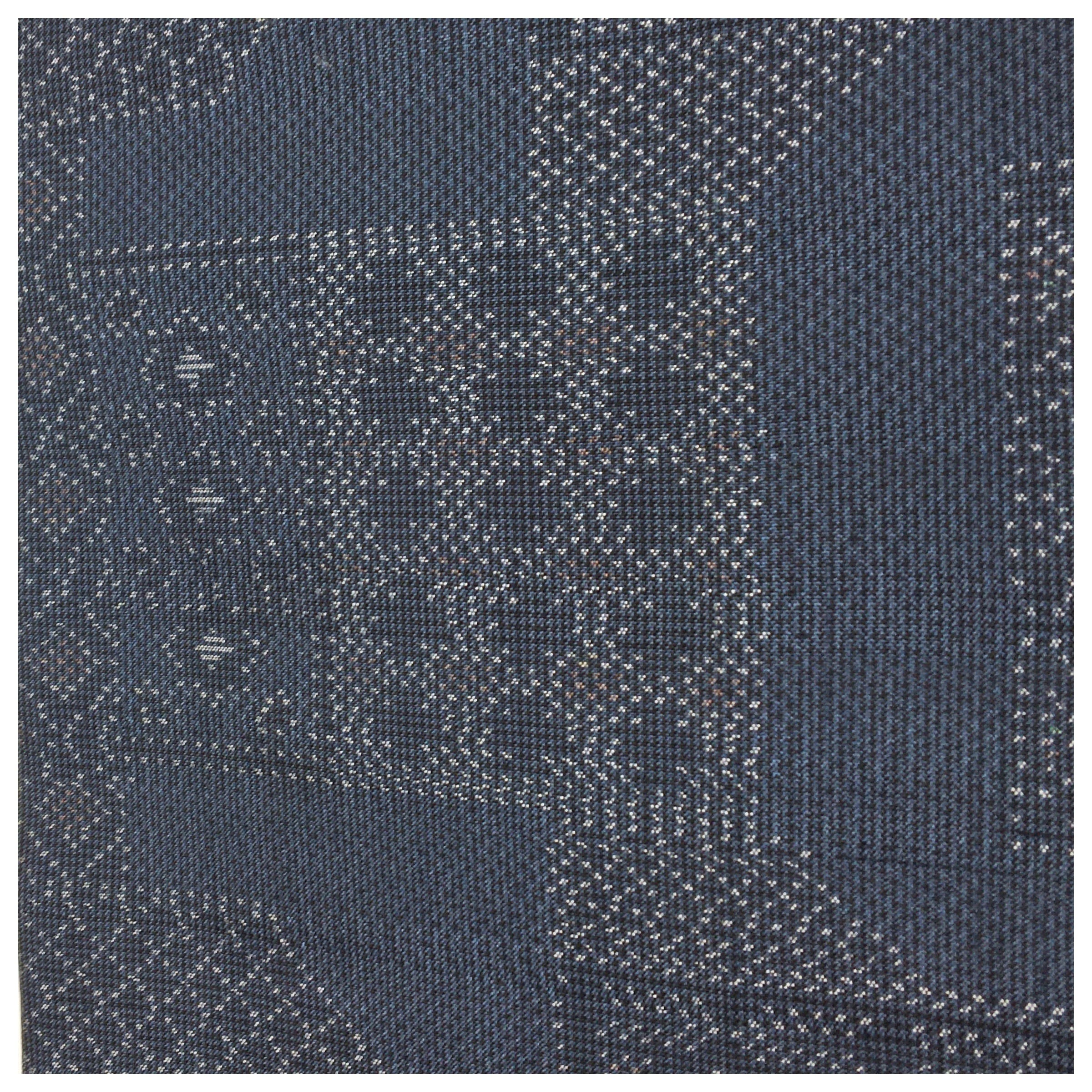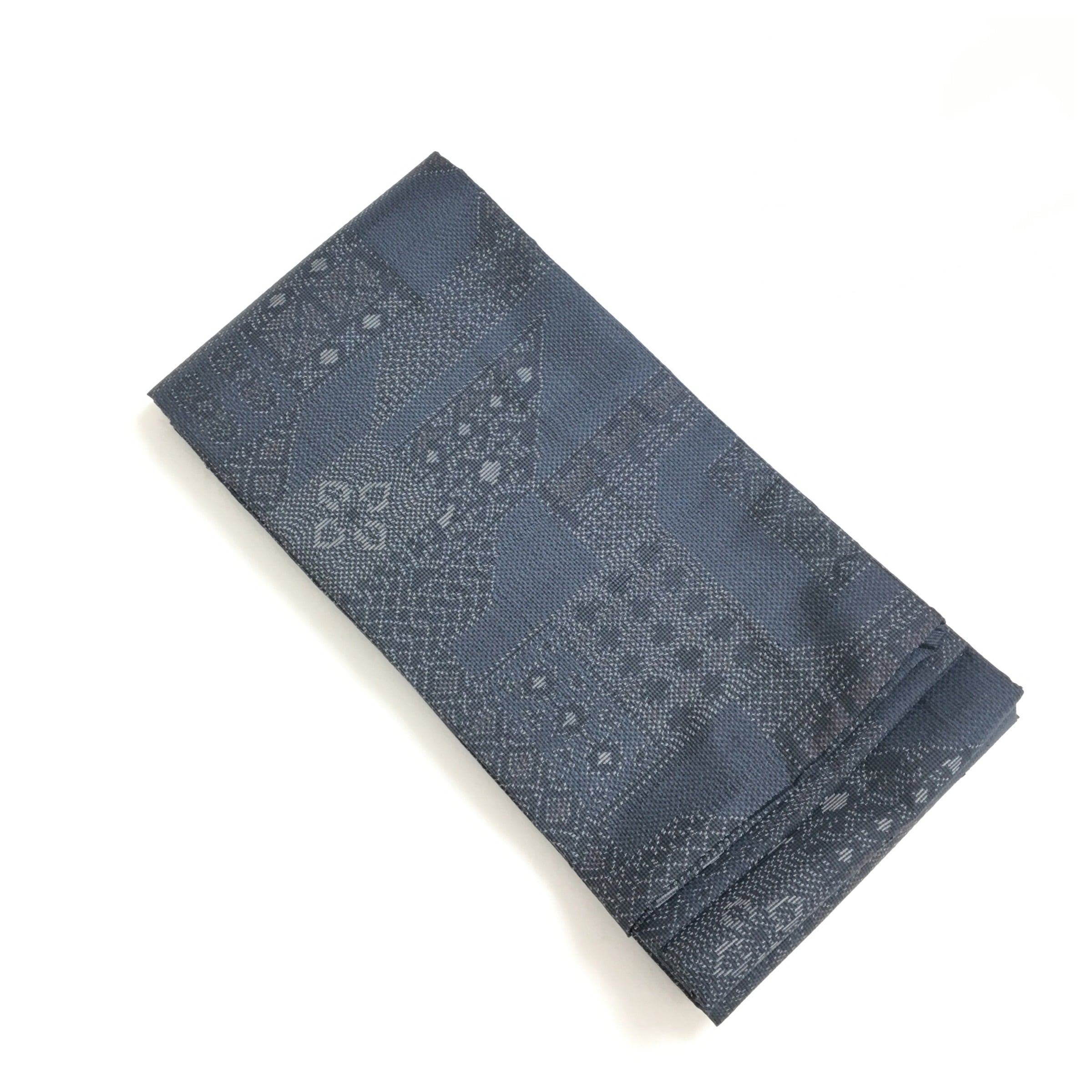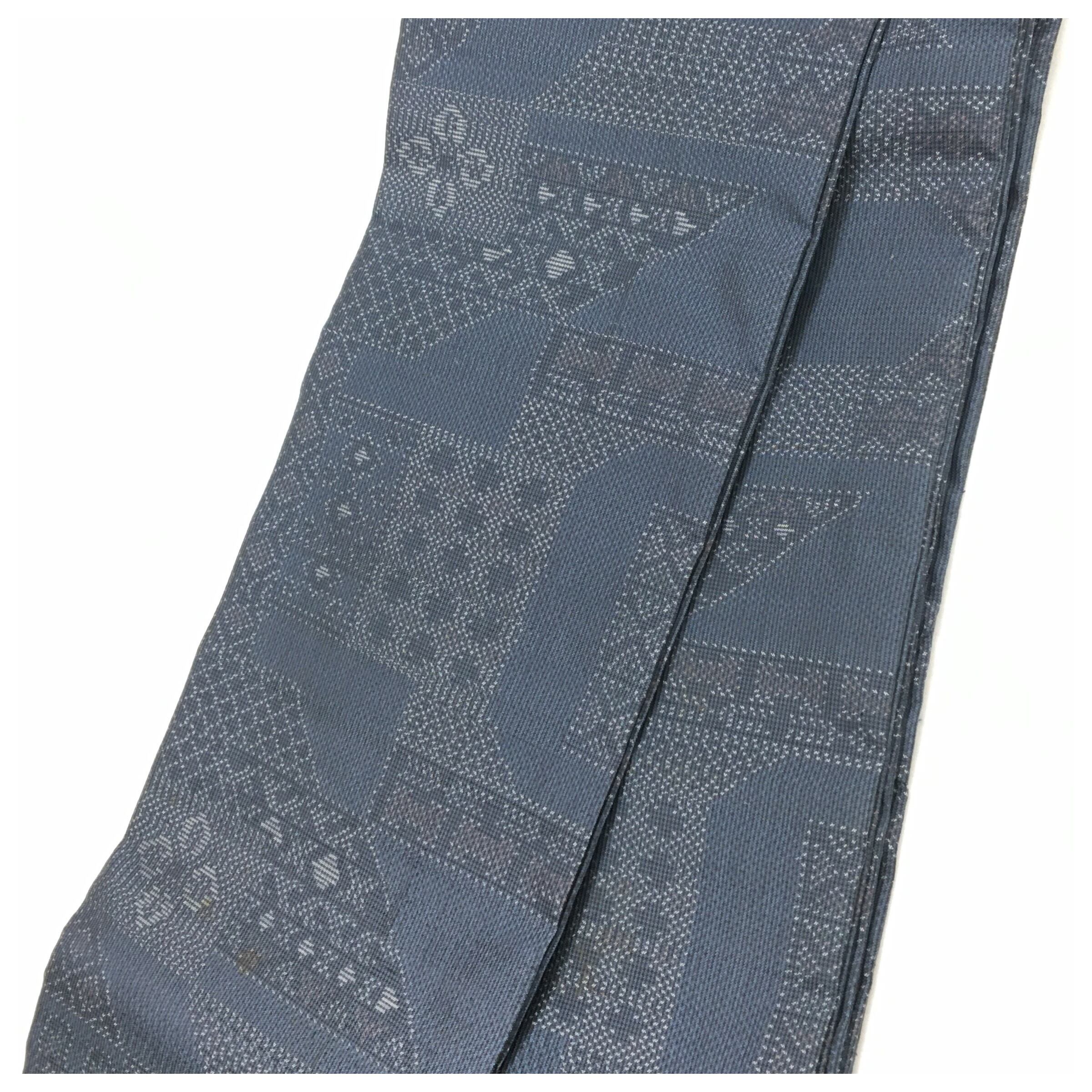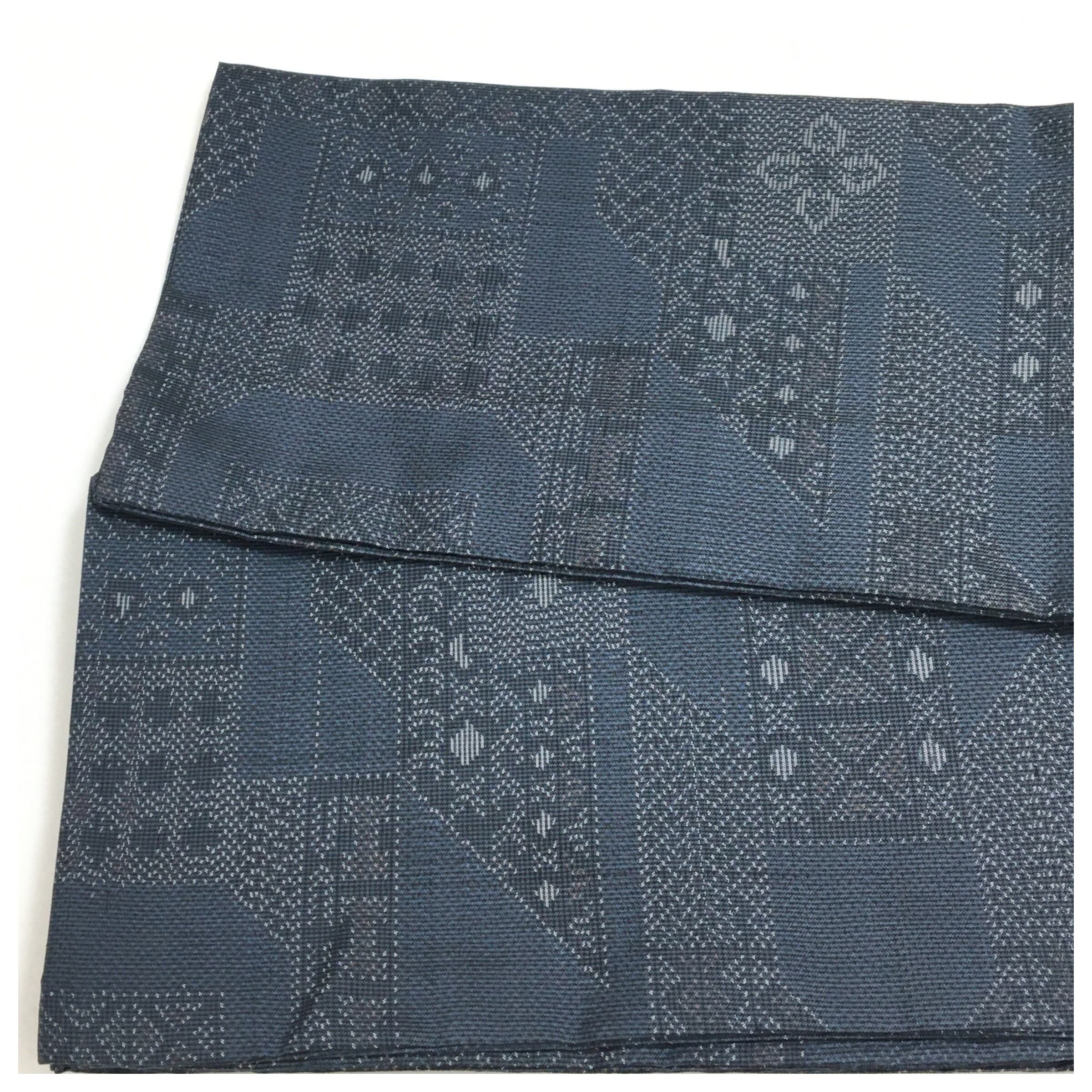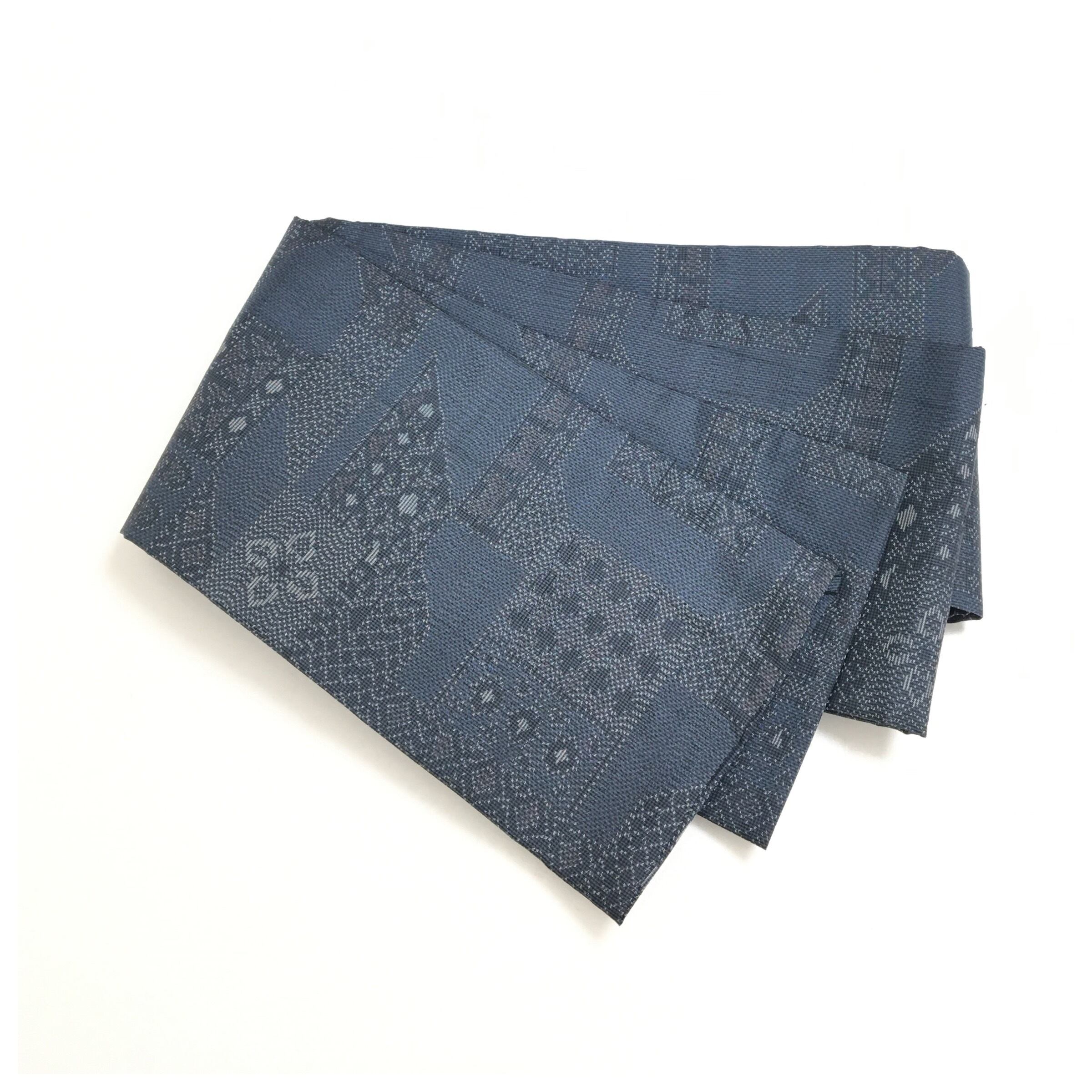 正絹 半幅帯 紺 お召 幾何学模様 個性派 長尺400 中古品 です。