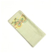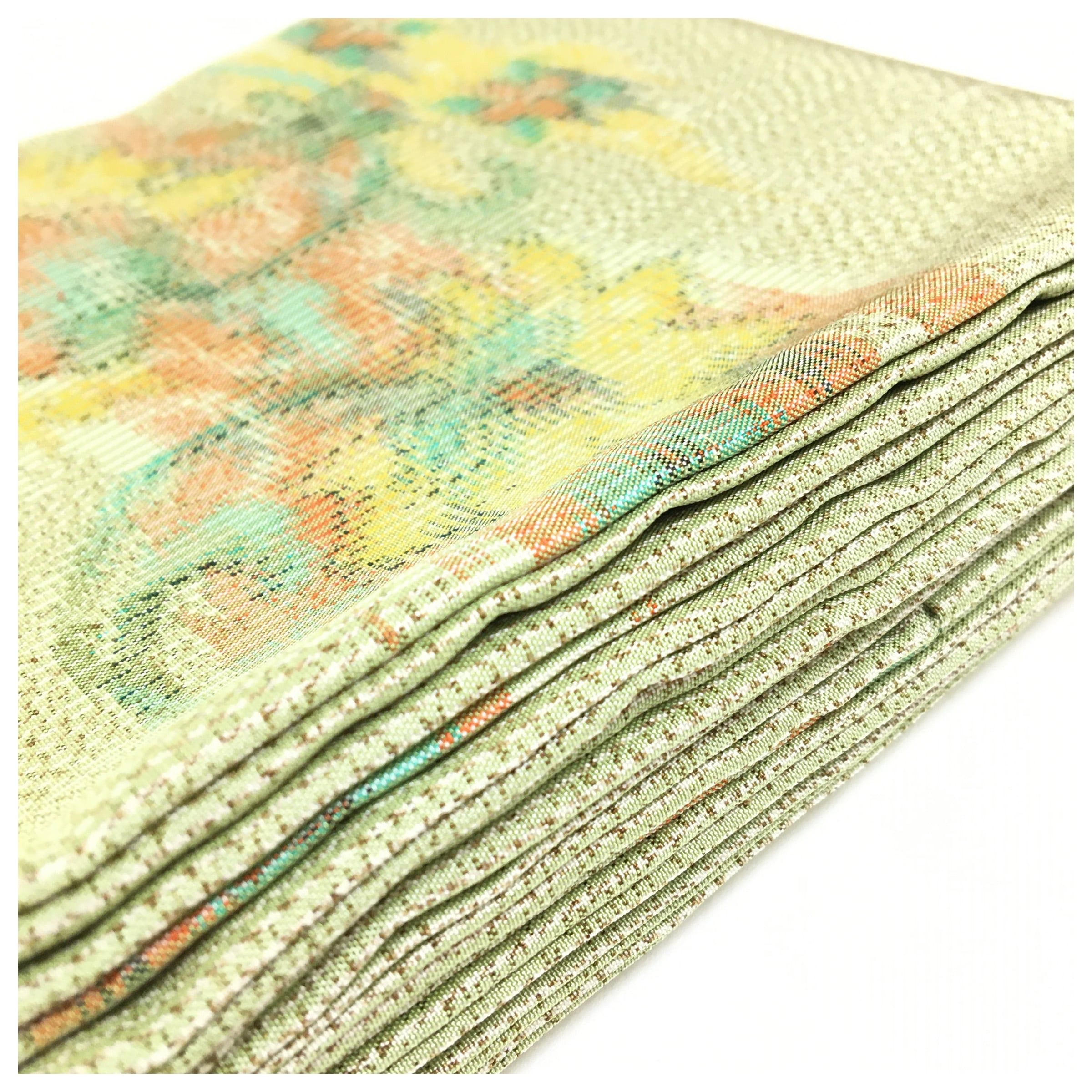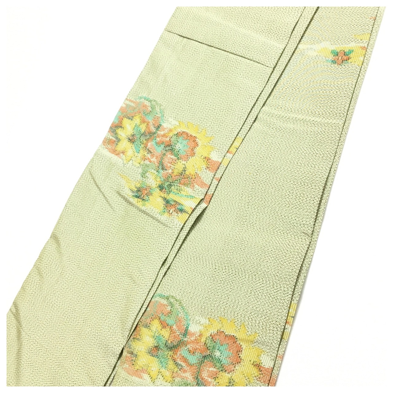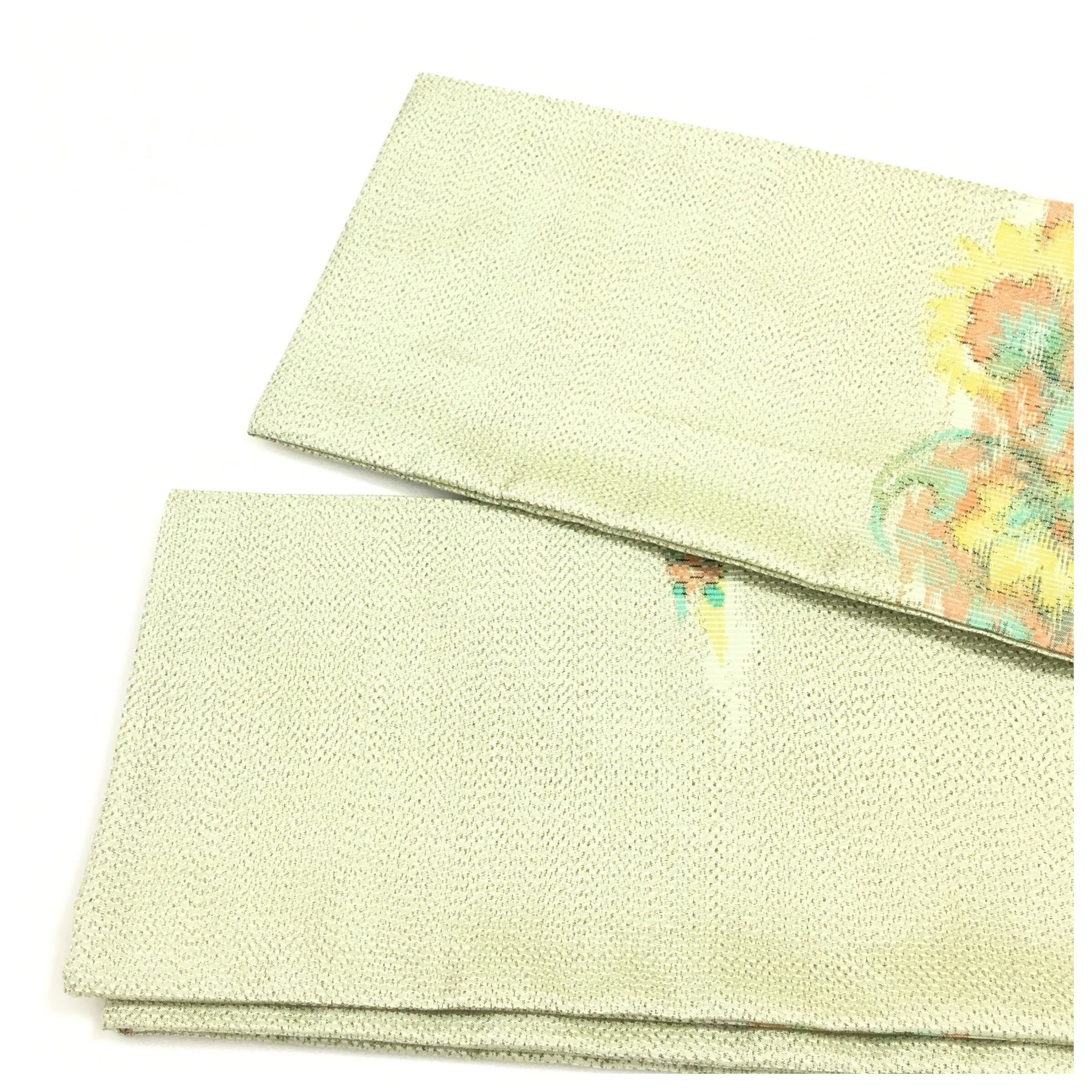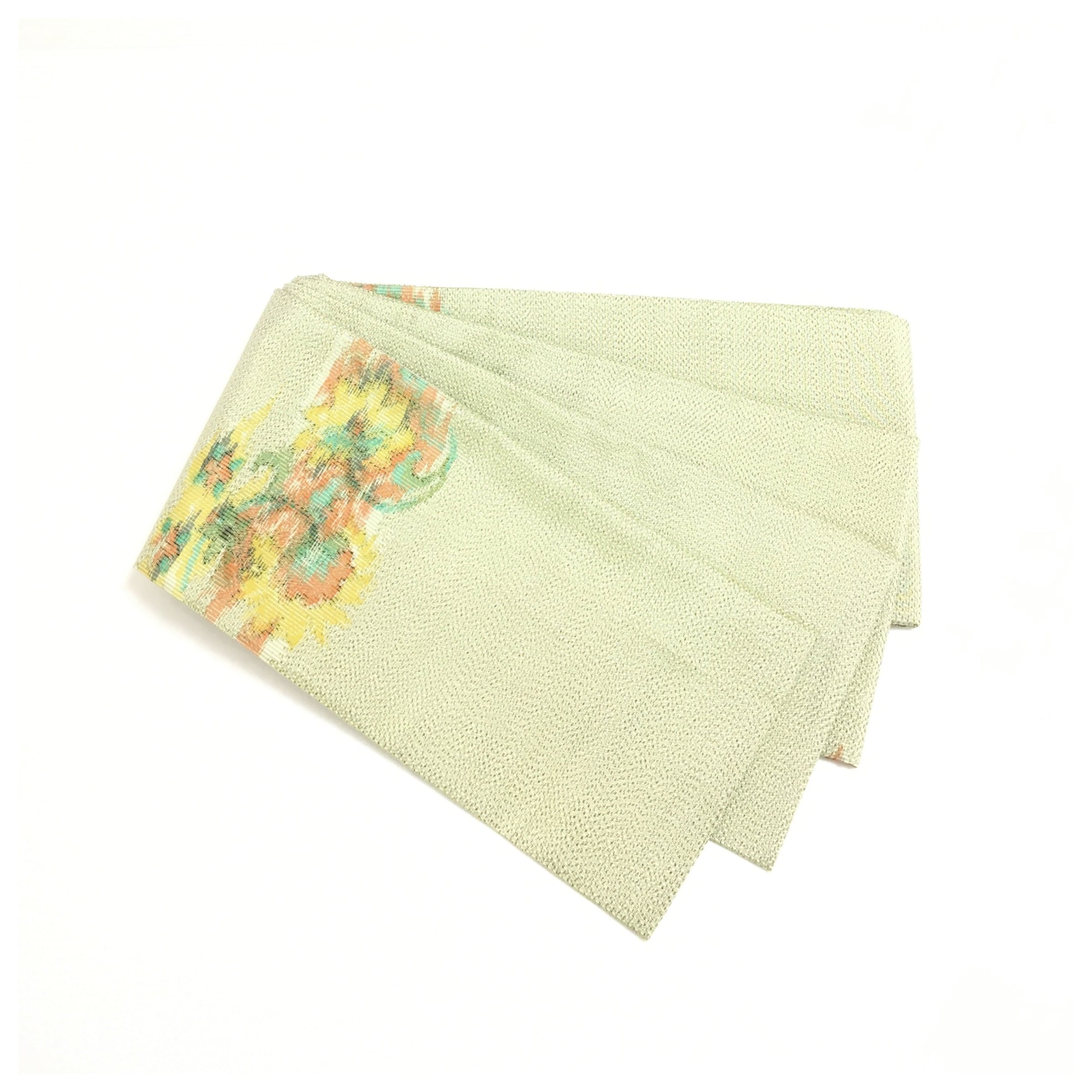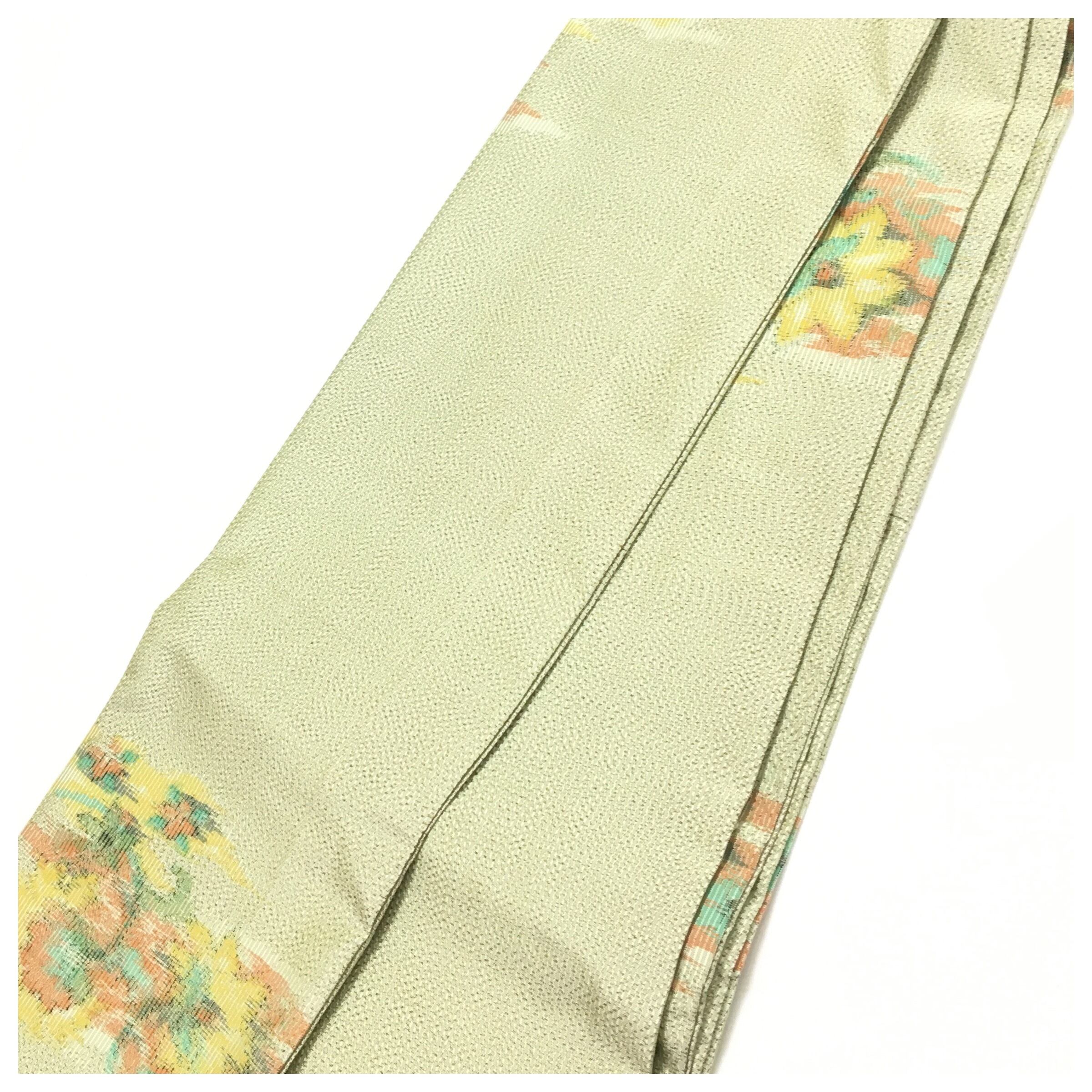 美品 正絹 紬 半幅帯 薄黄緑 花柄 全通 個性派 長尺412 中古品 です。