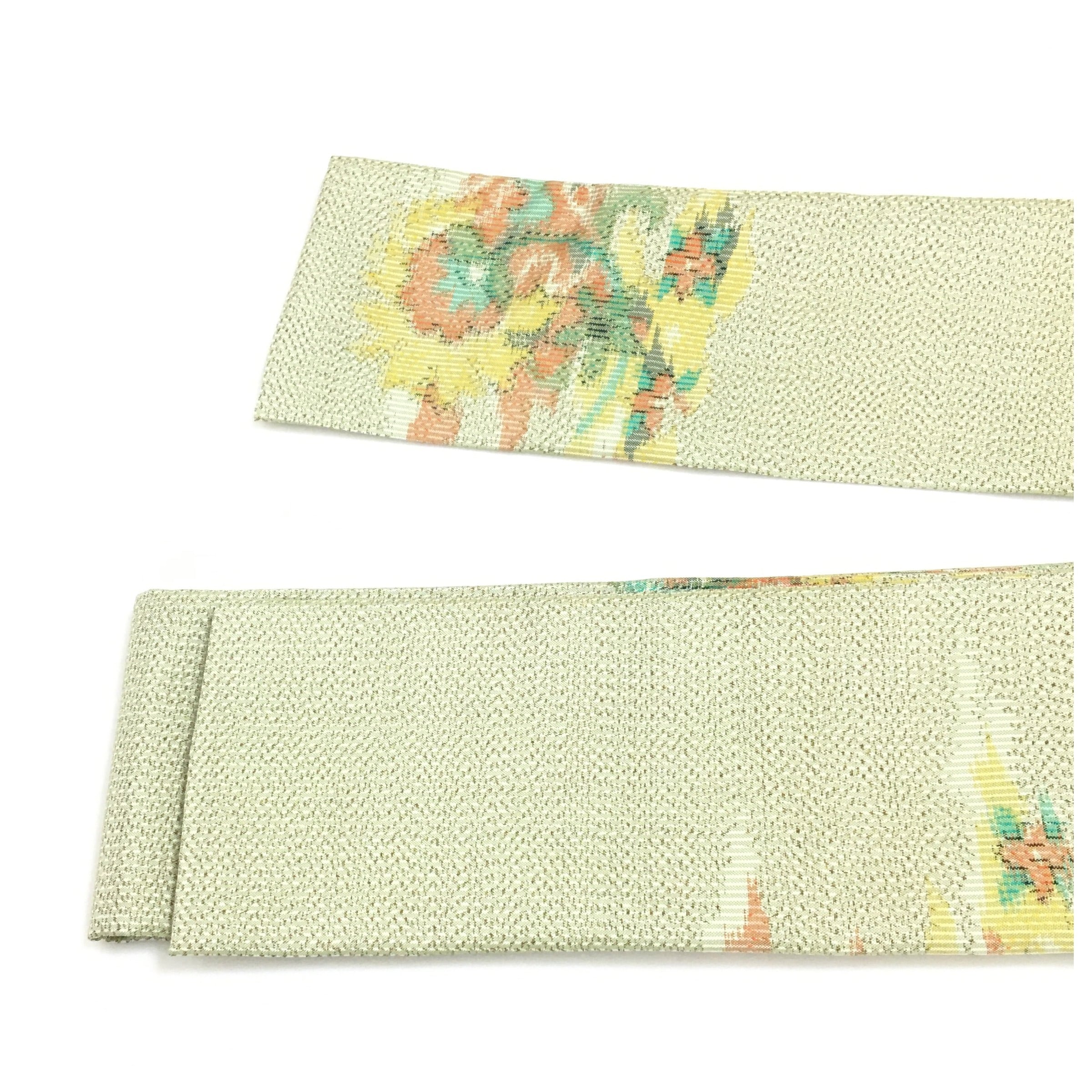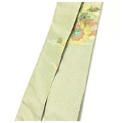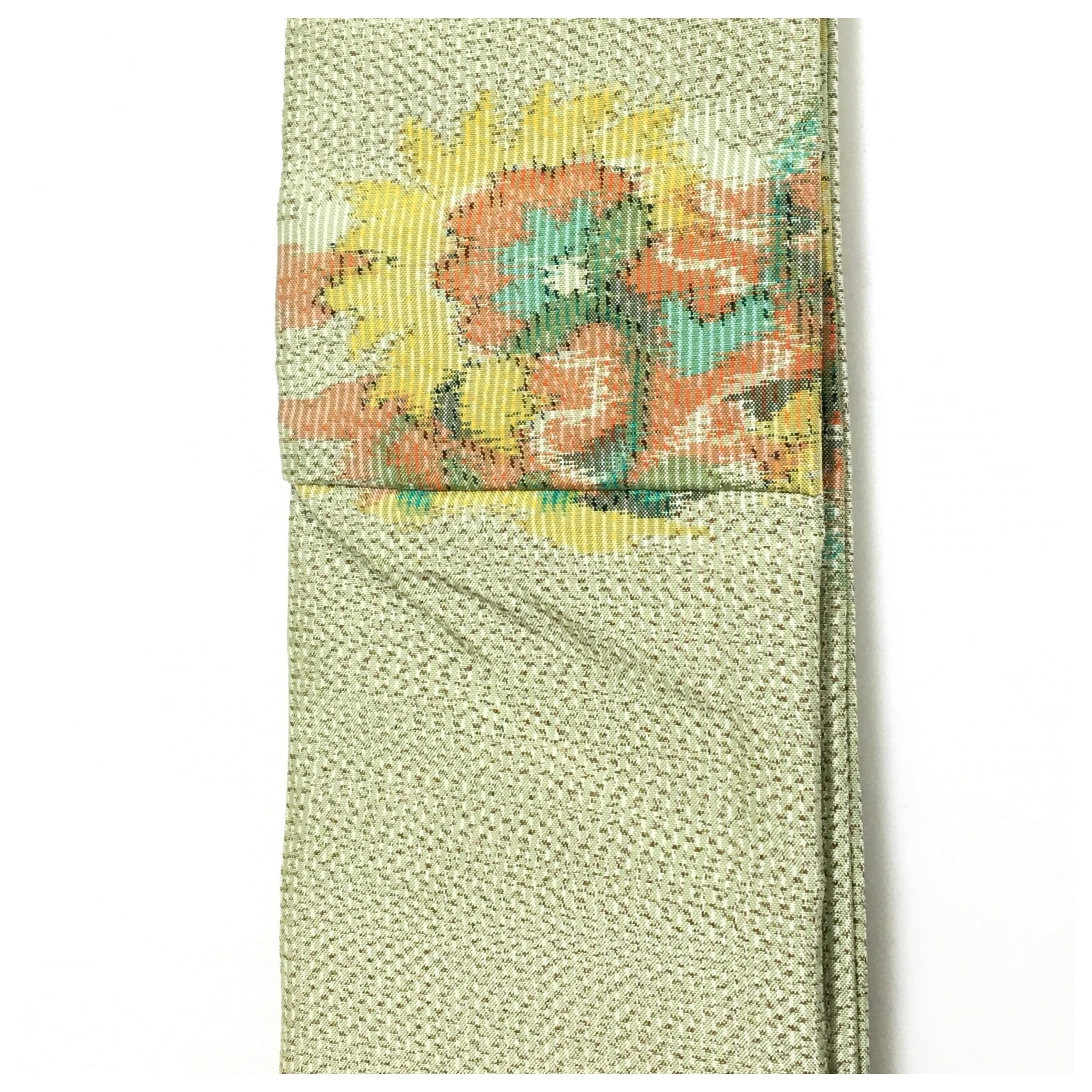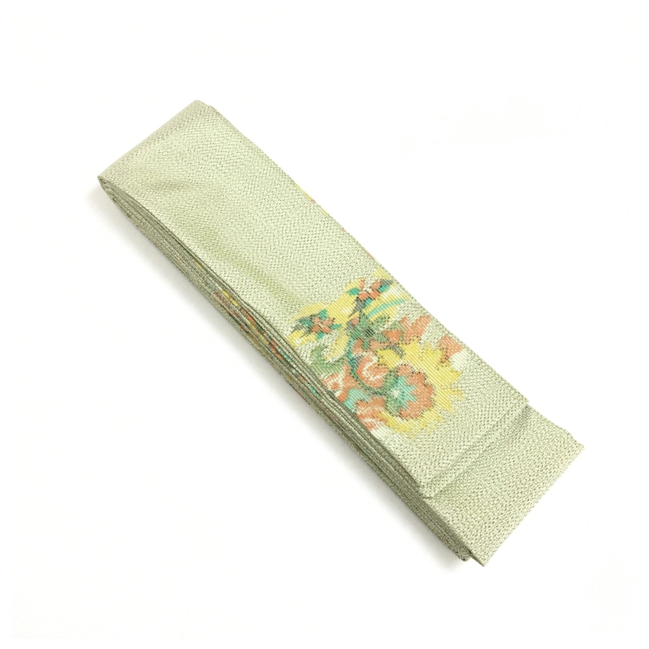 正絹 角帯 男物 薄い黄緑 抽象花模様 個性派 男物 長尺430 巾9.5 です。