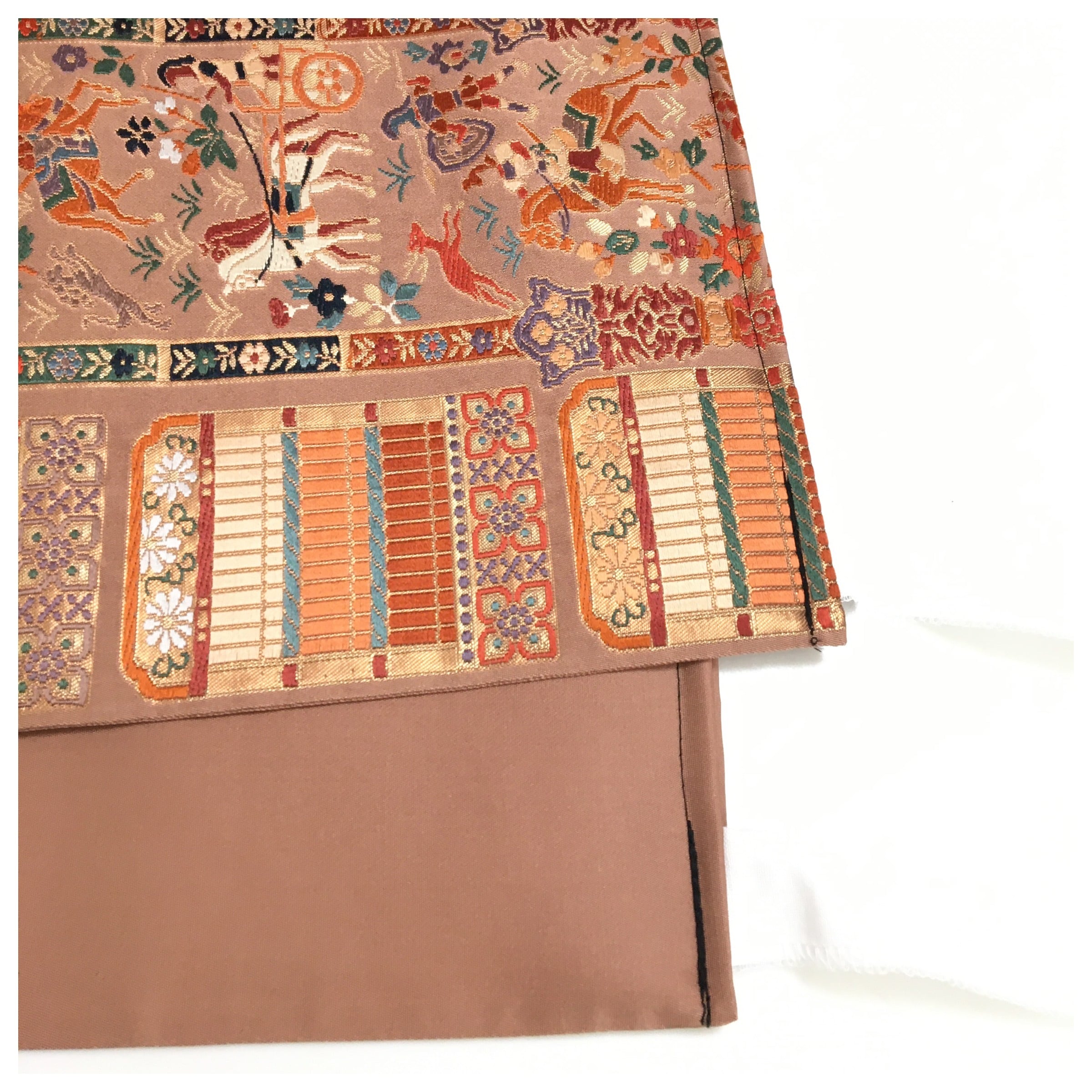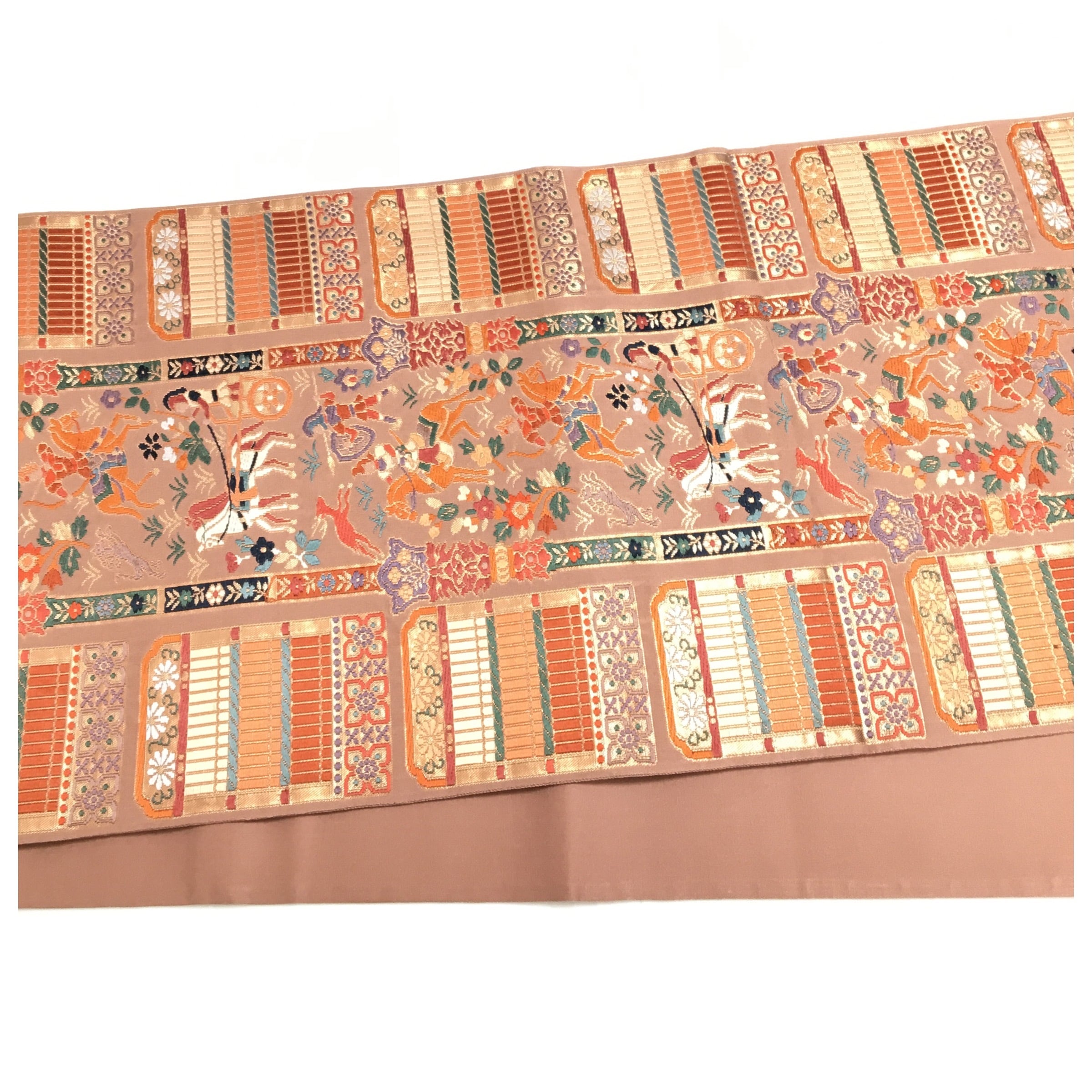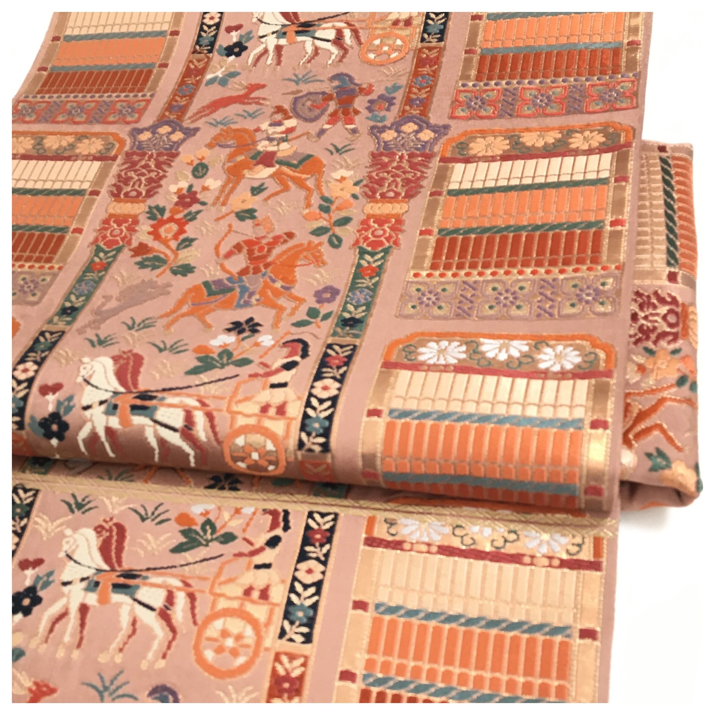 正絹 楽帯 袋帯 薄い茶 人物柄 二重太鼓 作り帯 です。