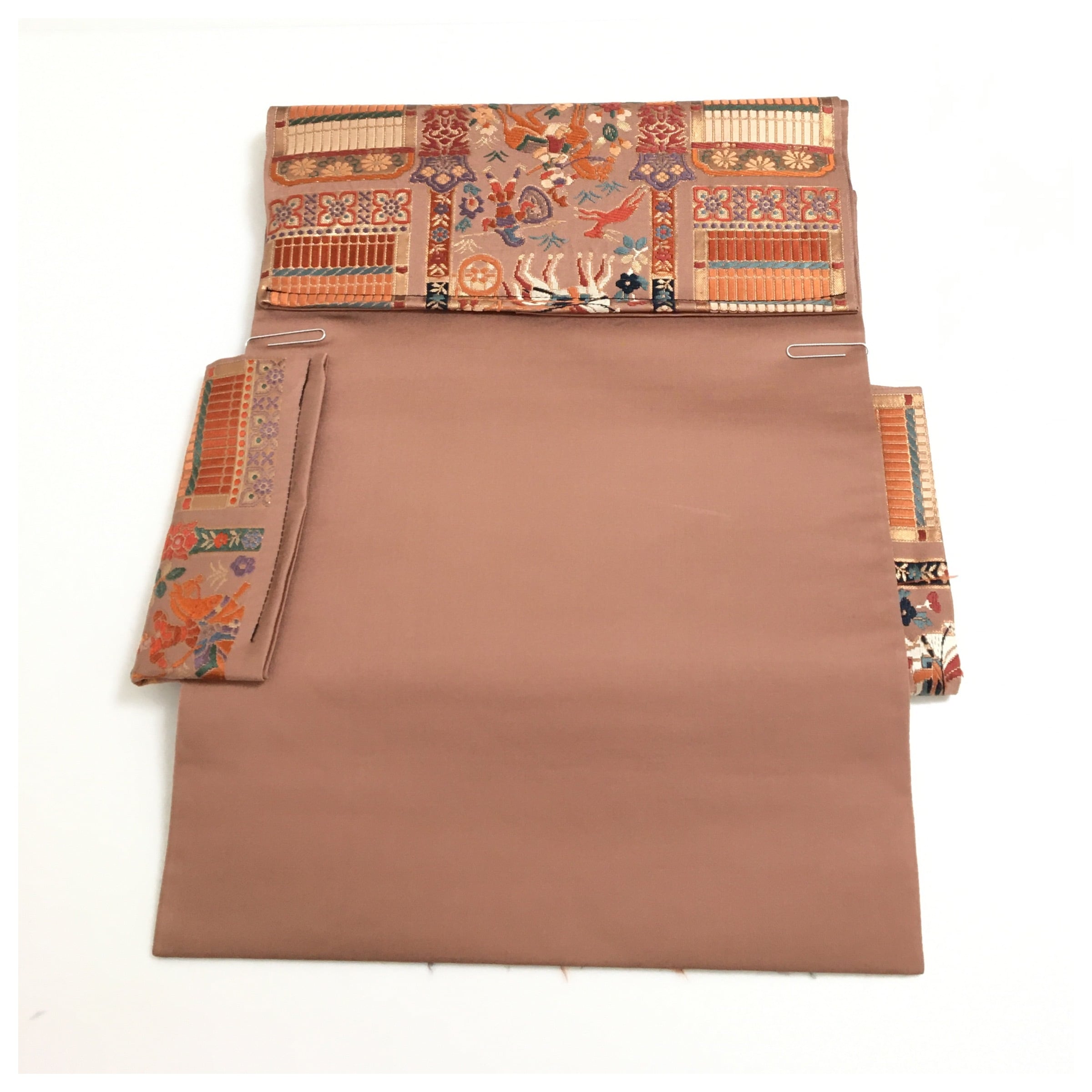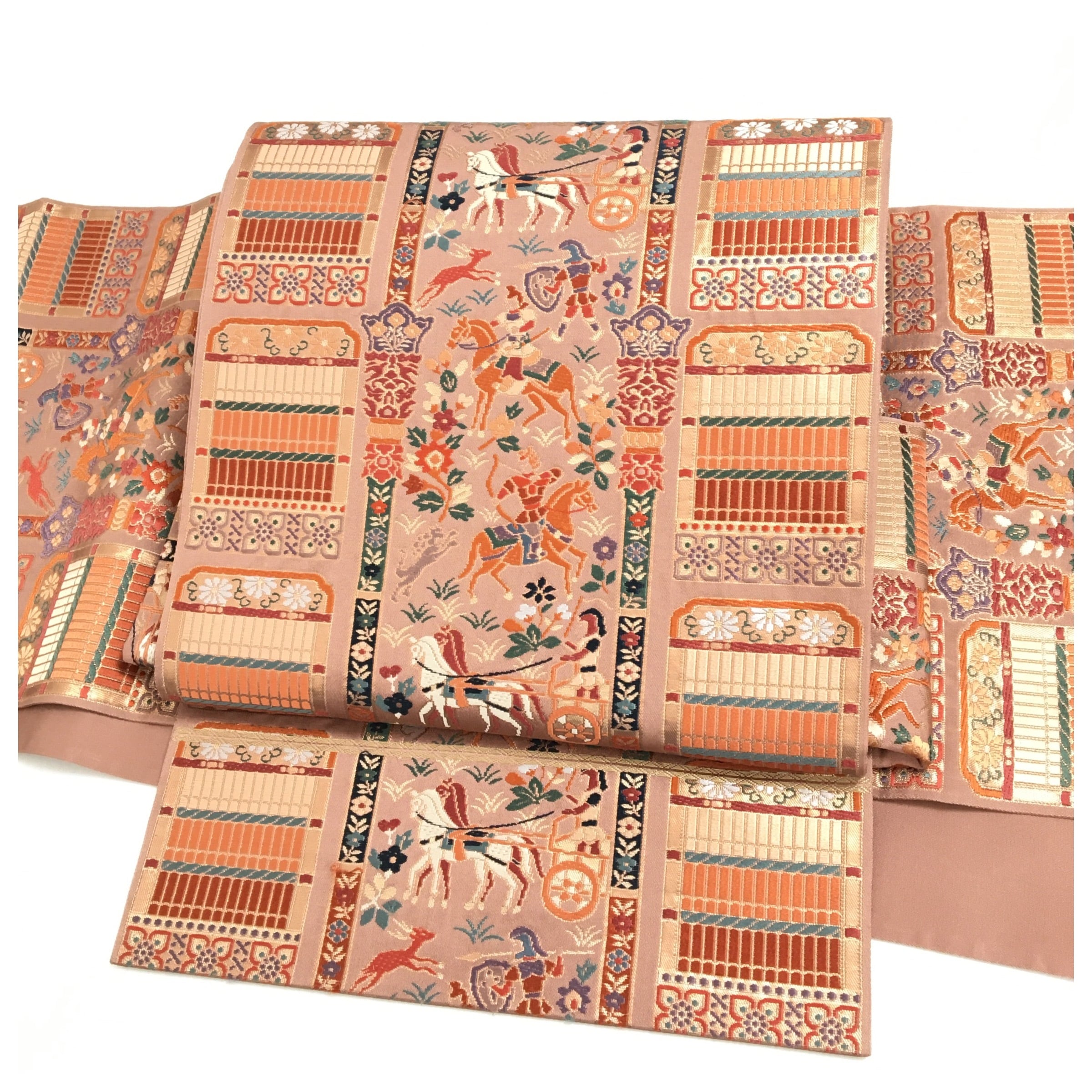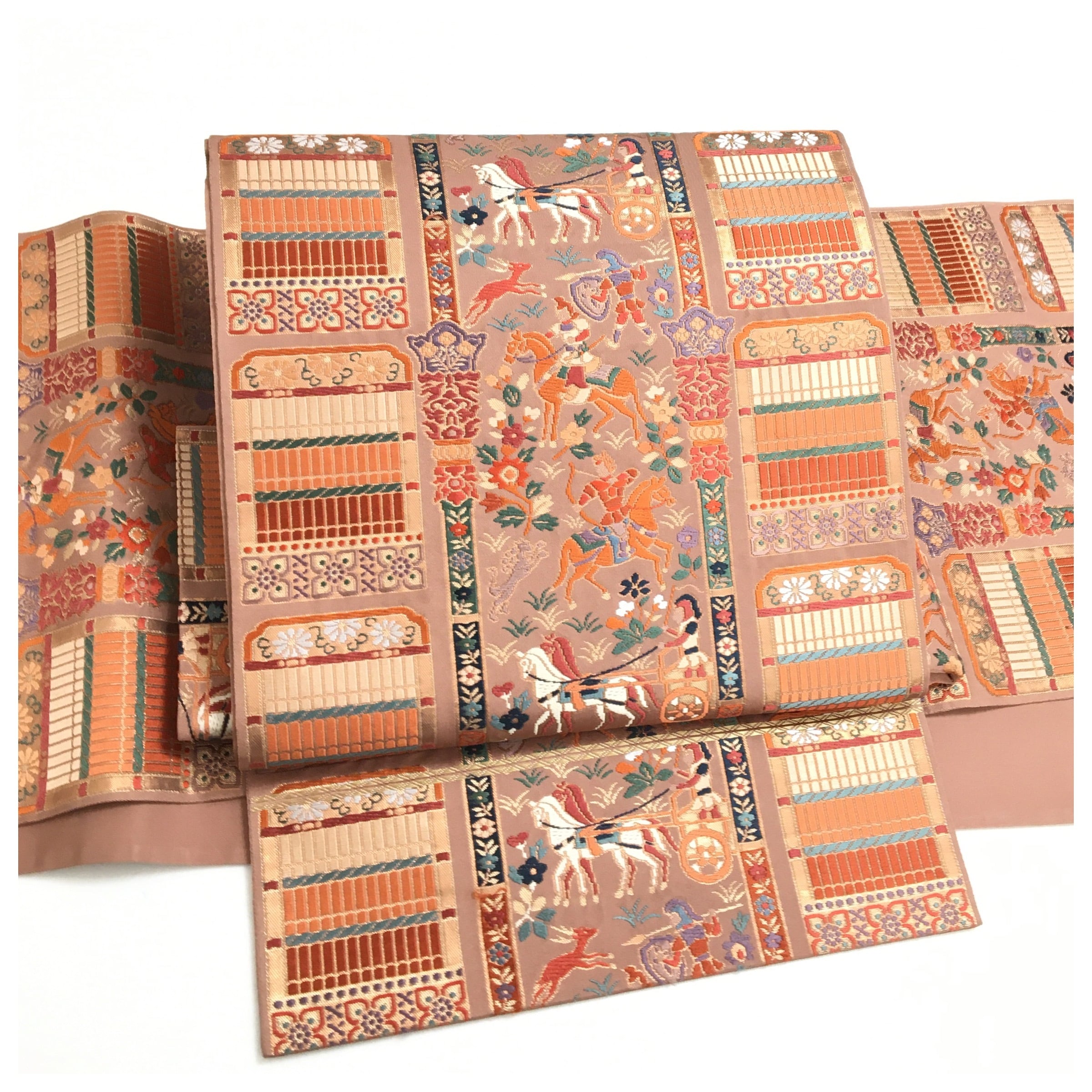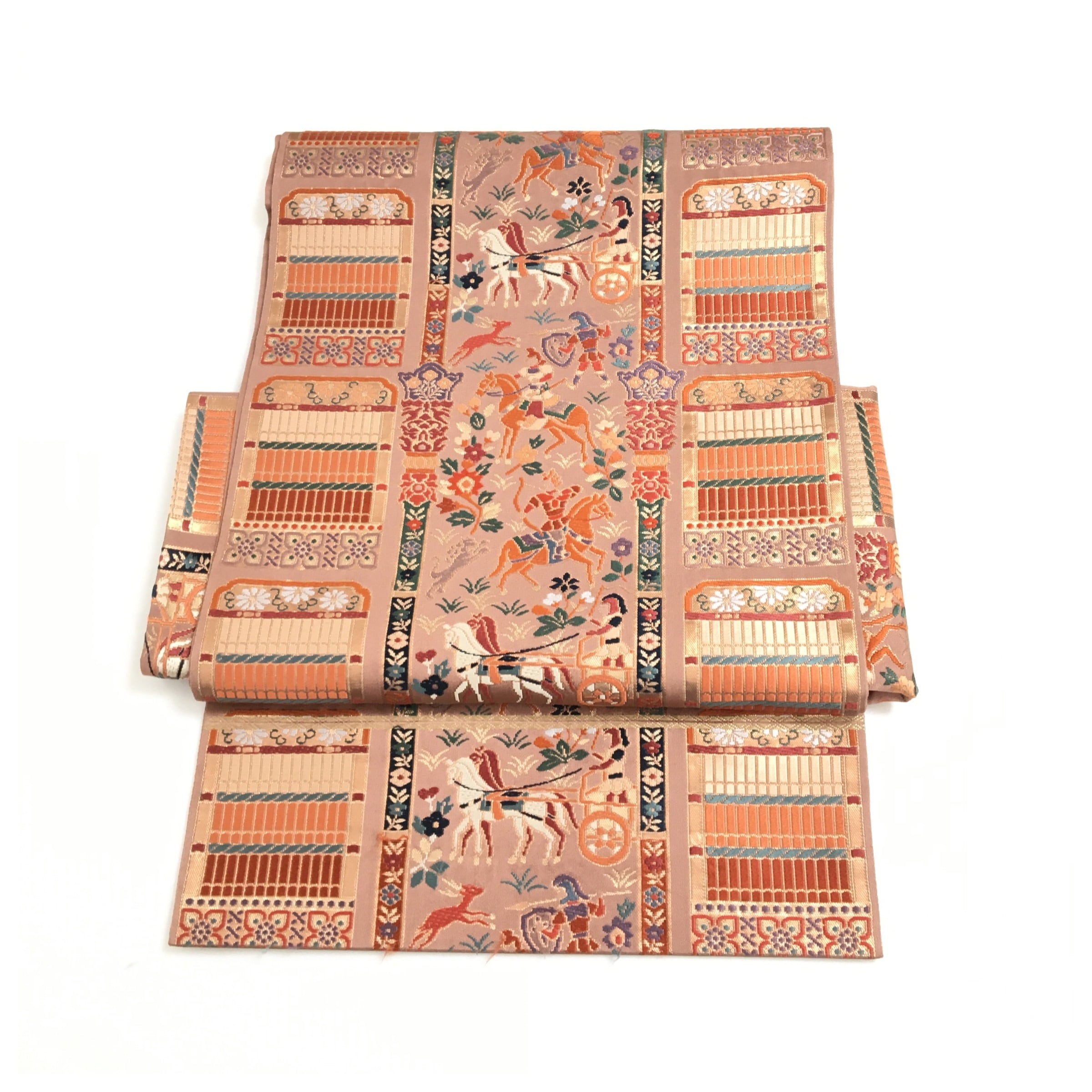 正絹 楽帯 袋帯 薄い茶 人物柄 二重太鼓 作り帯 です。