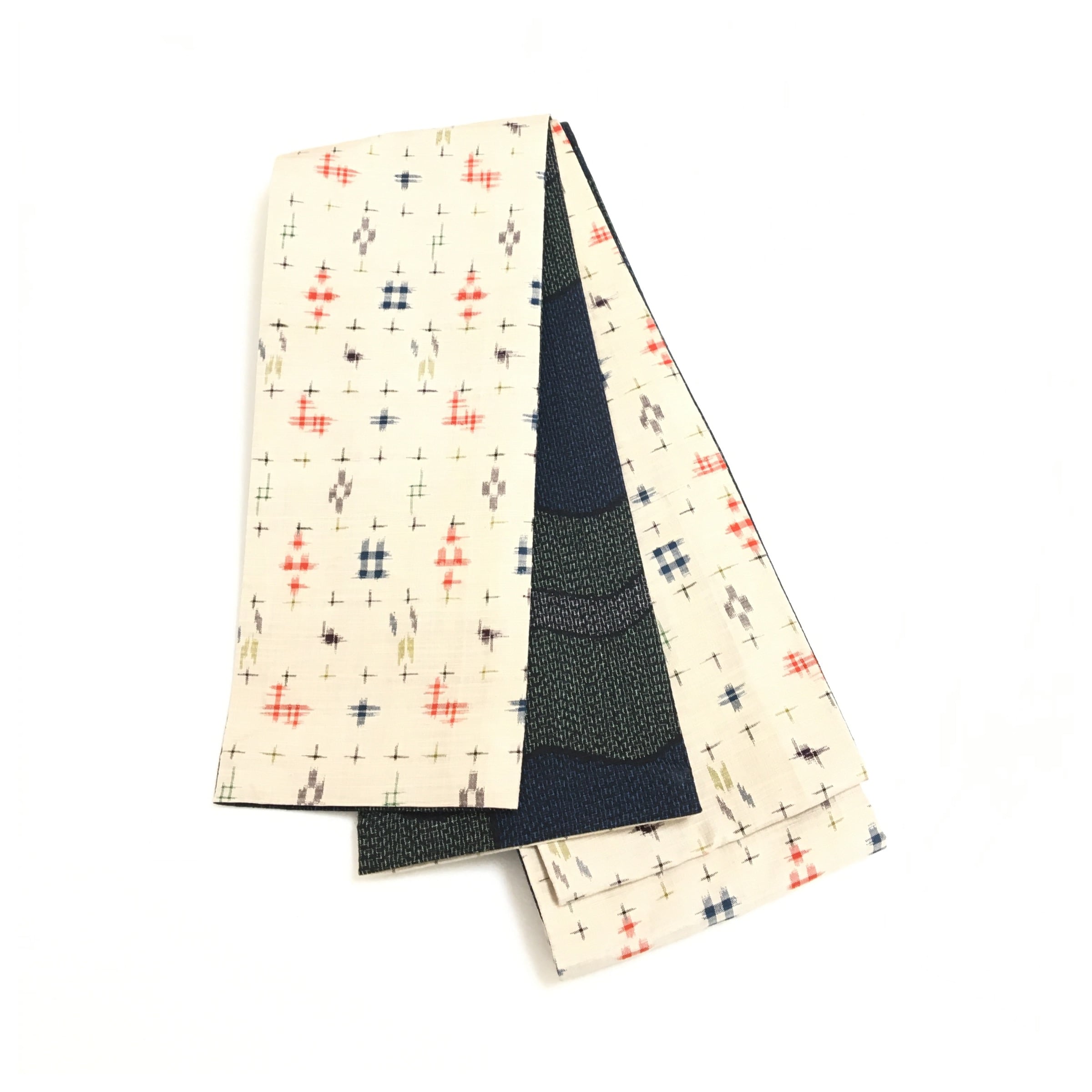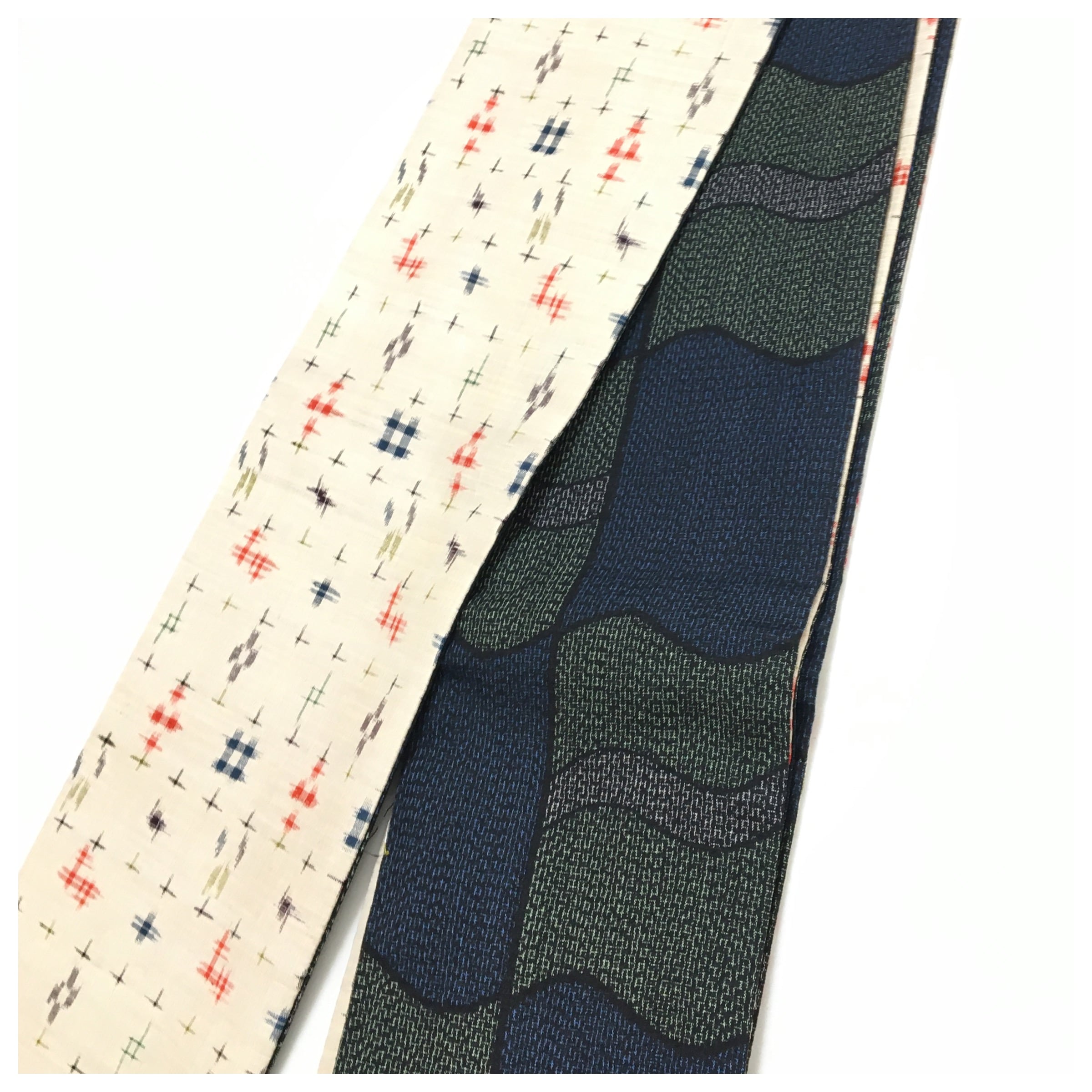 正絹 半幅帯 紬 生成りxグリーン 両面違い 長さ465