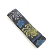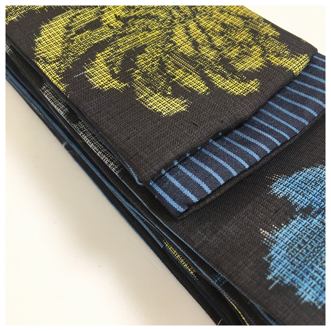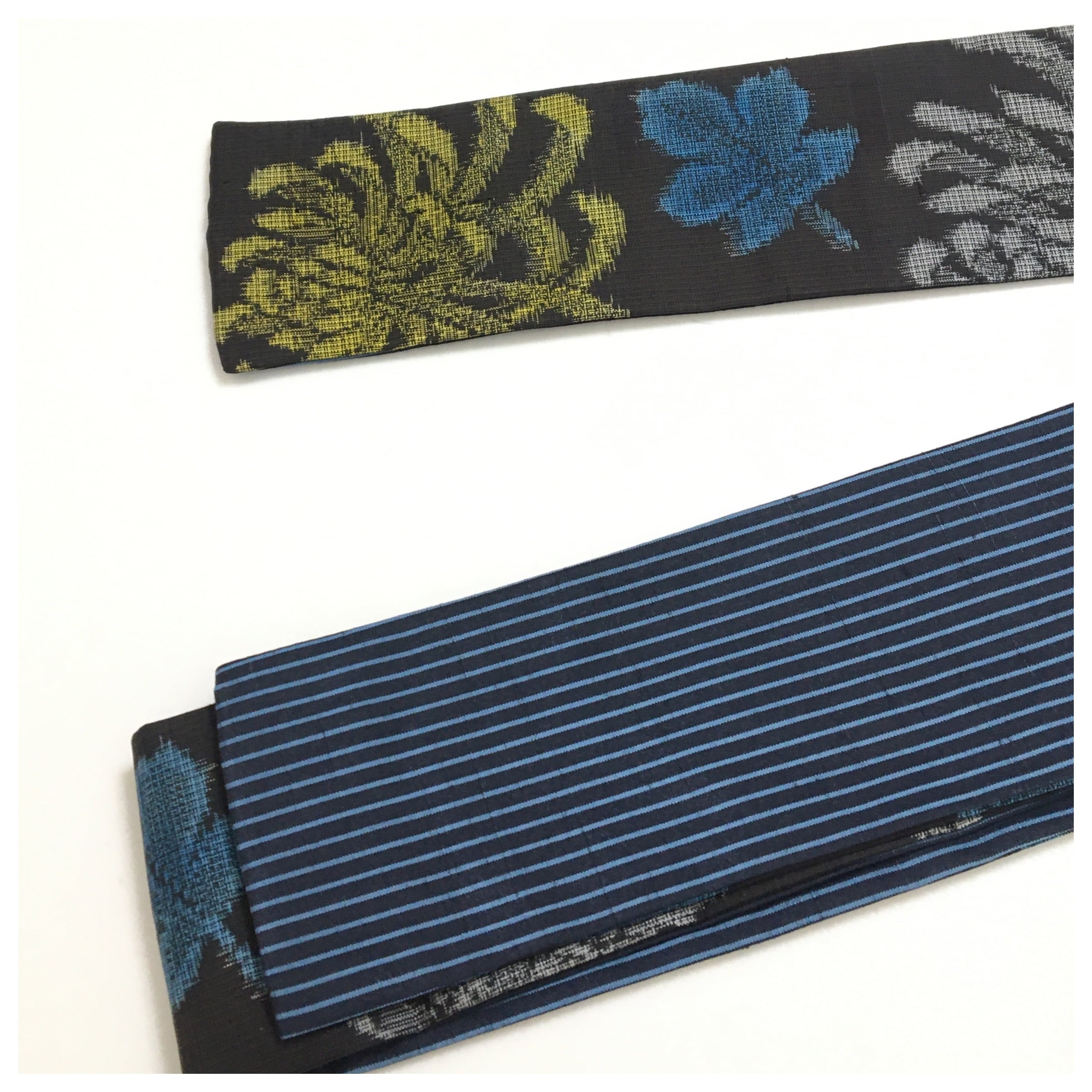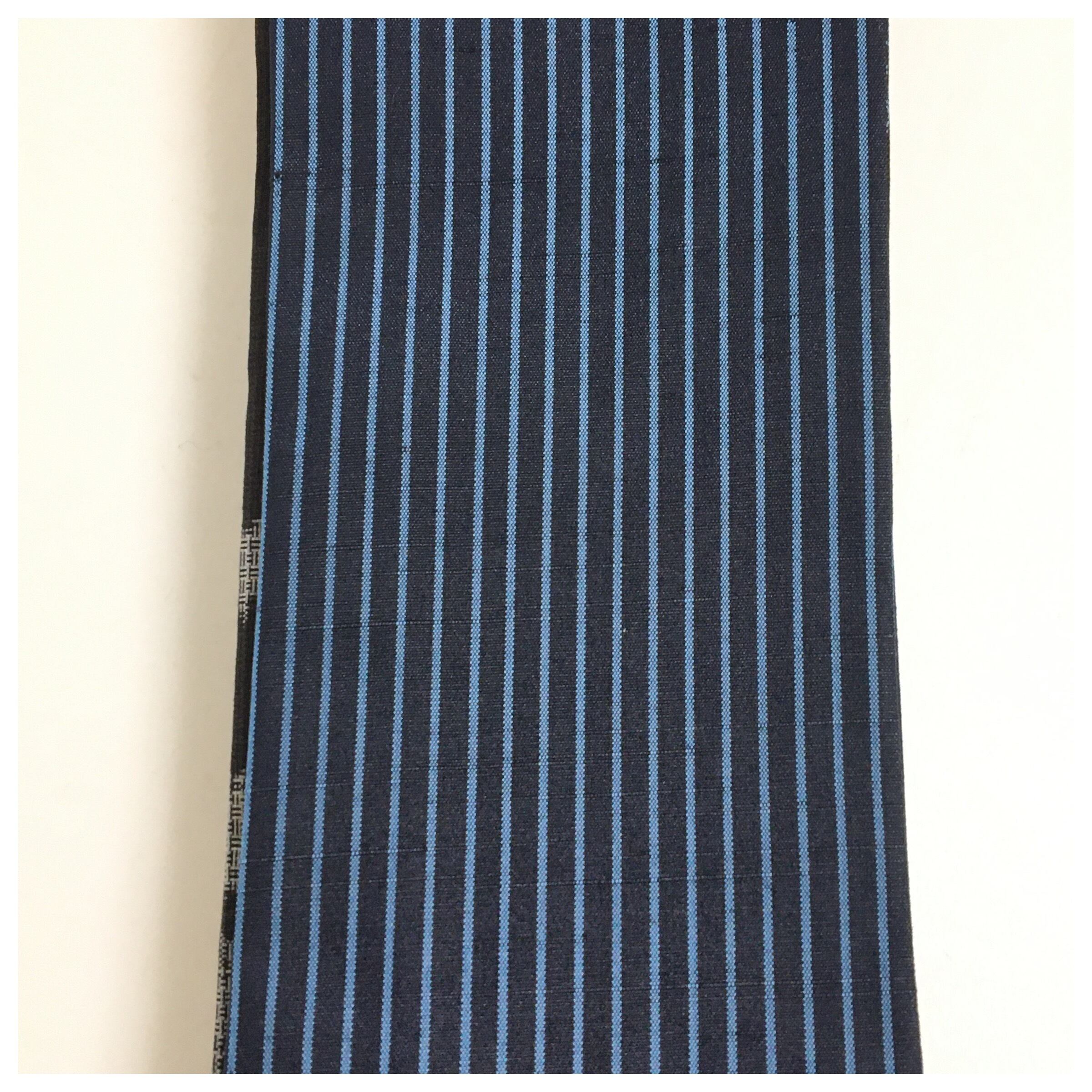 紺地に縞の紬で仕上げた手に馴染む帯地です。