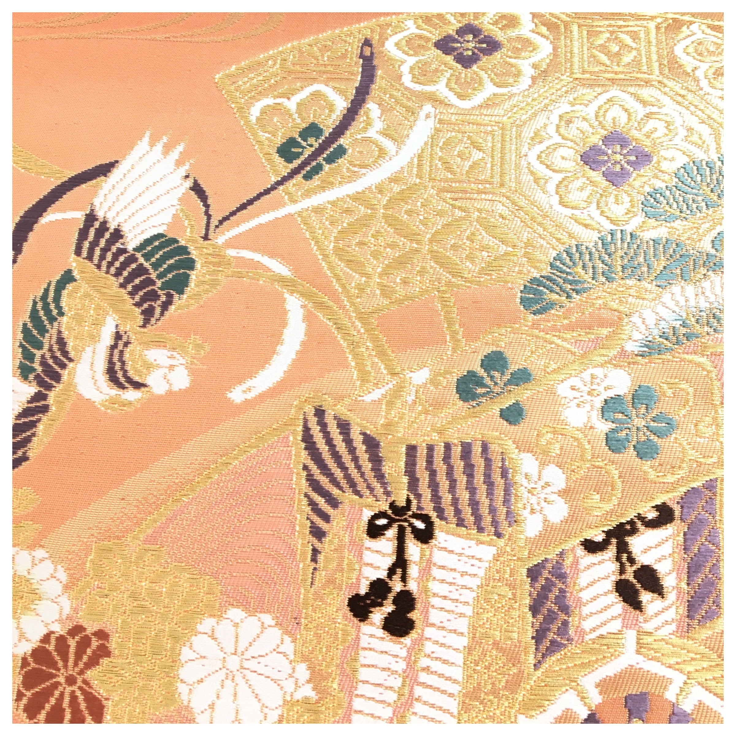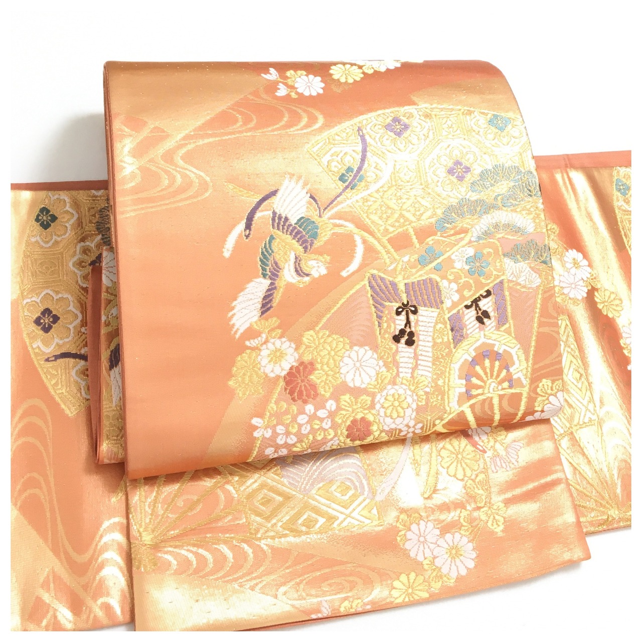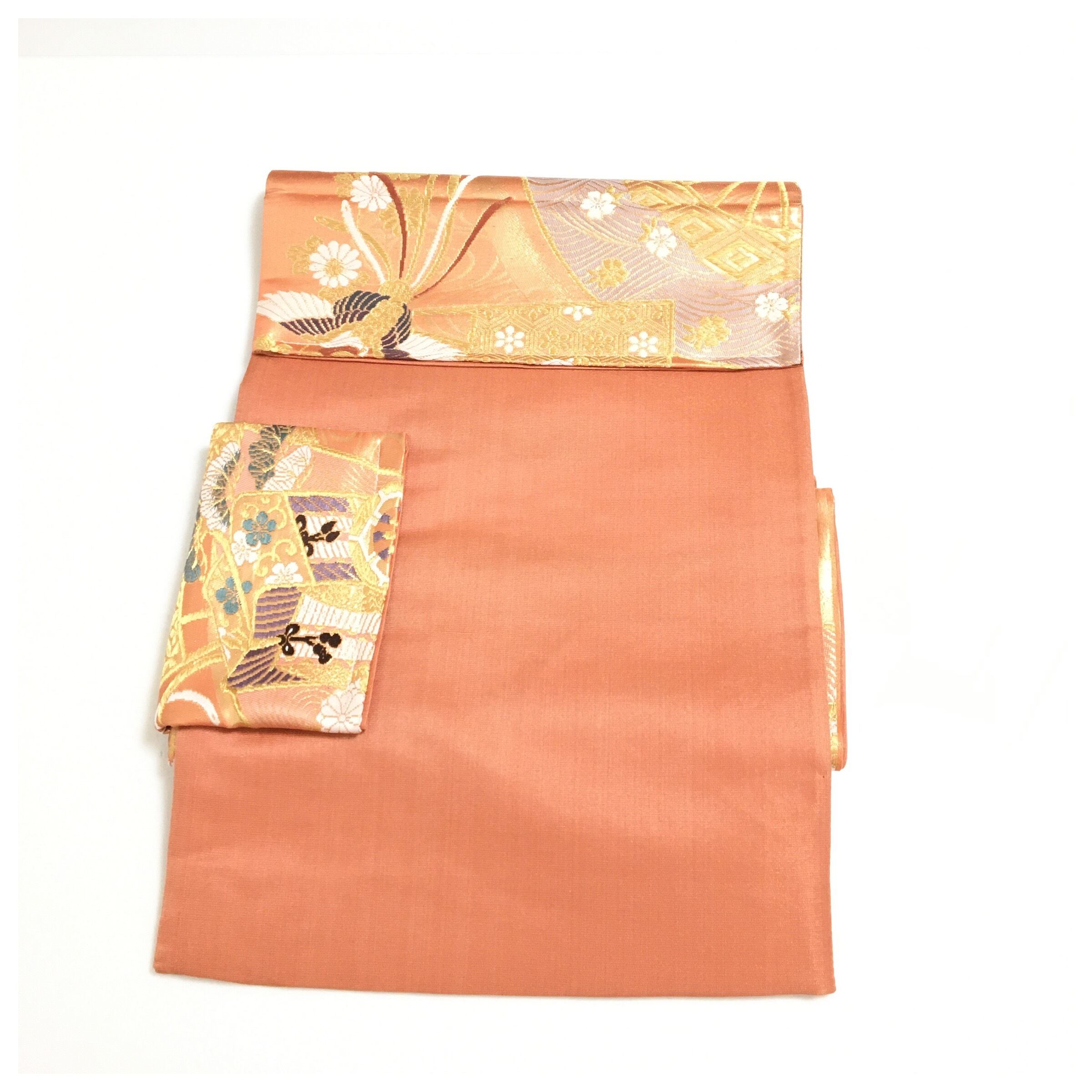 正絹 楽帯 袋帯 華喰い鳥 薄いオレンジ 二部式 二重太鼓 作り帯 です。