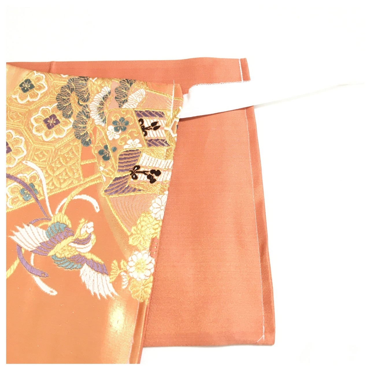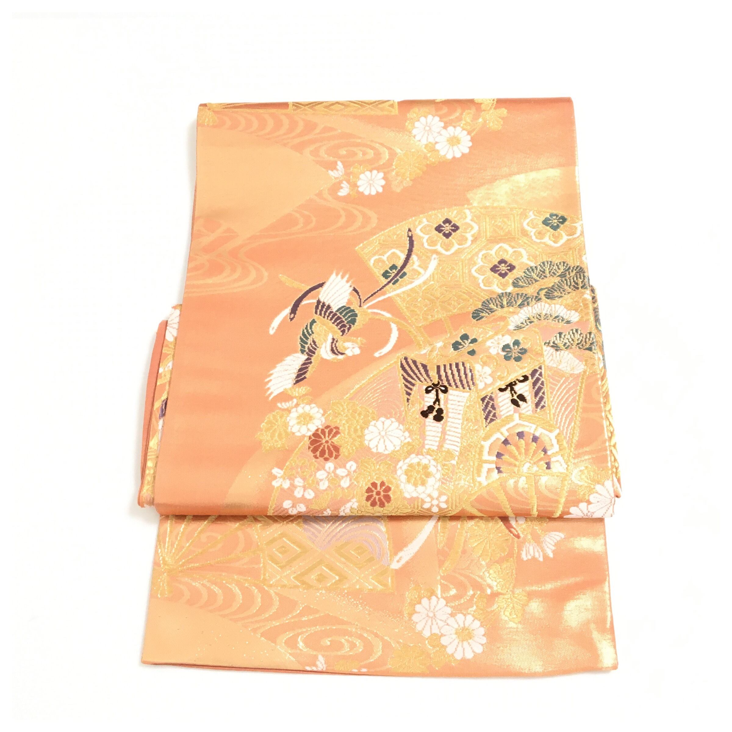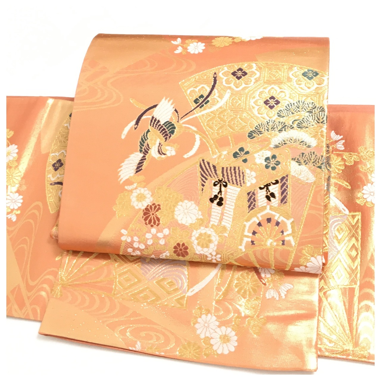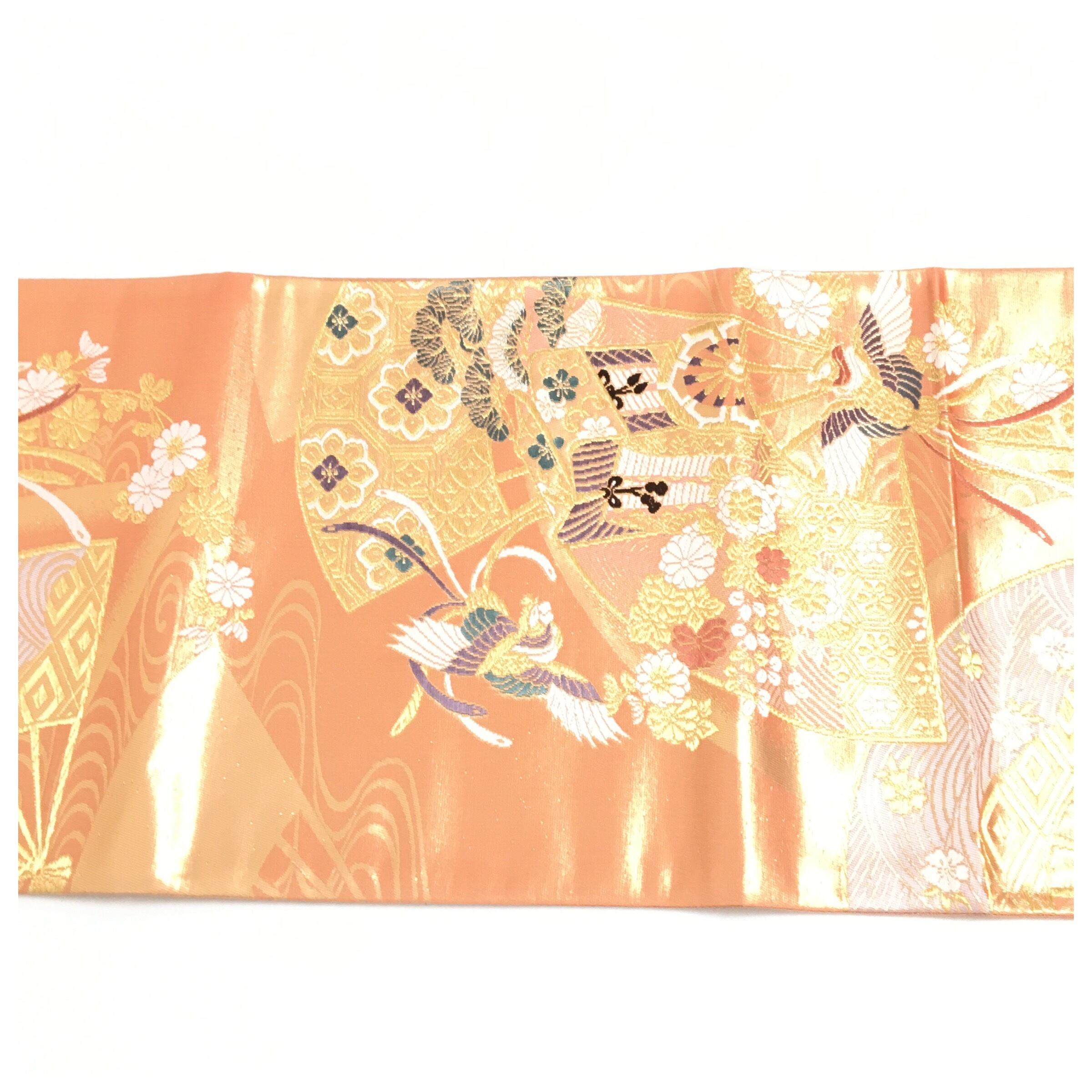 正絹 楽帯 袋帯 華喰い鳥 薄いオレンジ 二部式 二重太鼓 作り帯 です。