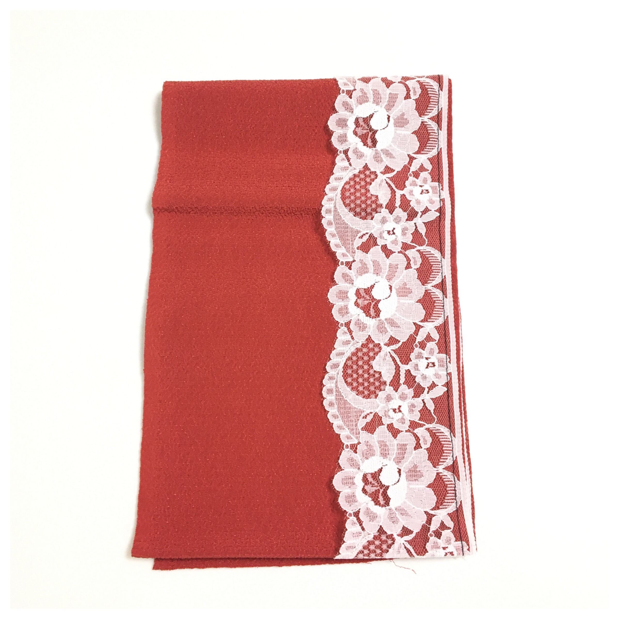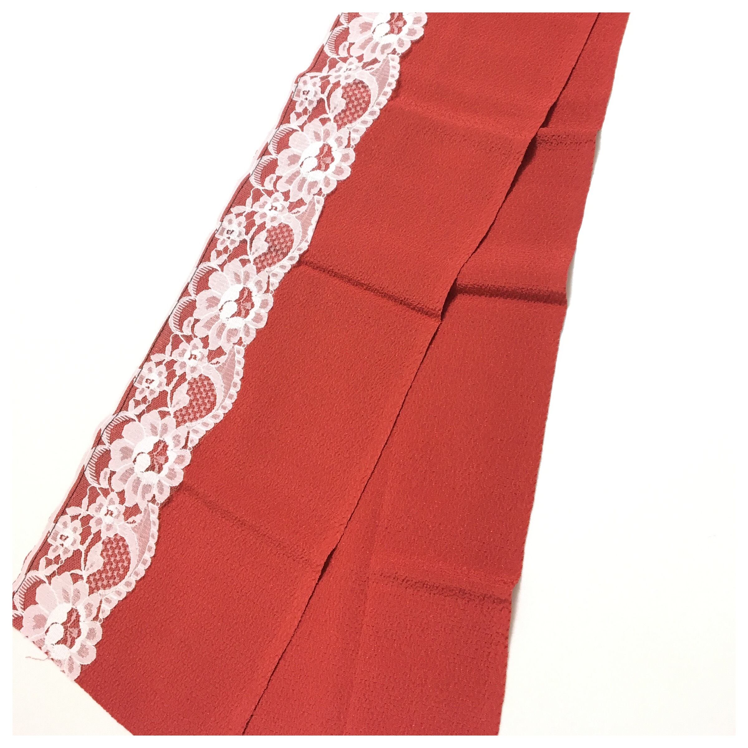 赤の色無地の化繊の半襟にレースを施した半襟になります。