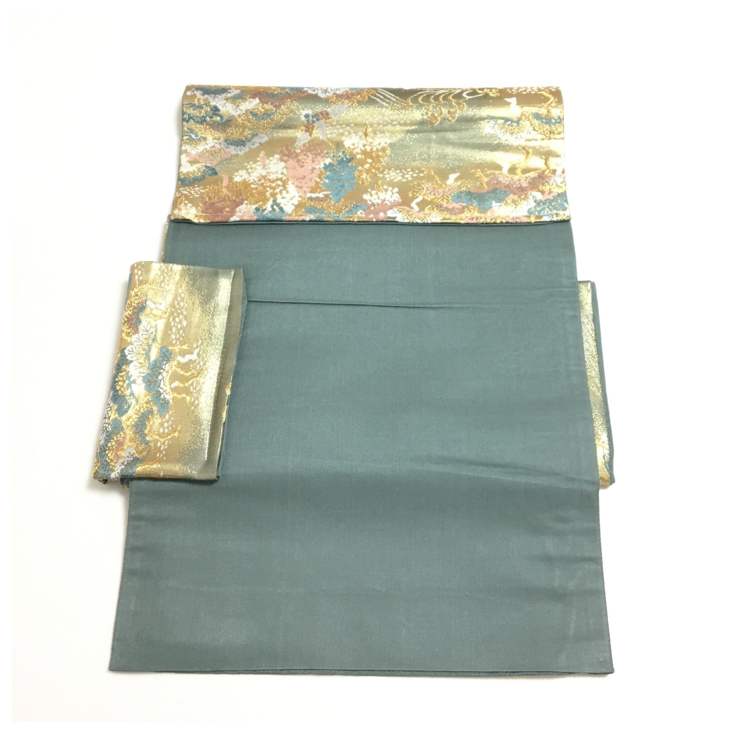 正絹 楽帯 袋帯 グリーン 金彩 二部式 二重太鼓 作り帯 です。