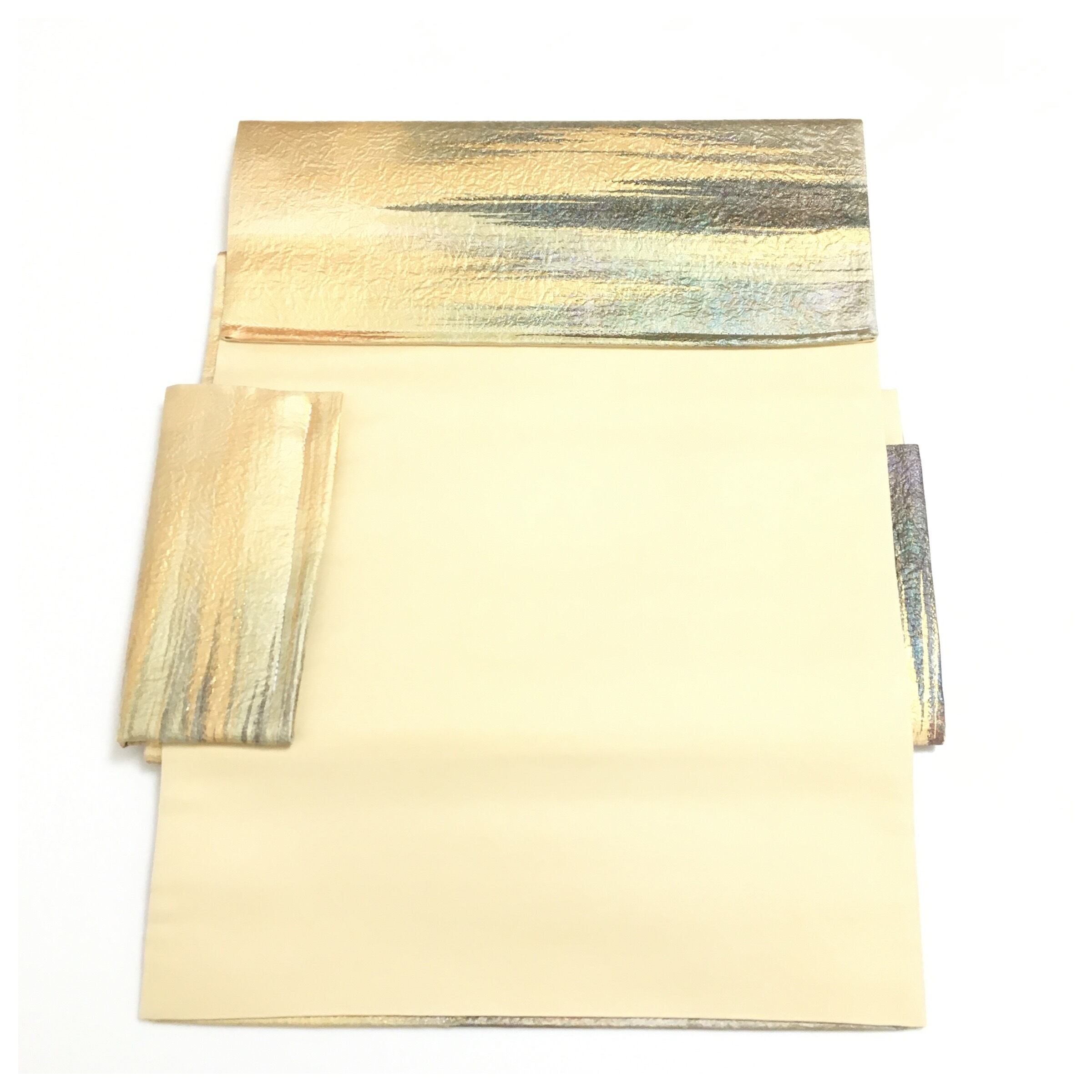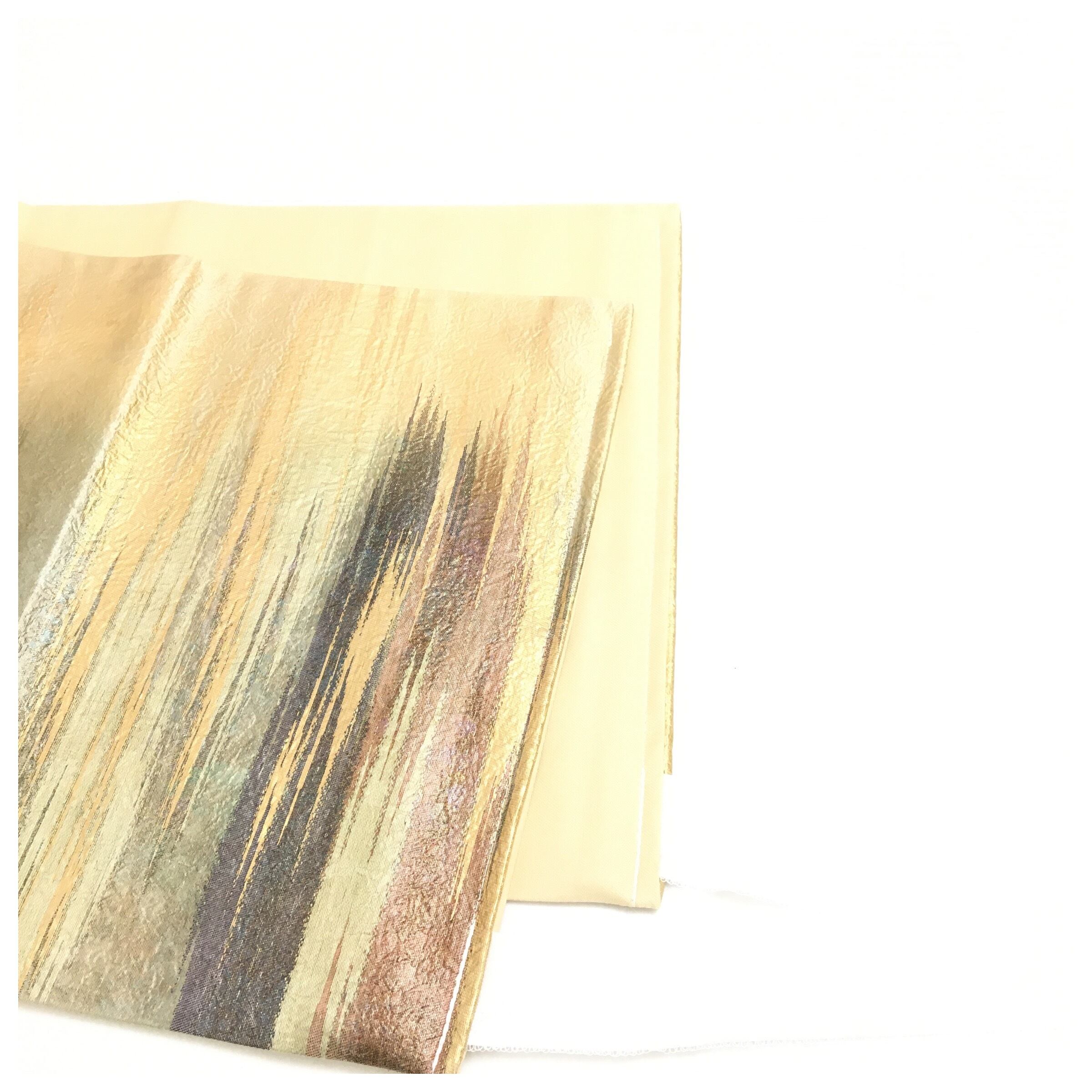 美品 正絹 楽帯 高級呉服 袋帯 ベージュクリーム 二部式 二重太鼓 作り帯 です。