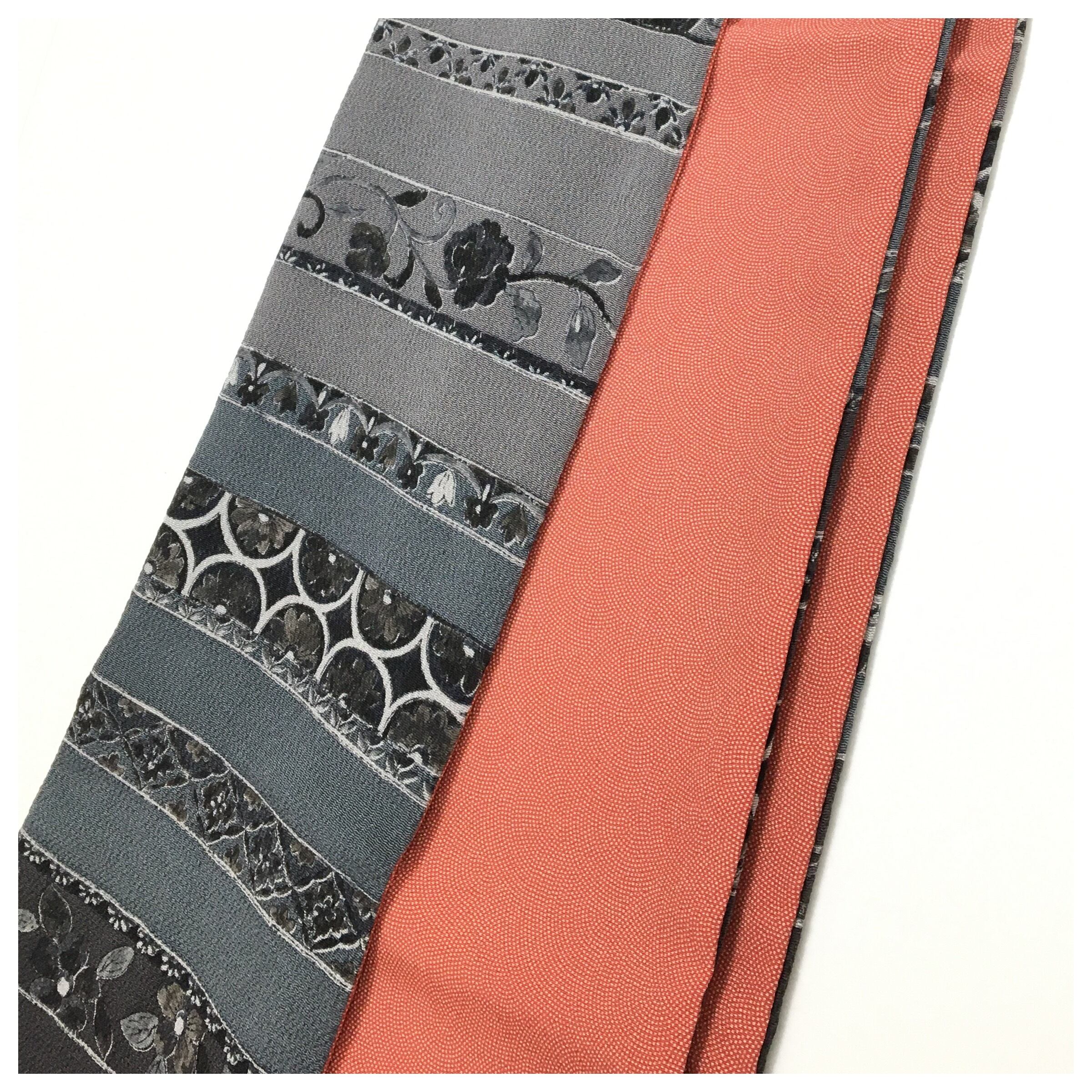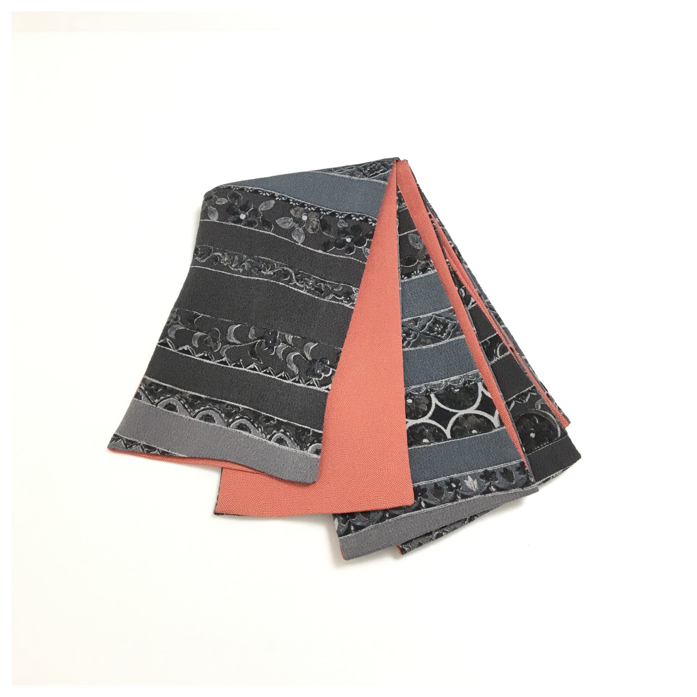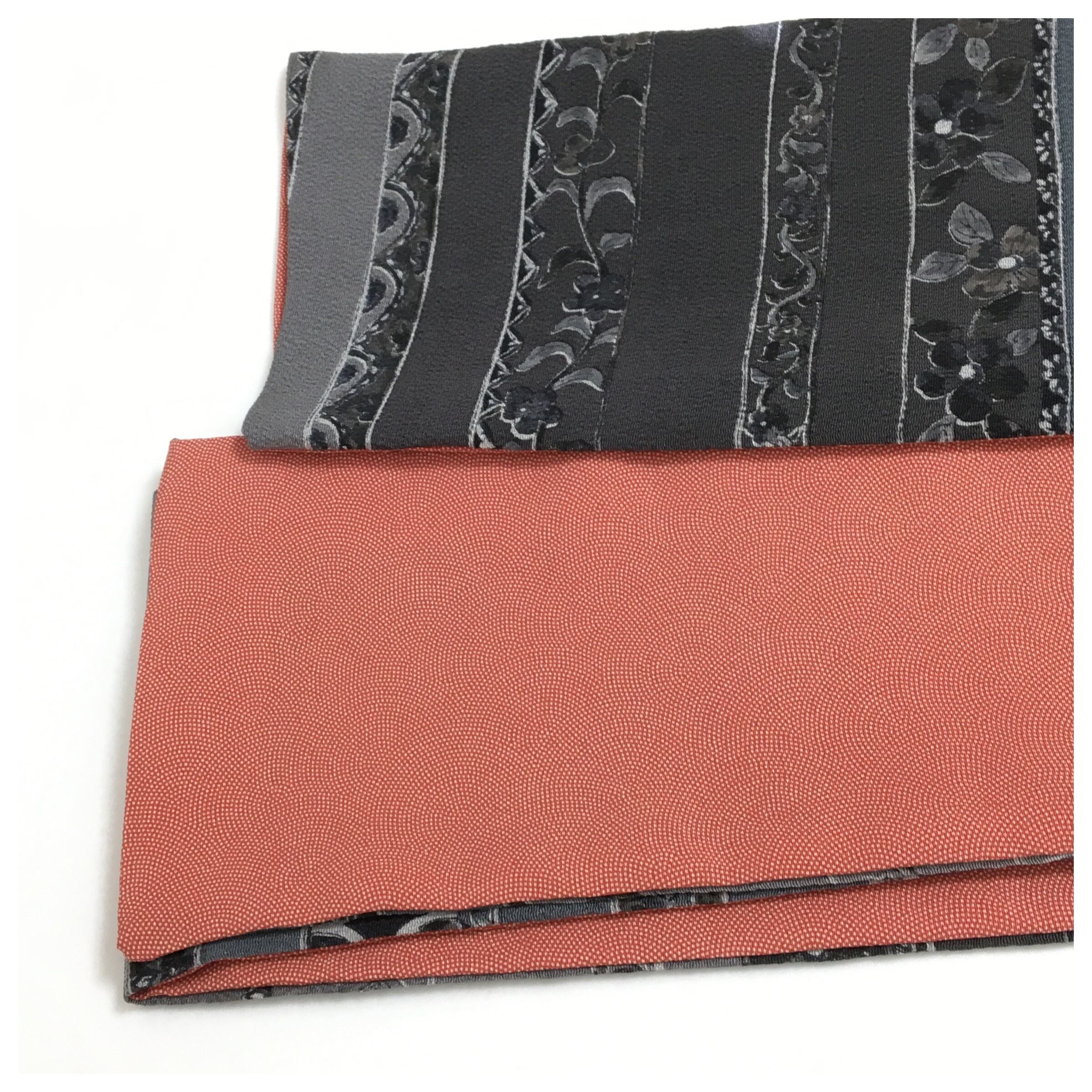美品 正絹 兵児帯 墨黒x赤 両面違い柄 長尺440 幅14 中古品です。