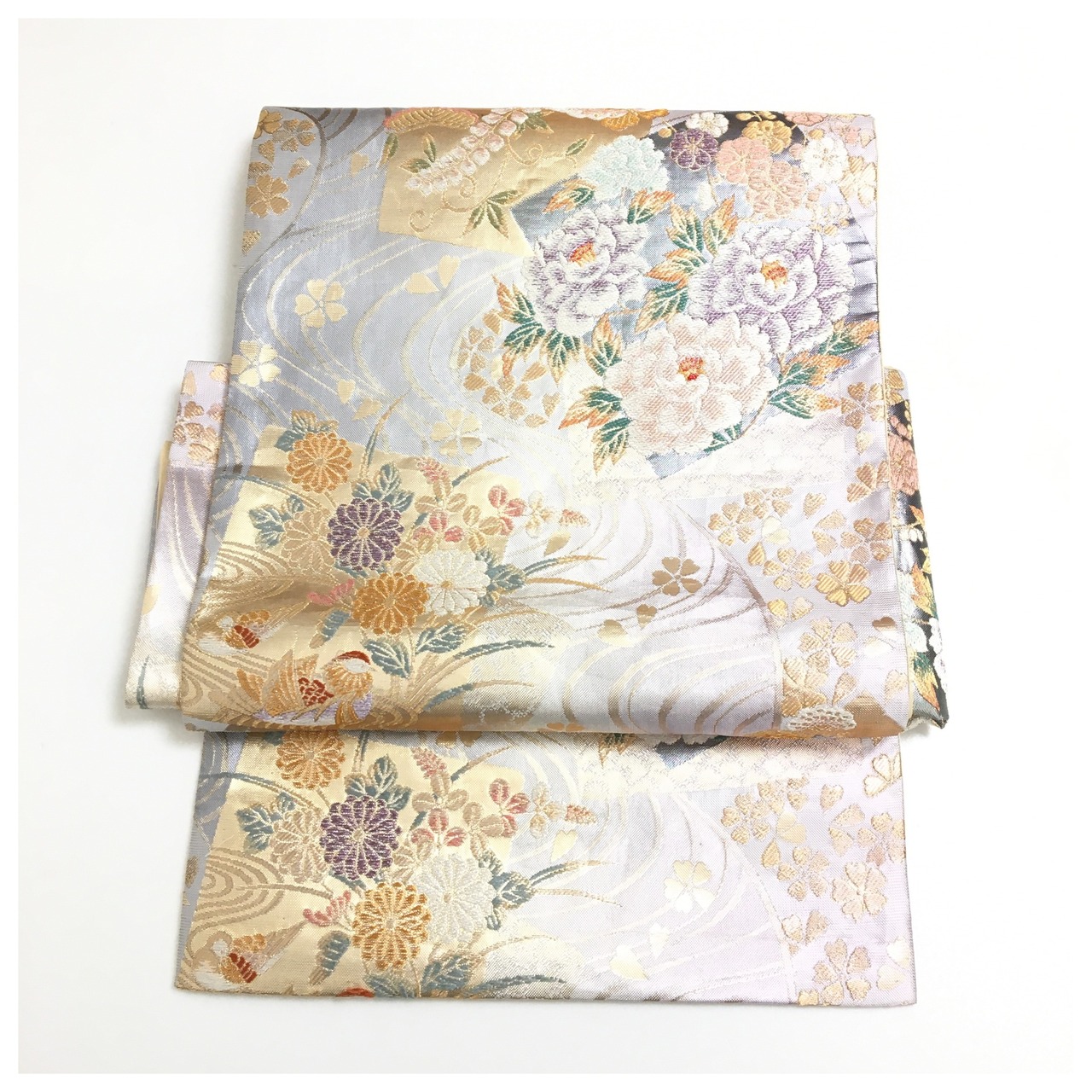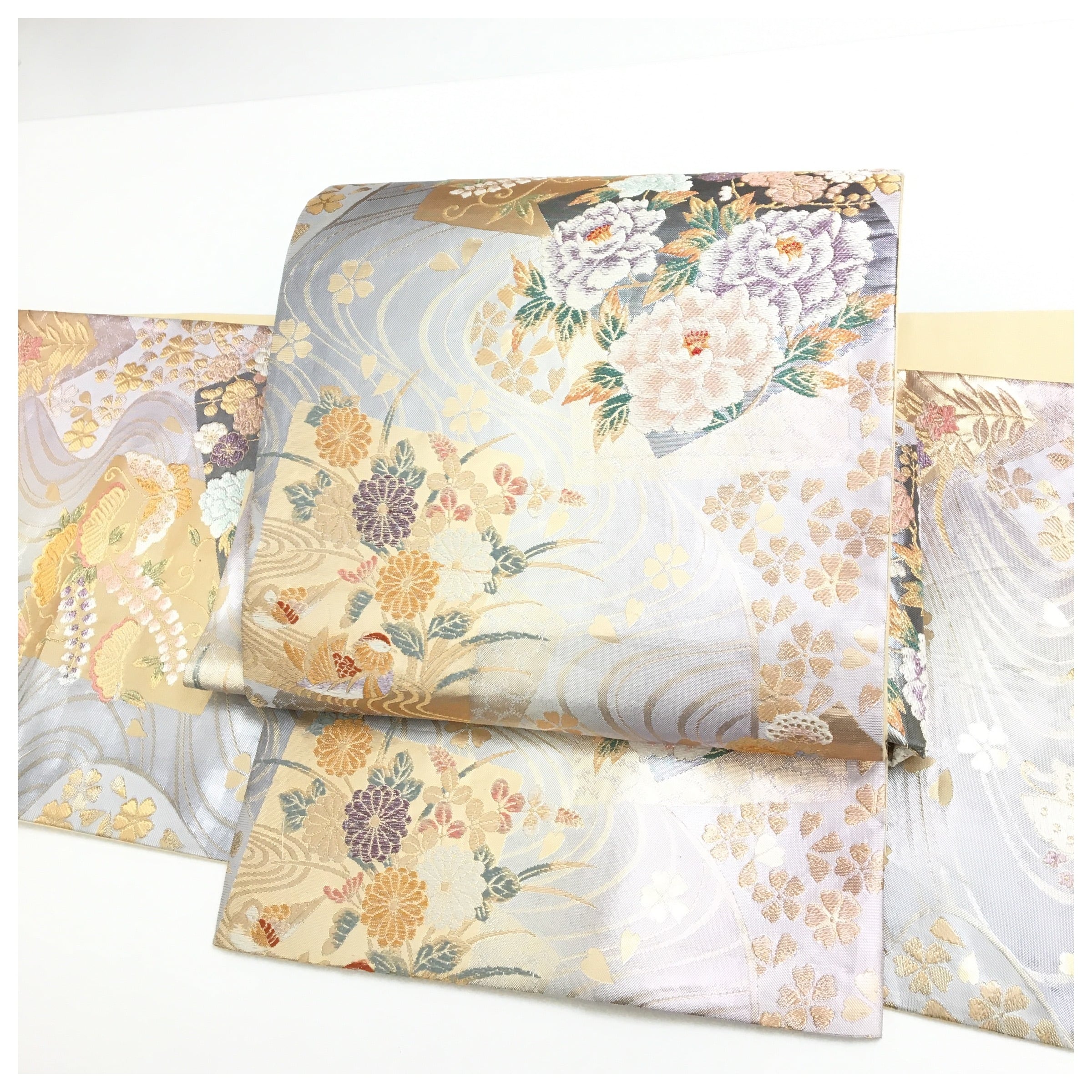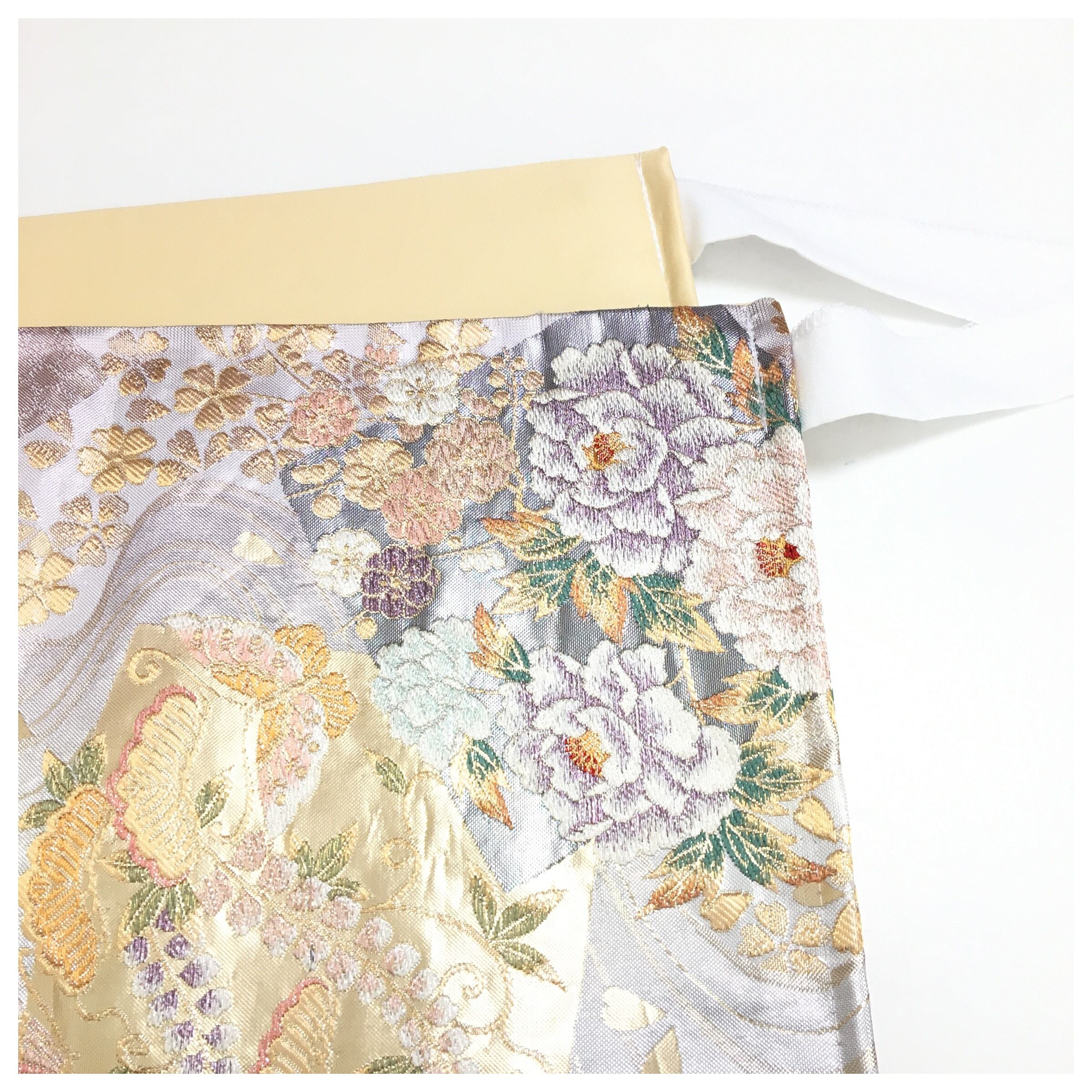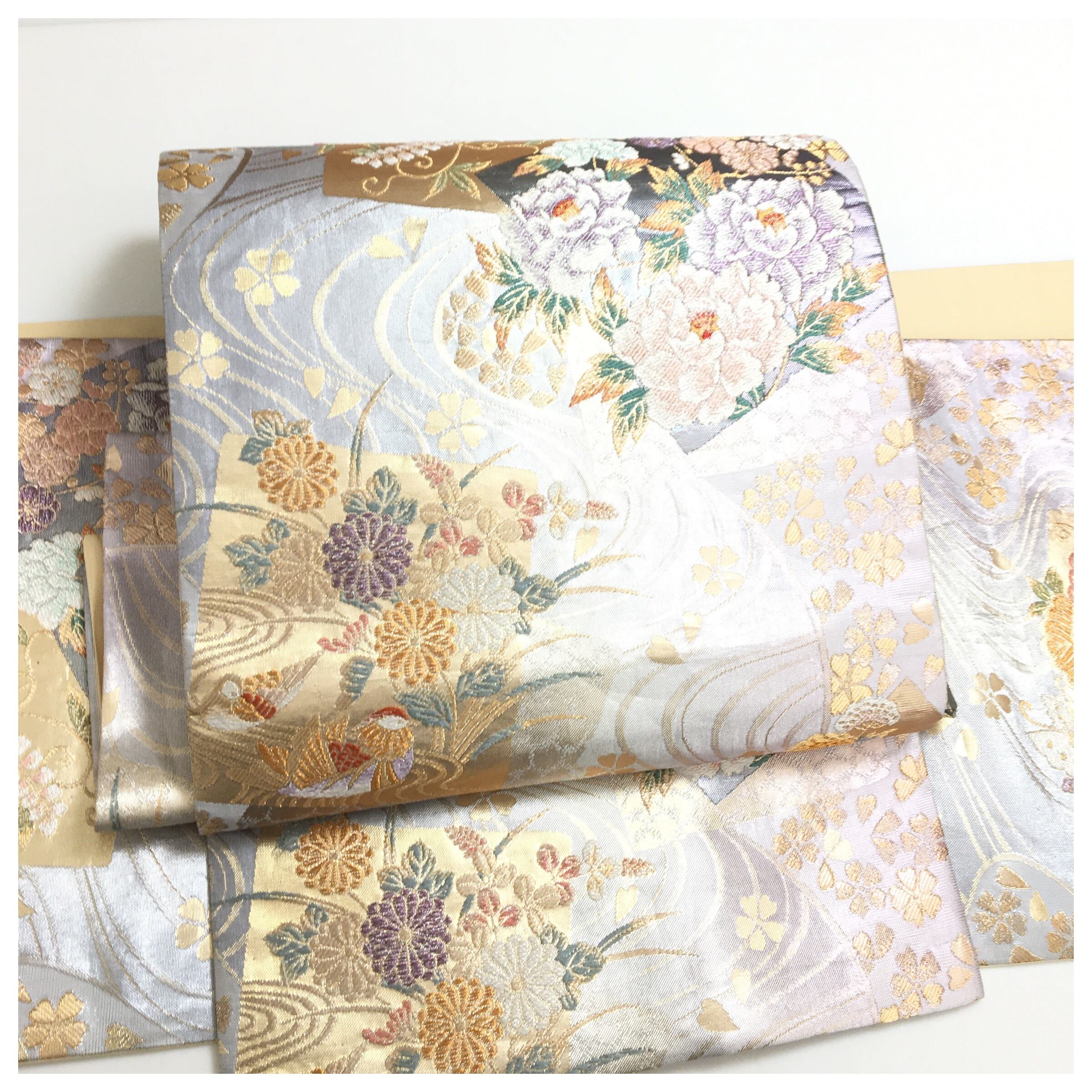 正絹 楽帯 袋帯 シルバー グラデーション 花柄 二部式 二重太鼓 作り帯 です。