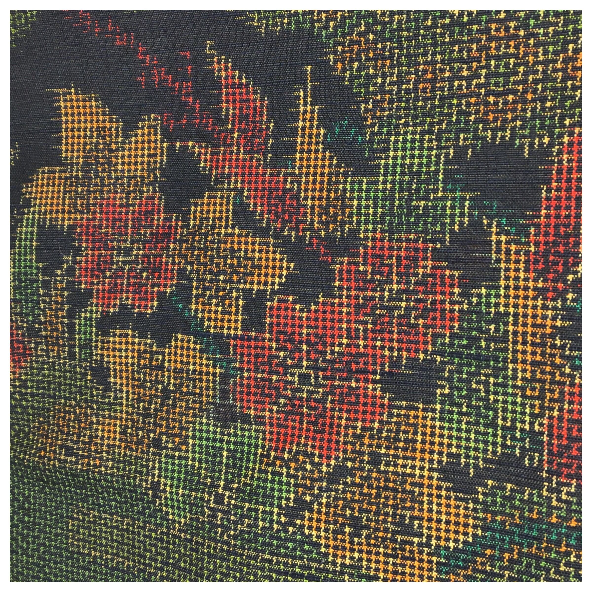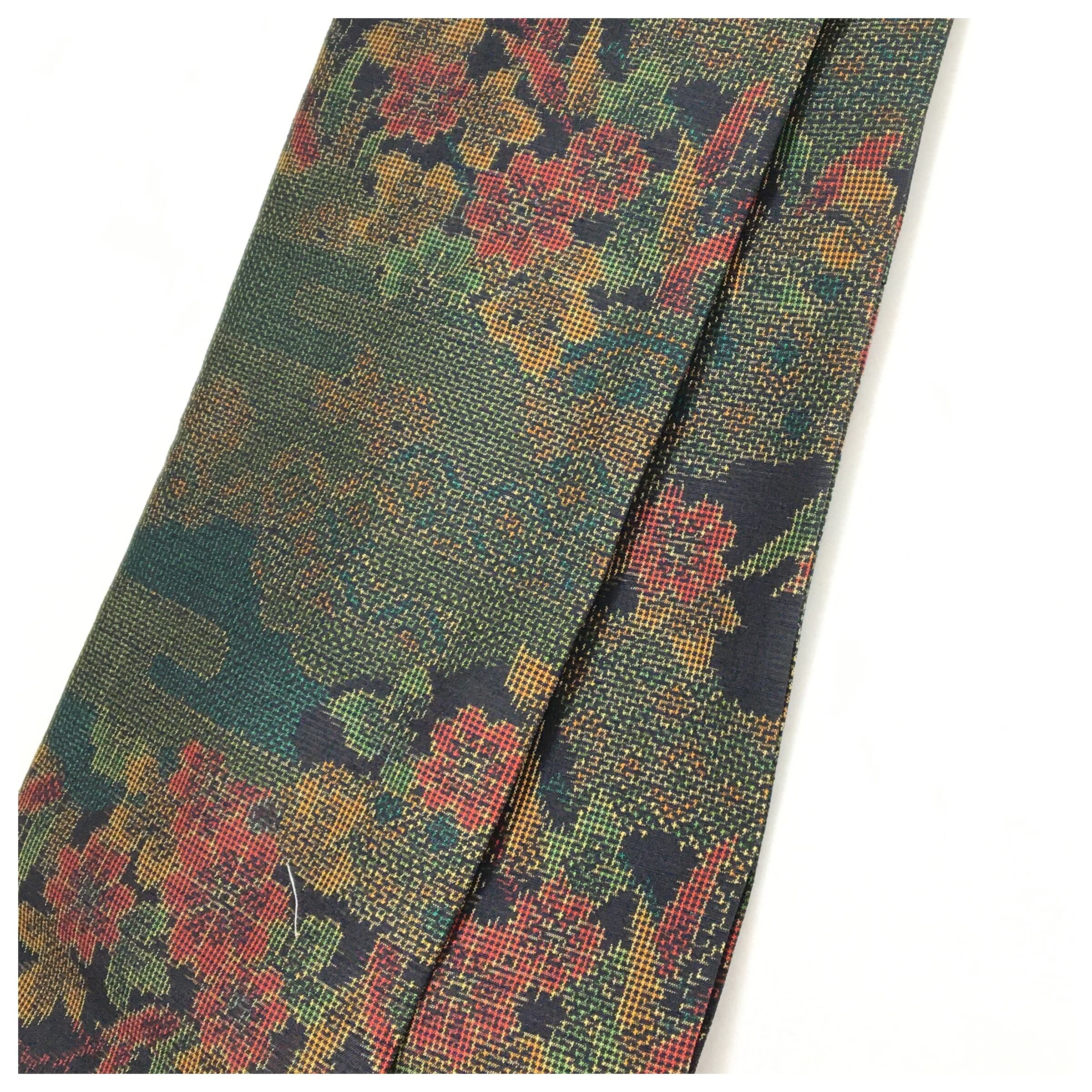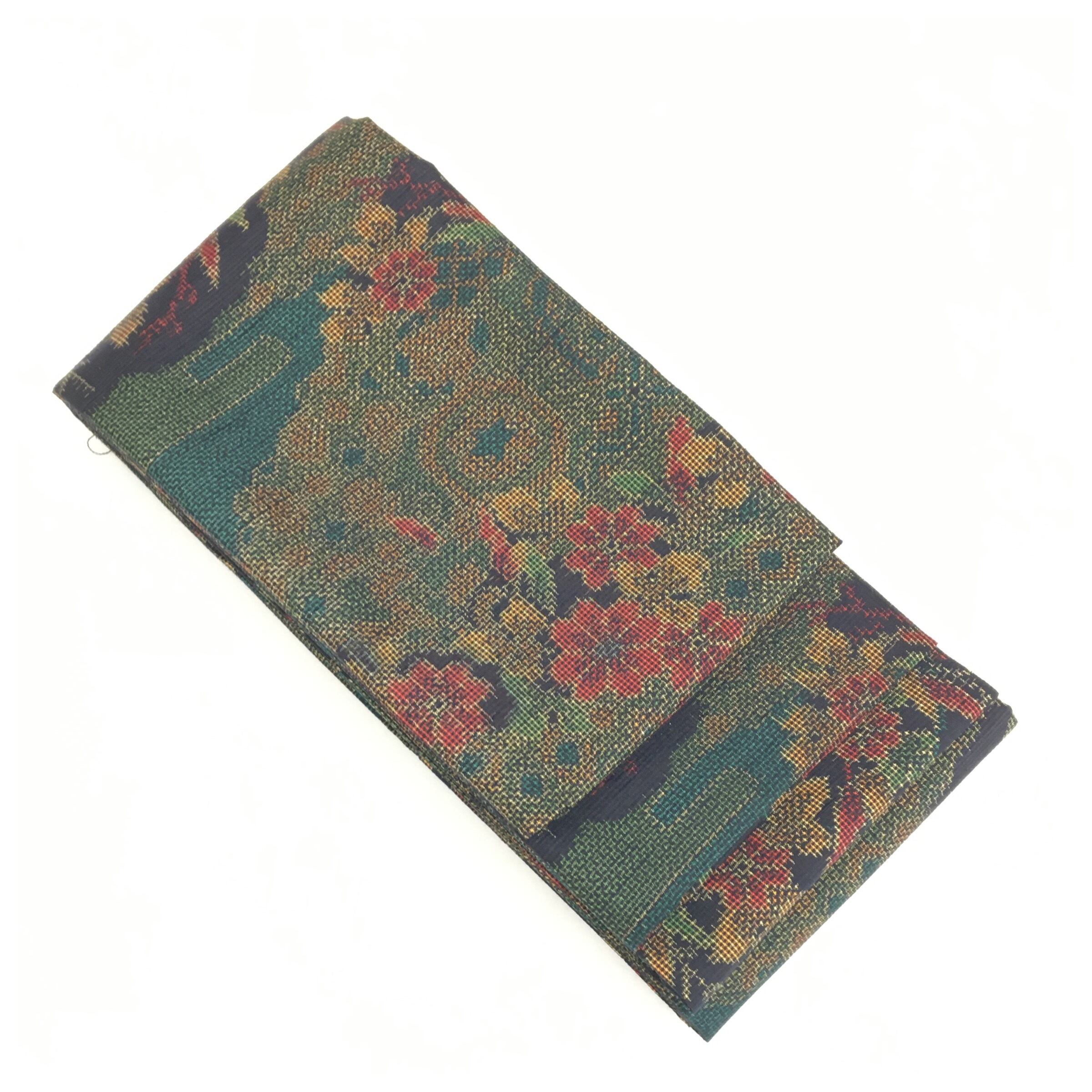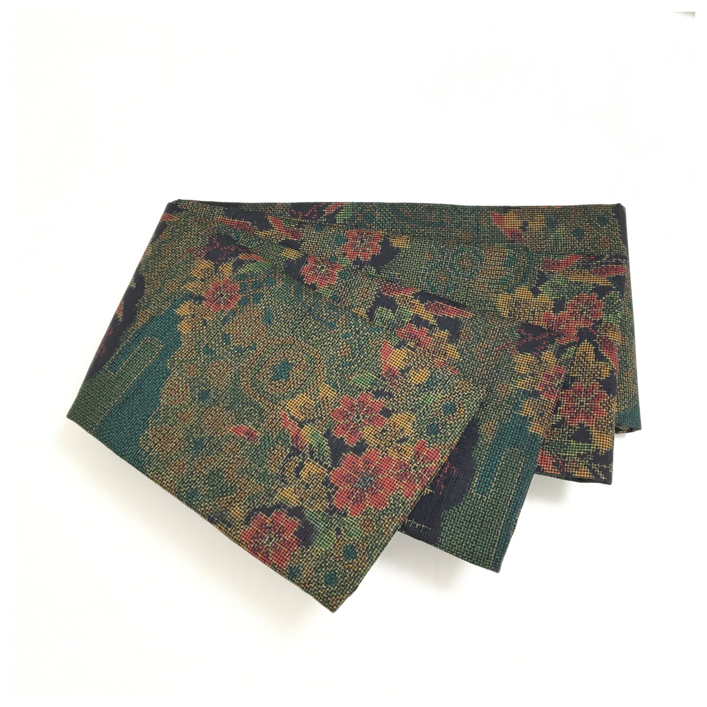 美品 正絹 半幅帯 グリーン 花柄 紬 個性派 長尺408 巾16.5 です。